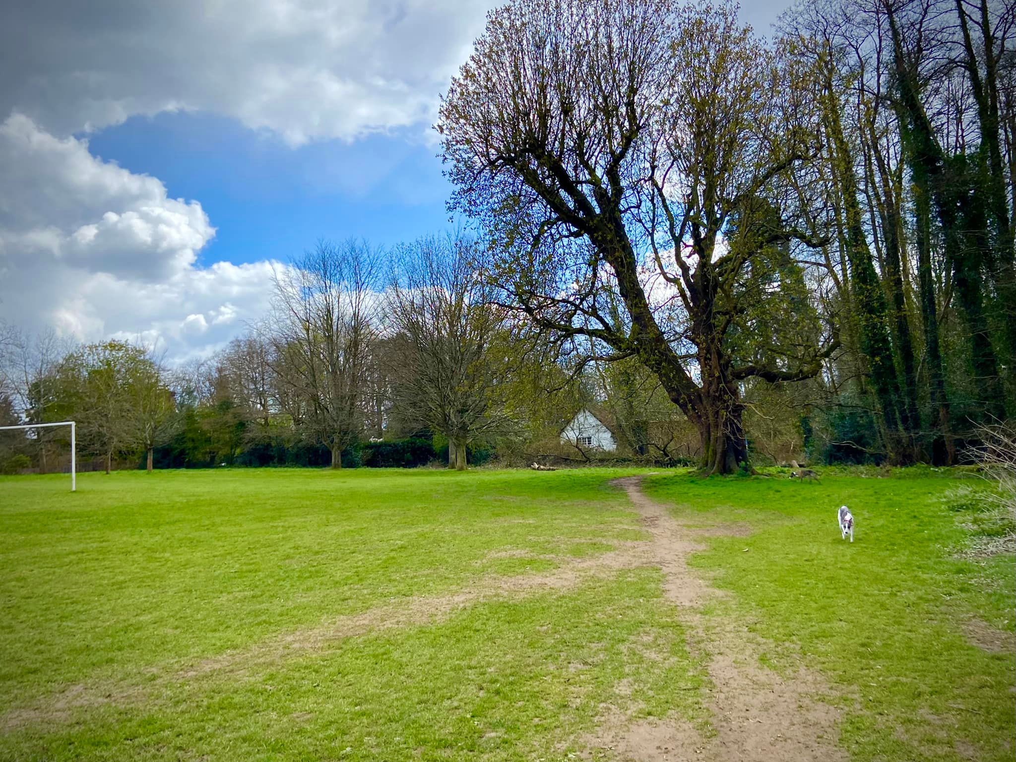 Pass through the water meadow and over the plank bridge, then keep straight on and through the double gate, passing another information board. Emerge from the trees and turn right to walk along the edge of the football pitches, which are on your left. As you pass the last goal and a large tree, the path bends off to the right and joins a tarmac path.