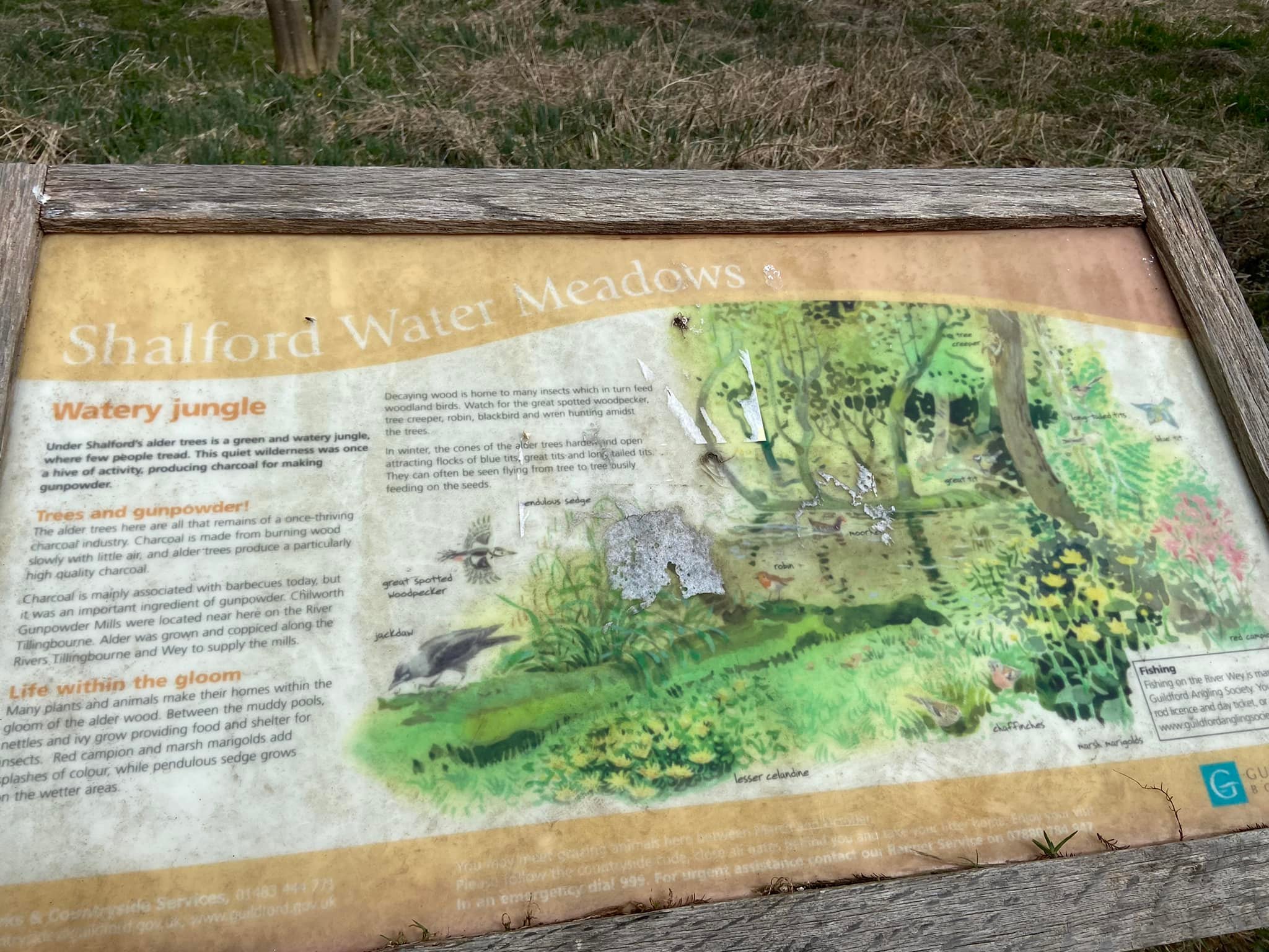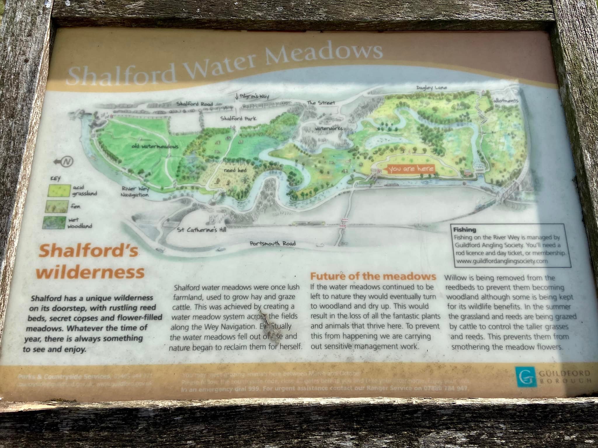 Shalford’s water meadows were once farmland used for growing hay and grazing cattle. They are a reminder of the area’s once “intensive” farming history (although clearly not intensive by today’s farming standards). In the Middle Ages, ditches and channels were created in natural riverside meadows and then deliberately flooded to turn them into water meadows, a practice imported from Europe. How very international.