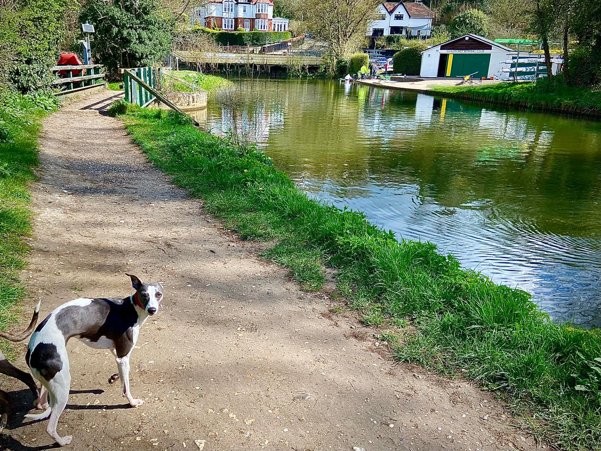 On the other bank, turn right and walk along the tow path. You stay on this for about a mile all the way down to Guildford Rowing Club. On your way, notice that you pass under a bridge, just after which there is a little stream trickling down from the left.