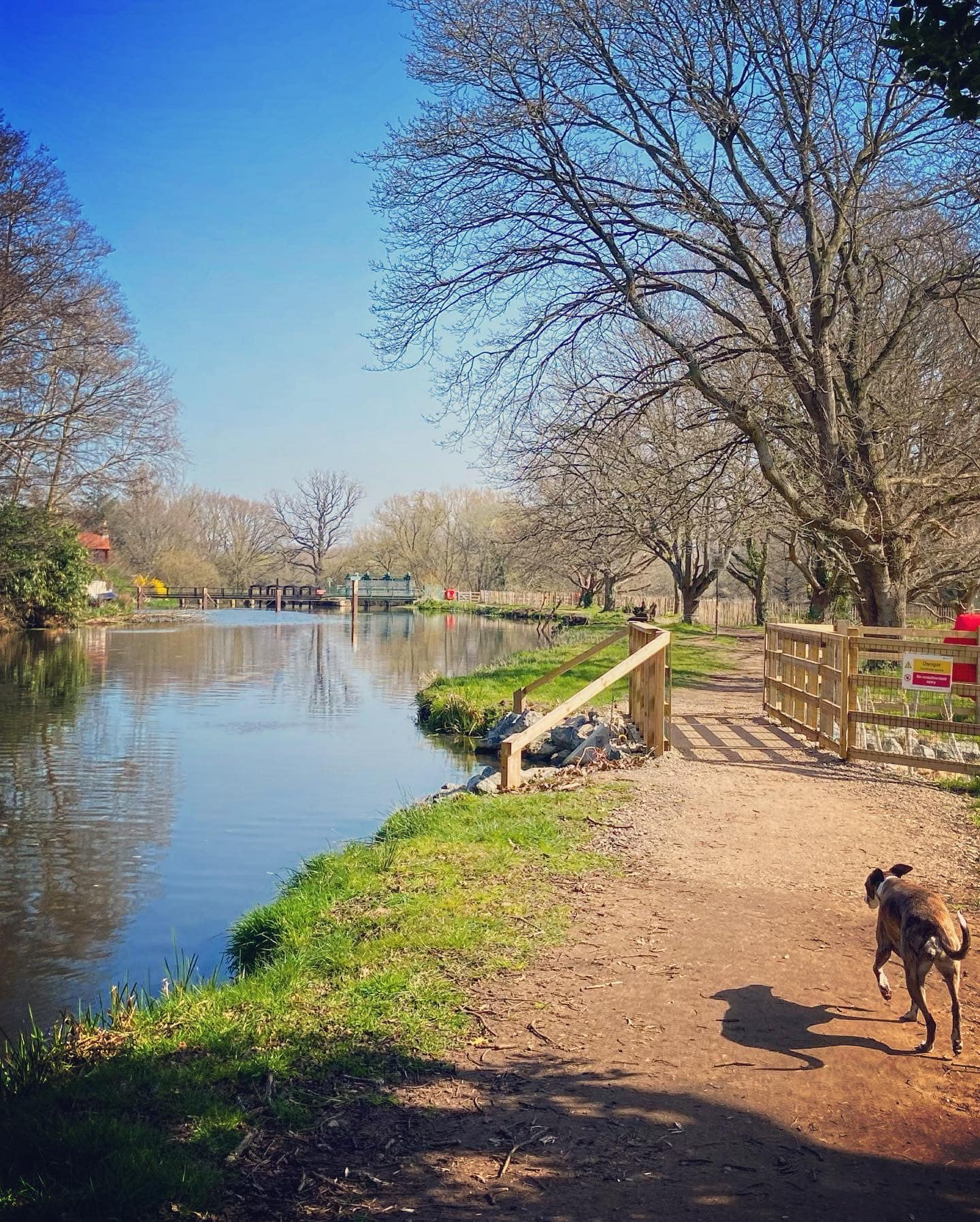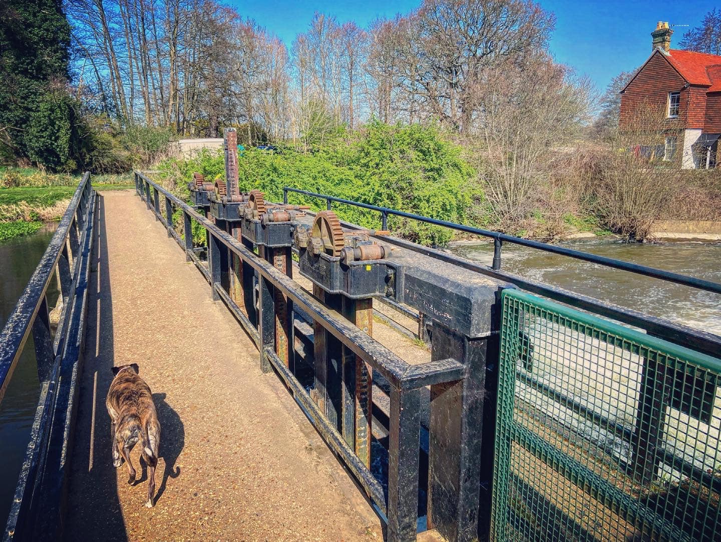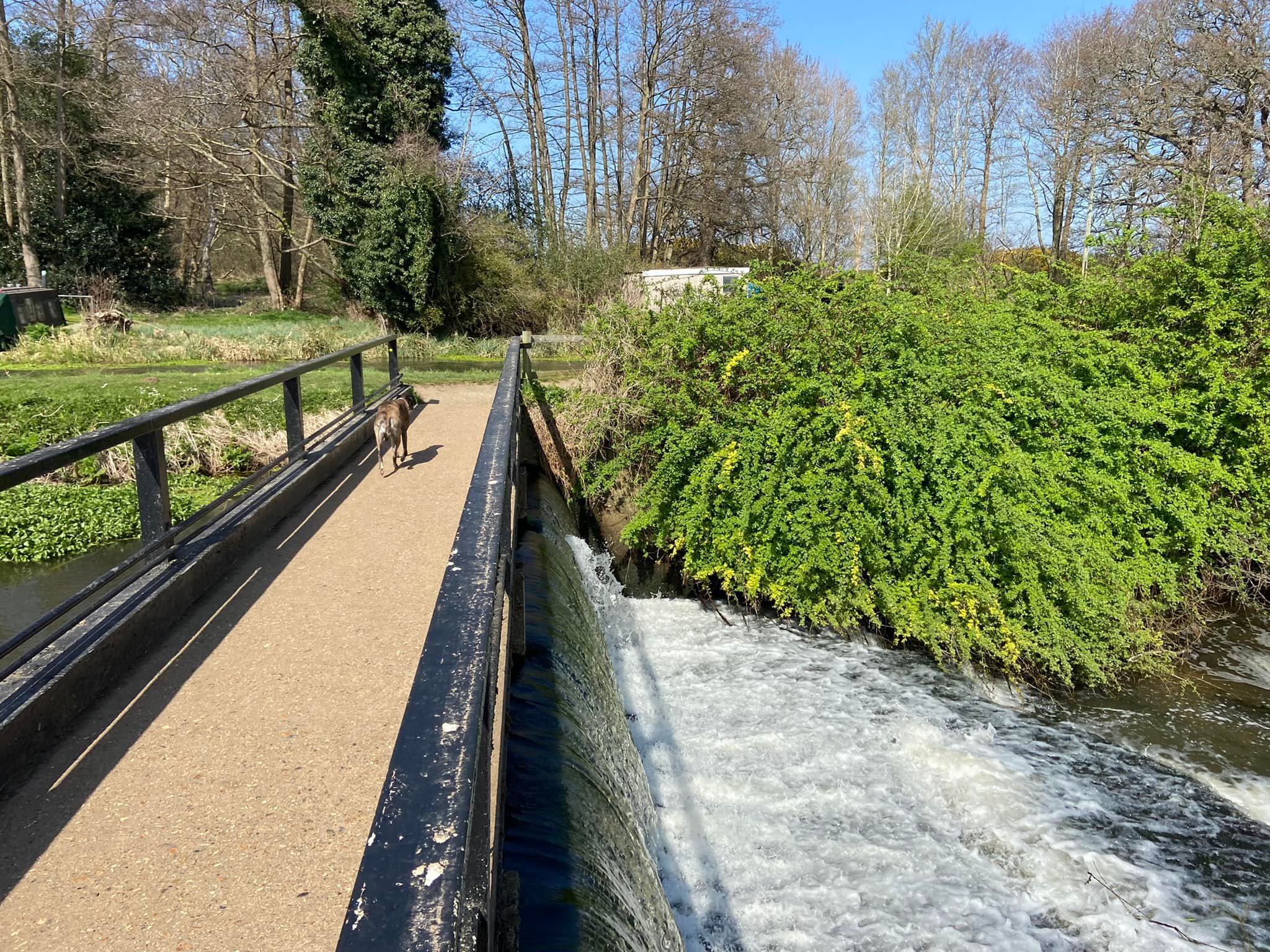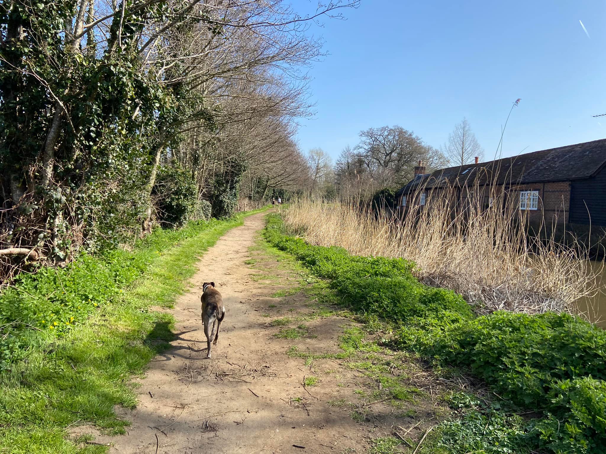 To your right is the River Wey, which you can see has strong currents. Small paths wind down to it so you can get nearer if you want to, but if you’re going to do this, put your dog on lead as you don’t want them falling into this fast-flowing water body.