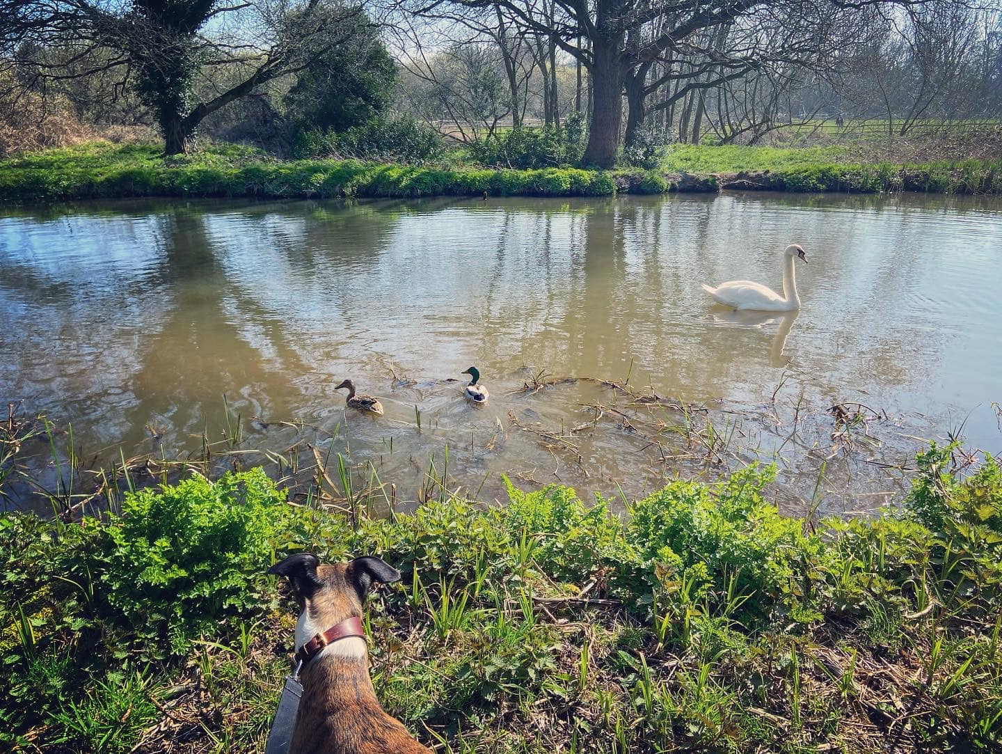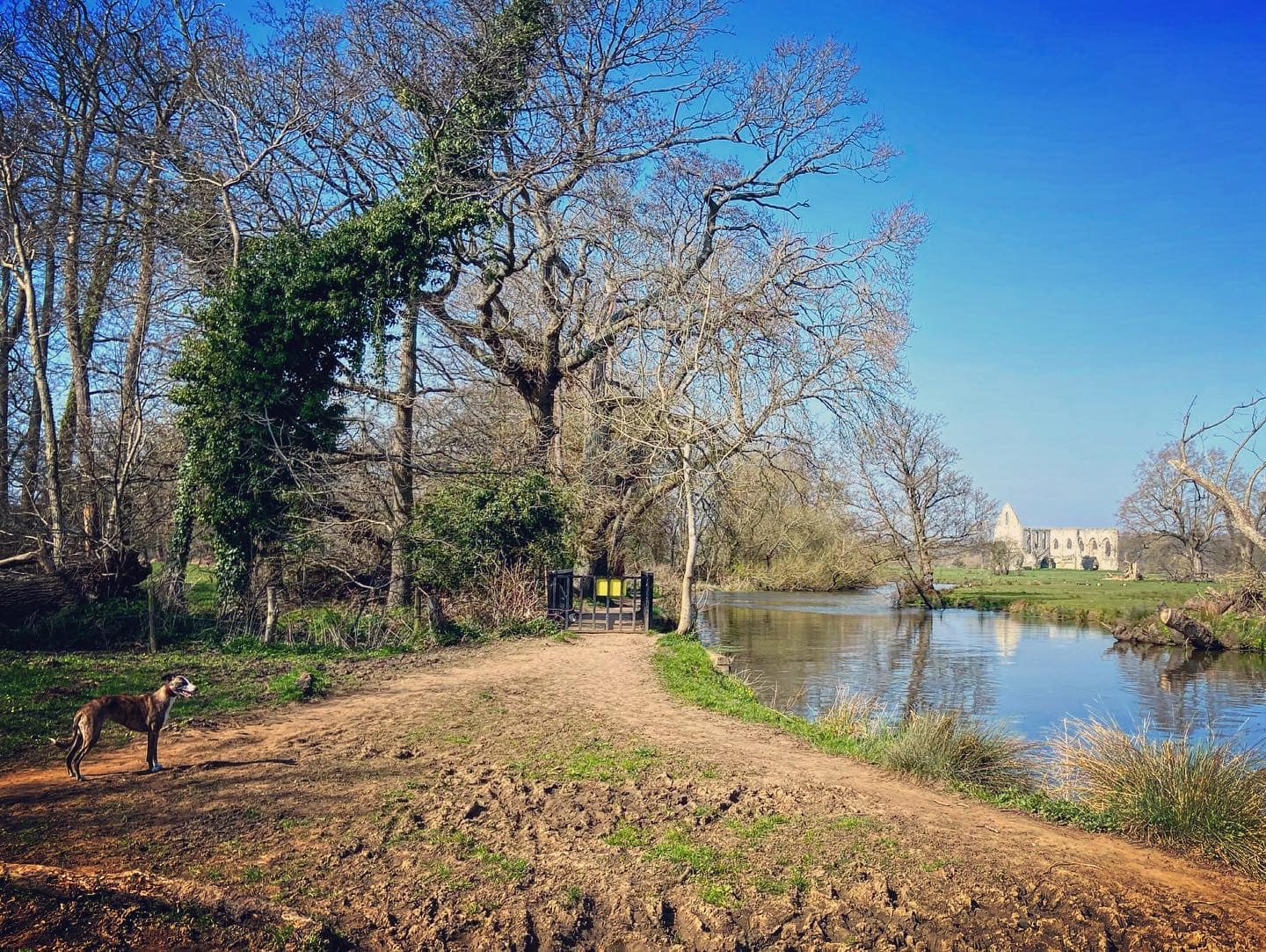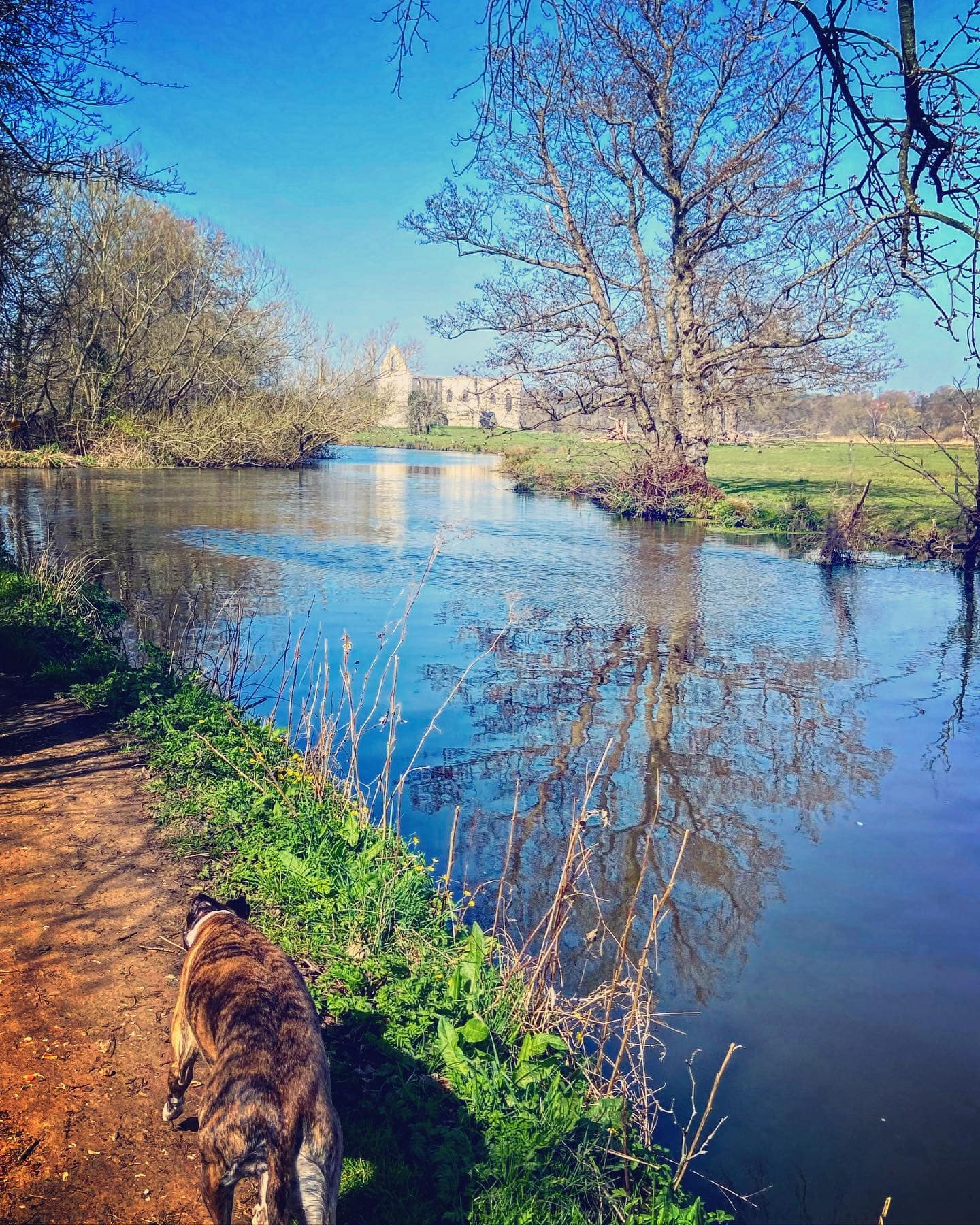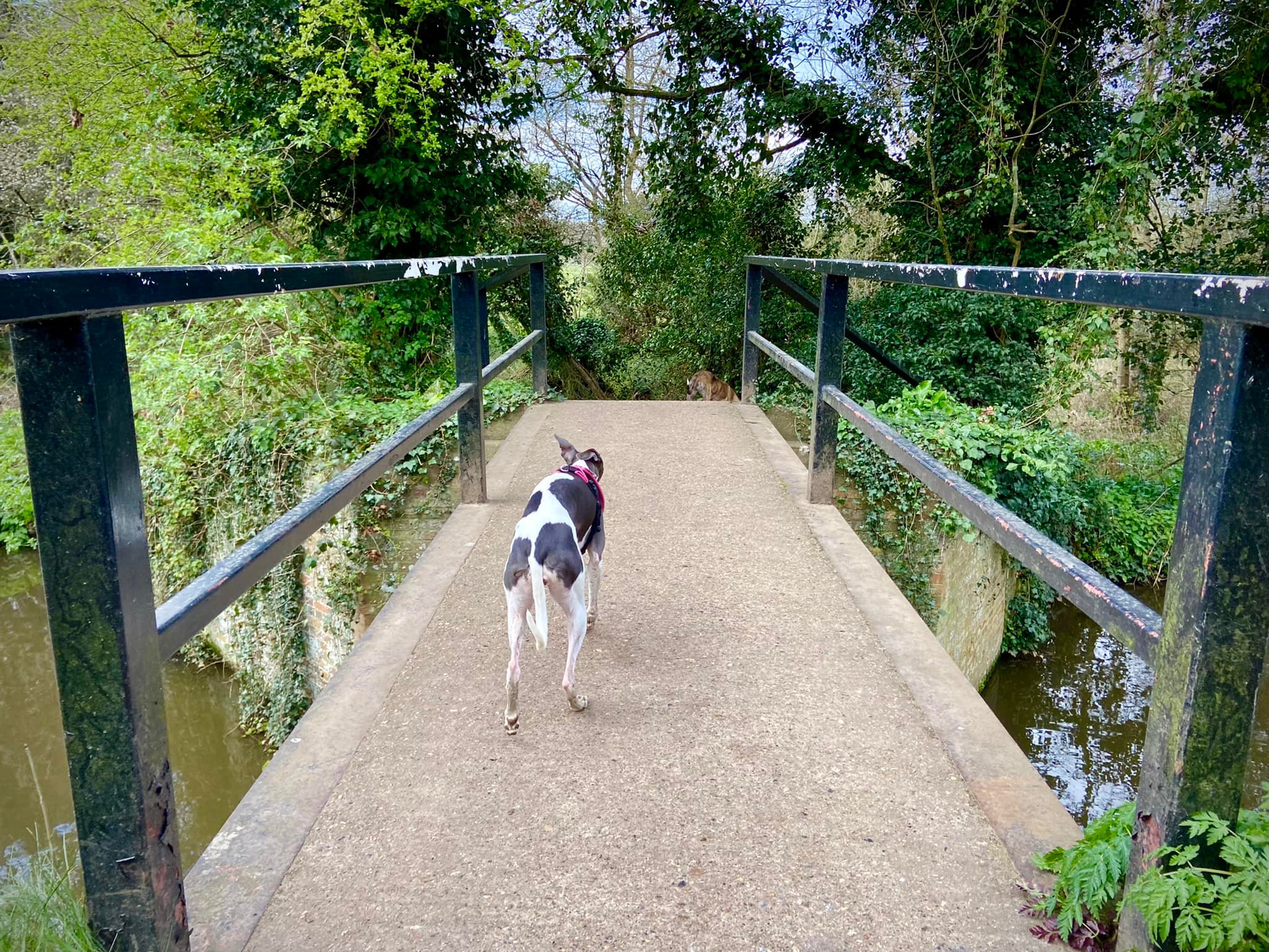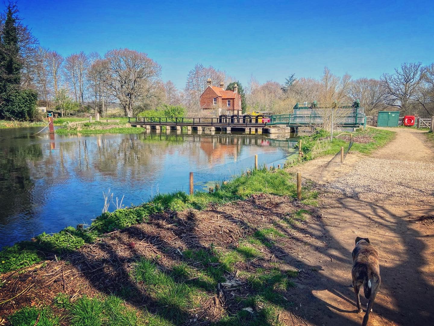 To your right is the River Wey, which you can see has strong currents. Small paths wind down to it so you can get nearer if you want to, but if you’re going to do this, put your dog on lead as you don’t want them falling into this fast-flowing water body.