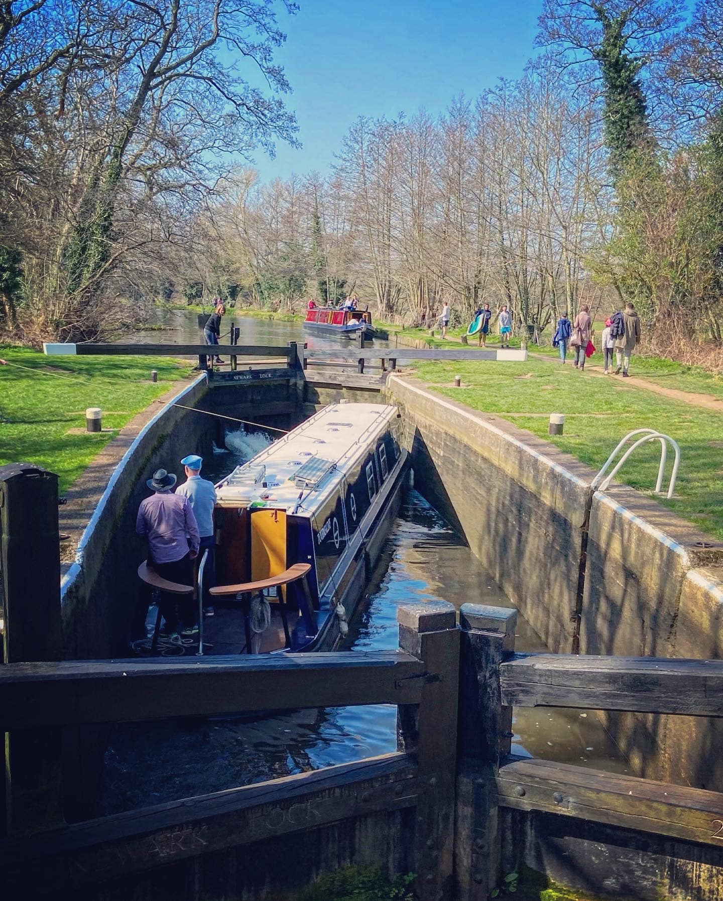 At Newark Lock, the path crosses the canal. If you’re lucky, you might see a long boat using it. Continue ahead on the tow path and pass through the black gate. If you look behind you now, you have another lovely view of the priory.