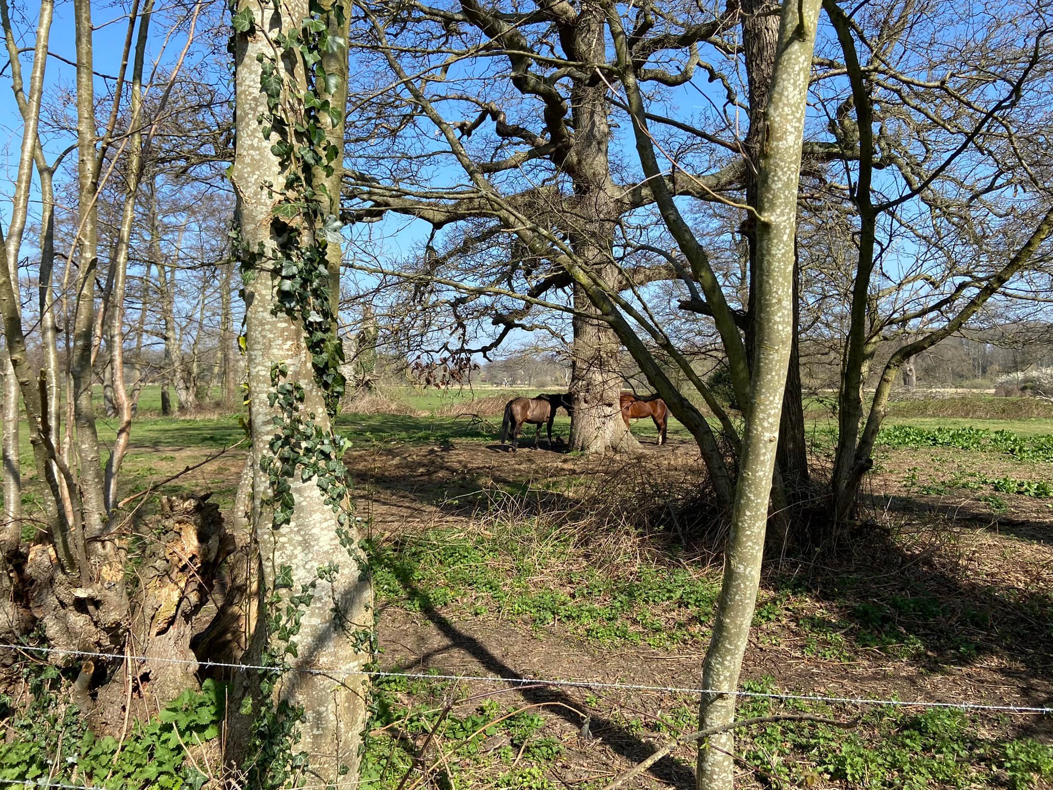 If you want to do the loop through the golf course, cross the Wey Navigation at this bridge, then go over the plank bridge ahead and follow the path alongside the tall fir trees on the left and the horse paddocks on your right, then round to the right.