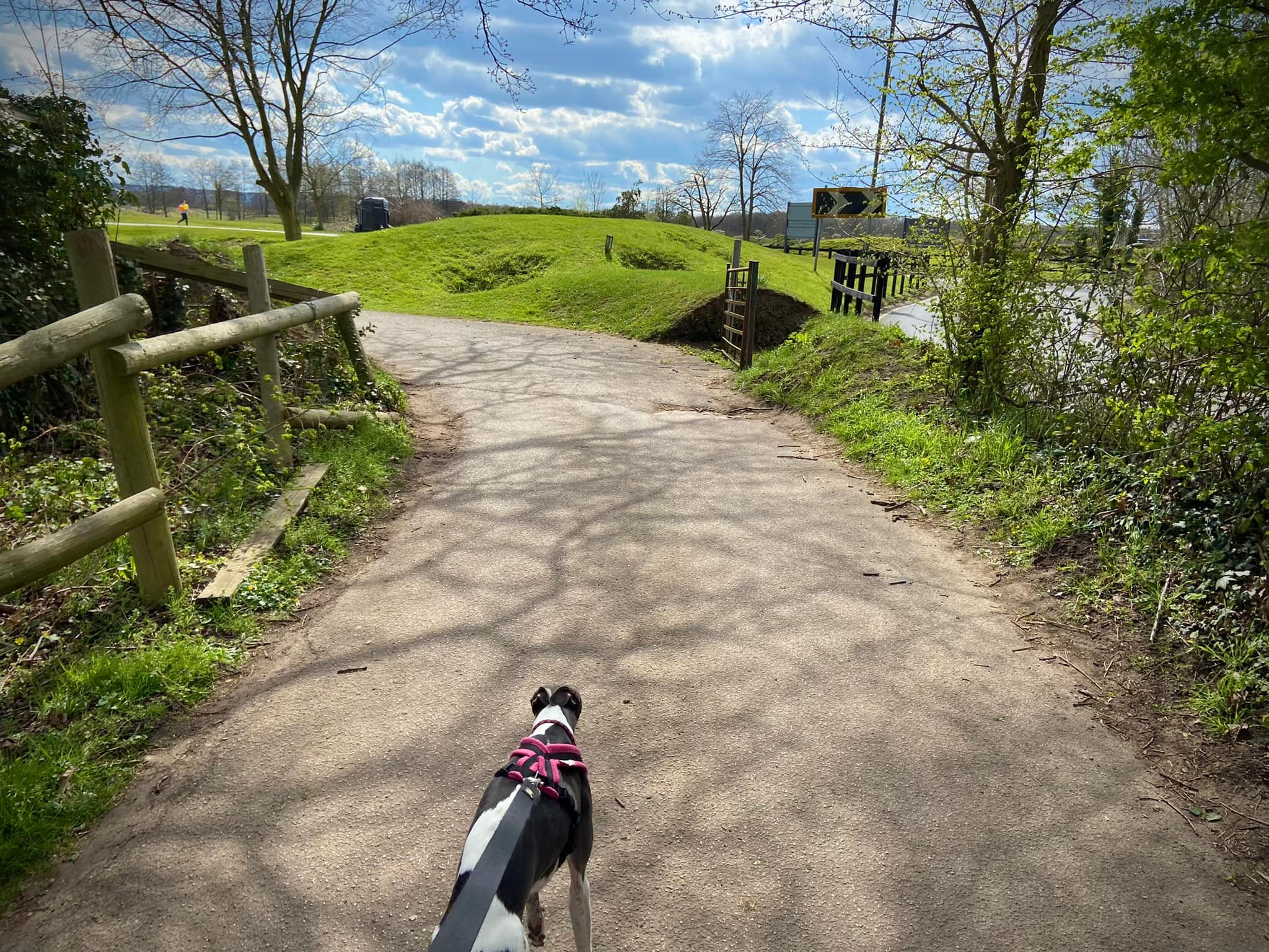 At the end of the path, cross the plank bridge to the finger post and turn left. Pass the steps up to the 17th tee and then go left at the fork, passing a green poo bin and edging the golf course as the gravel path rounds the corner to the right.