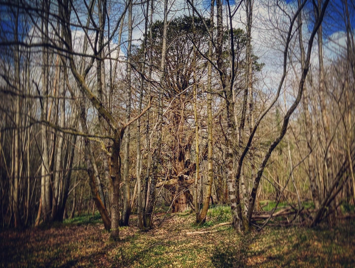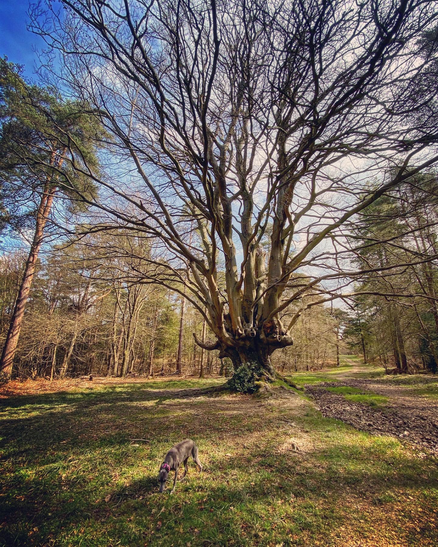 Go through the gap and walk straight ahead downslope into the trees and away from the fence. This isn’t the most distinct path ever and you may lose it as you pick your way through the trees but just keep going straight and you’ll pick it up again as it does become clearer the further you go. You’ll come down to the main wide path that cuts from one end of the forest to the other. If you look to your left, you’ll see a big ancient tree in the middle of this really wide path – instead, turn right and walk in the opposite direction.