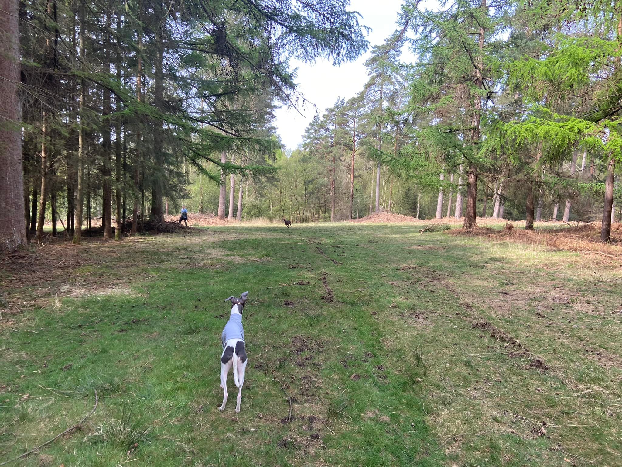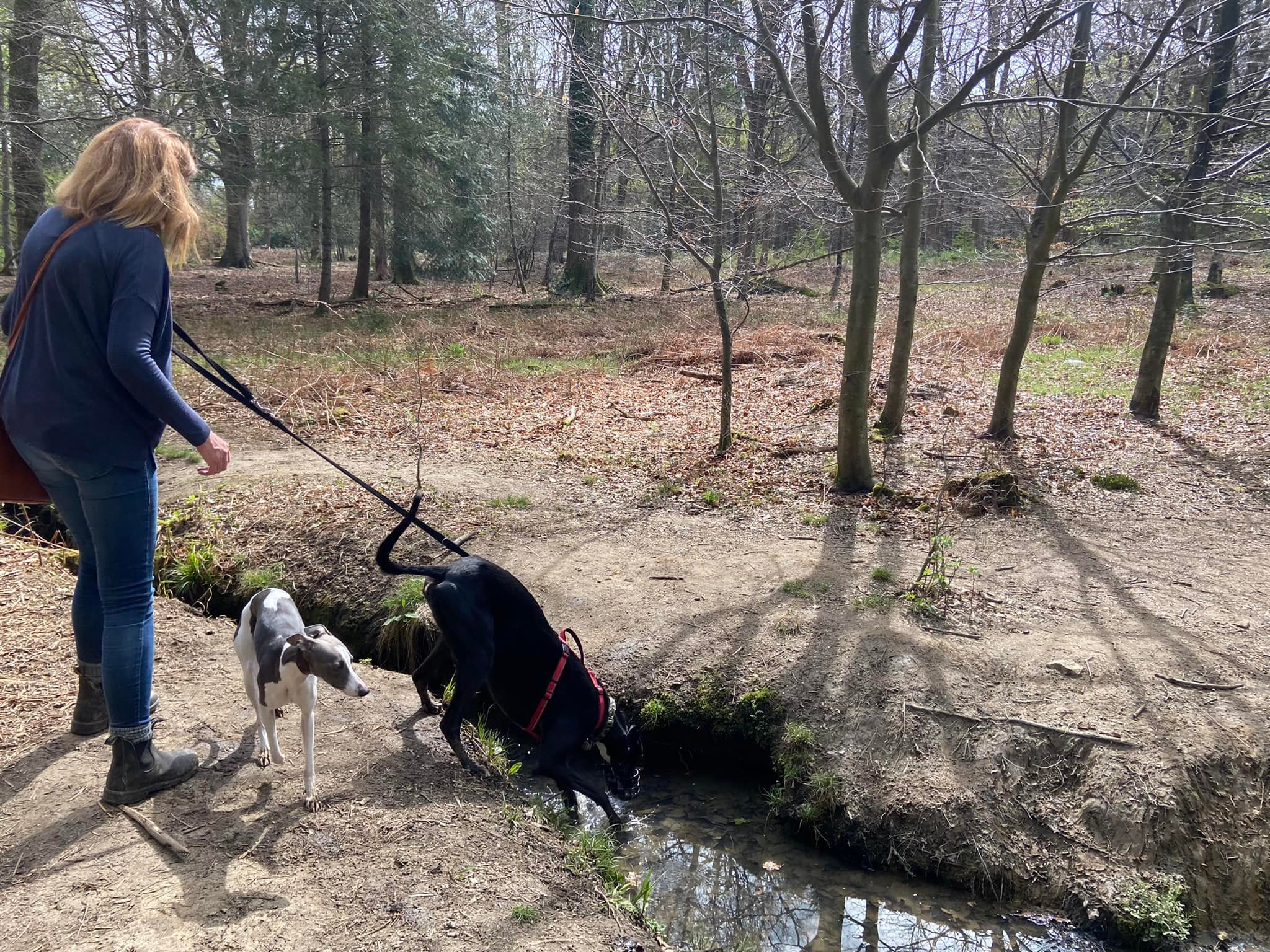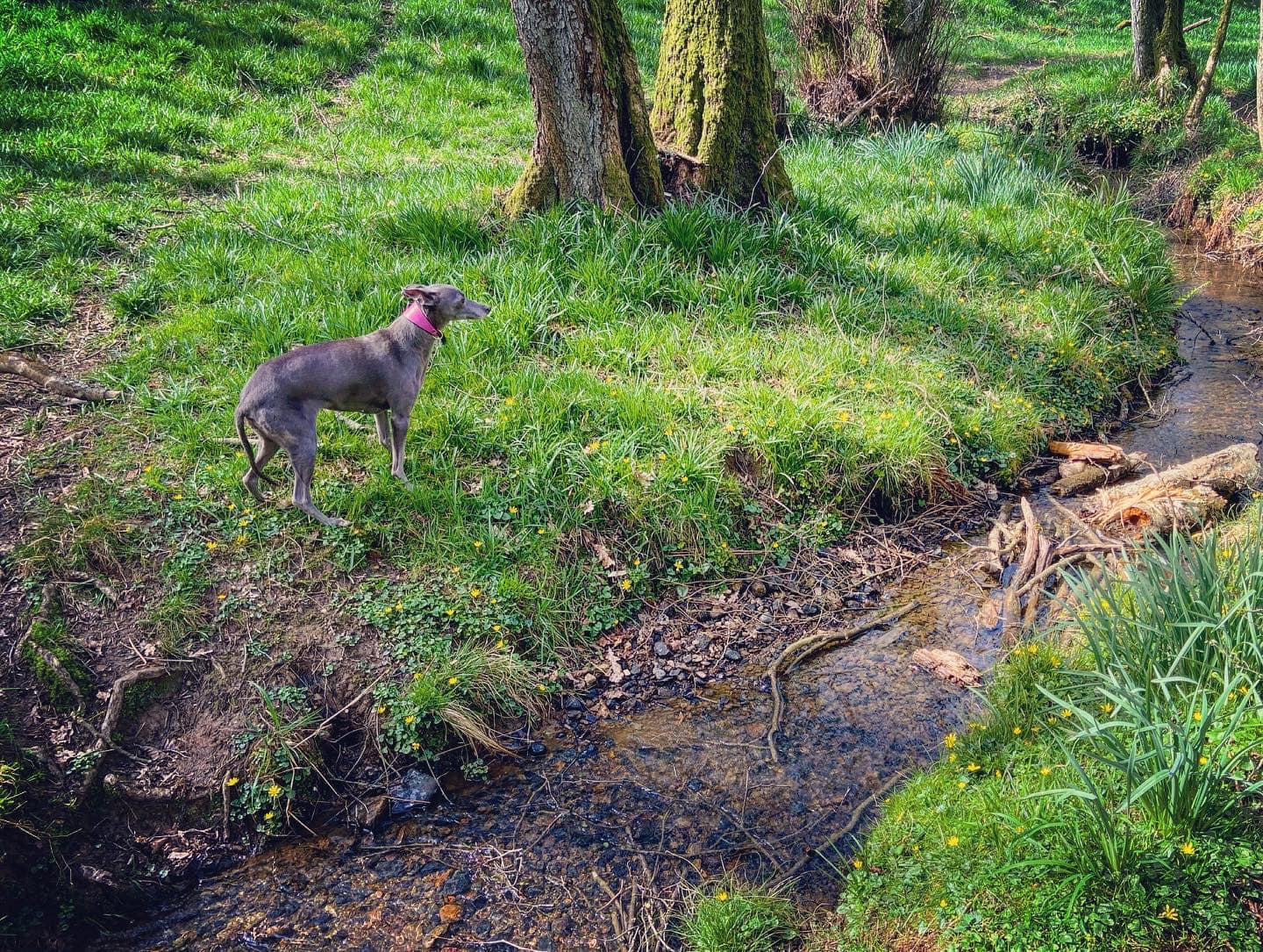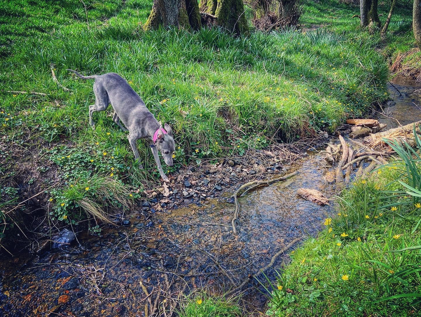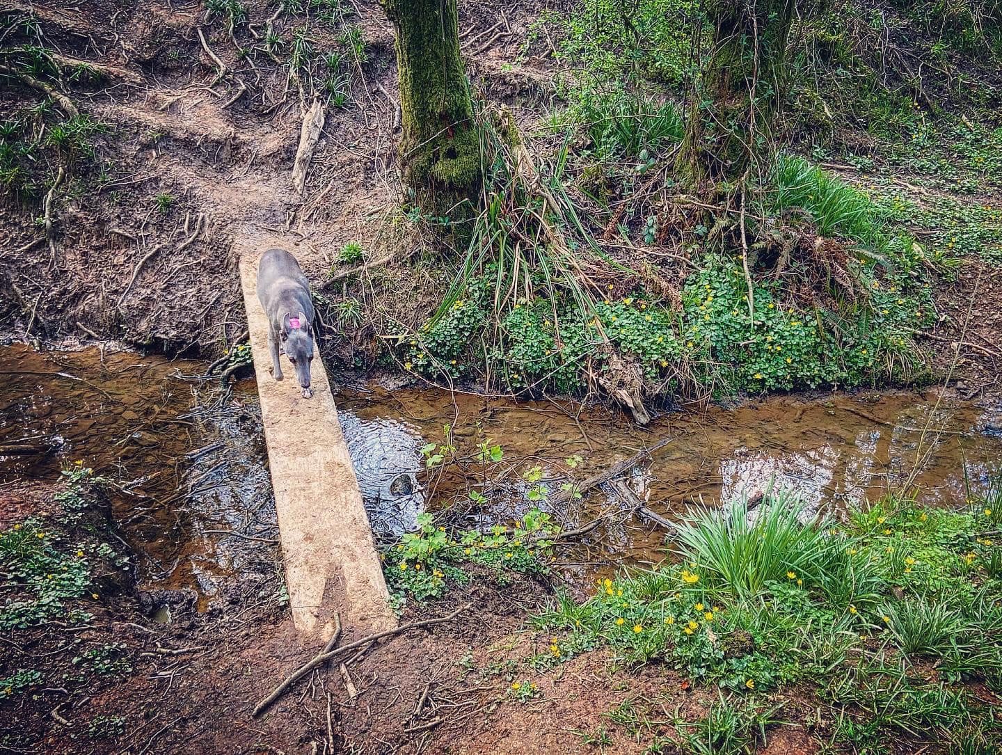 At the end, this little path arrives at a wide grassy pathway/gap between plantations – turn left (you actually walked along this earlier in the opposite direction). Walk to the clearing / cross paths and turn right. This is the path you came down at the start it the walk. Go down the dip, up the slope, pass the triangular wooden fence structure; down the next dip, over the stream (or in it, like Ollie in the photo below), up the slope, and pass the other triangular fence structure.