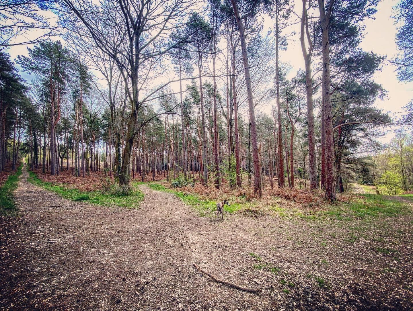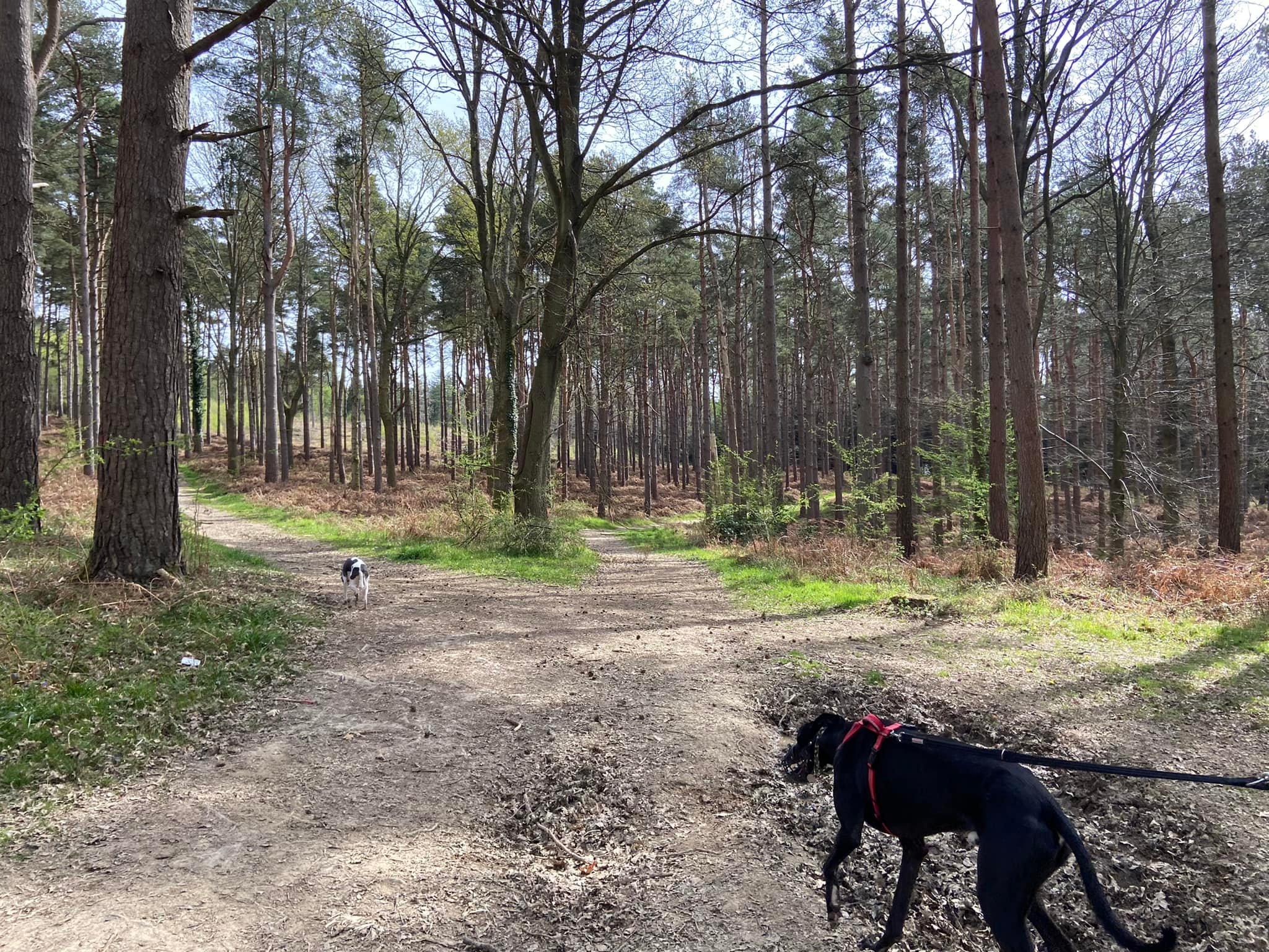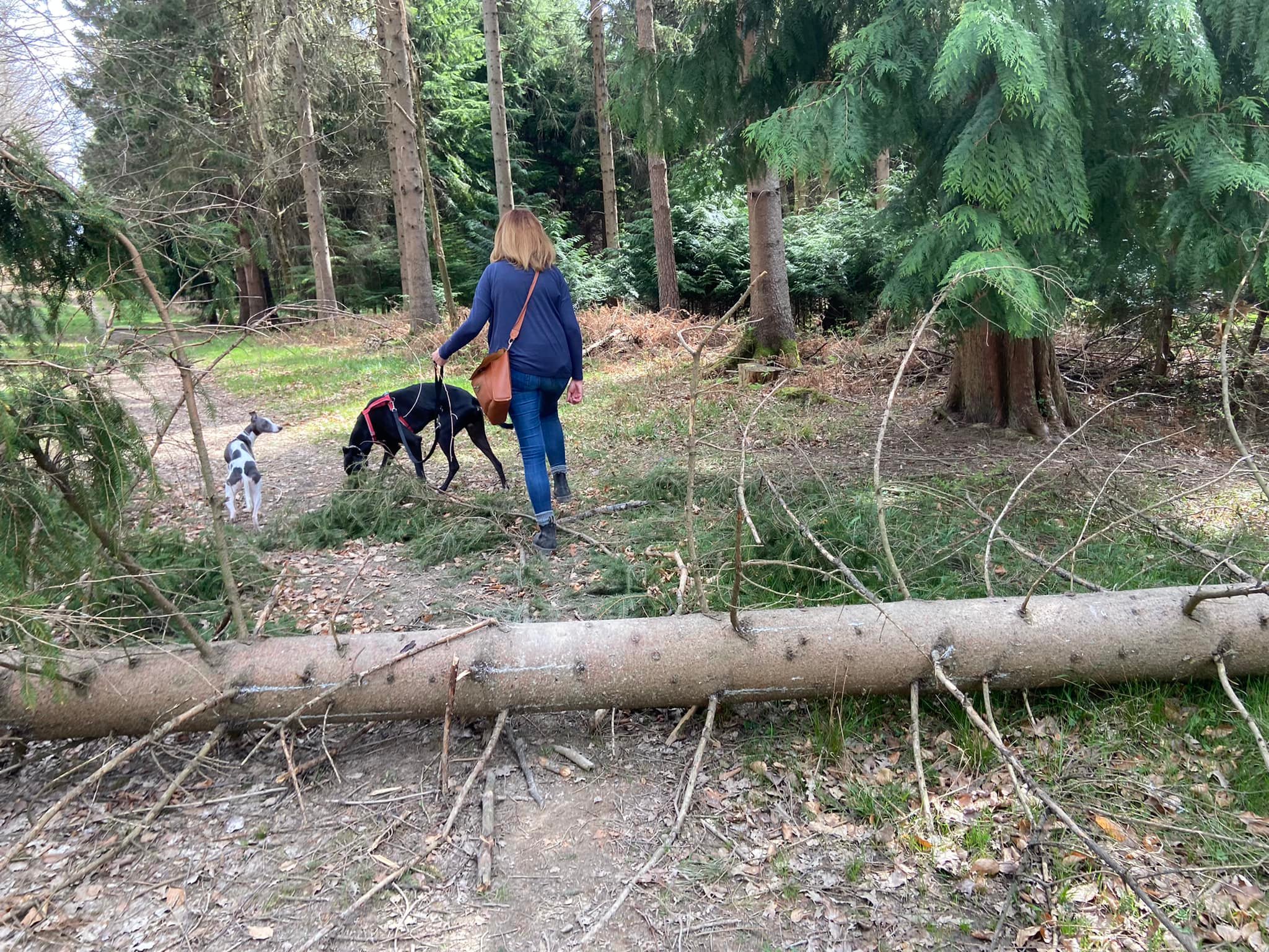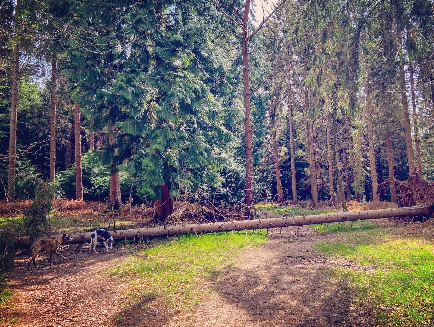 You’ll come to a wide cross paths (if you look down the path to the right, quite far down it you should be able to see a *long fallen tree trunk* along the edge of the tree line), continue straight ahead and then follow the way round to the right and down a dip. There are then a couple of big fallen evergreen trees (Scots Pine, I think) that are right across the path. Walkers have gone around them enough that there’s an obvious path trodden through so follow in their footsteps to pass them.