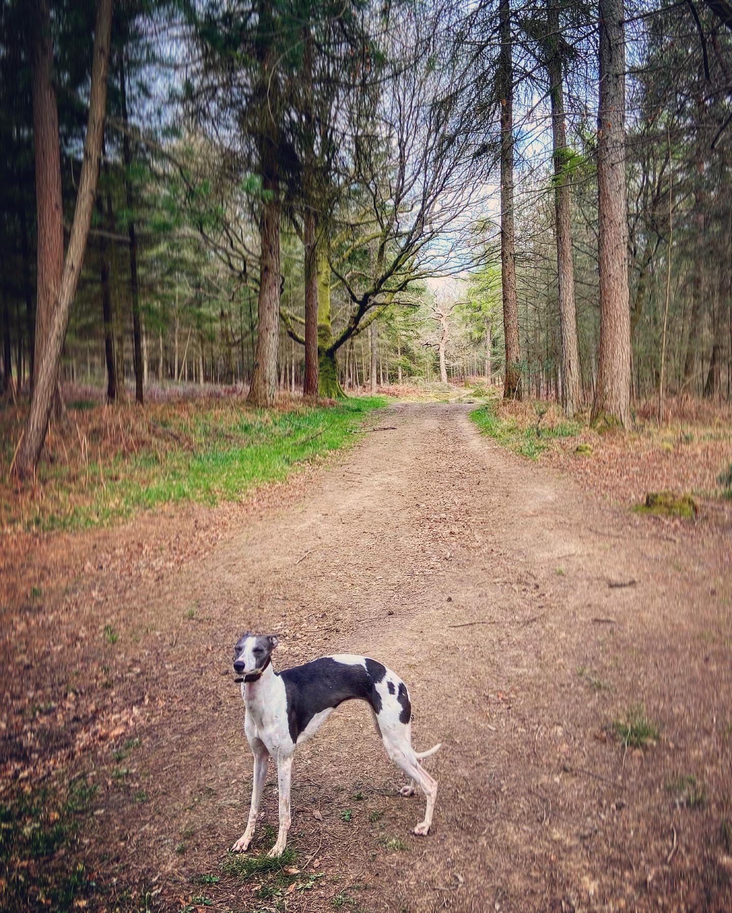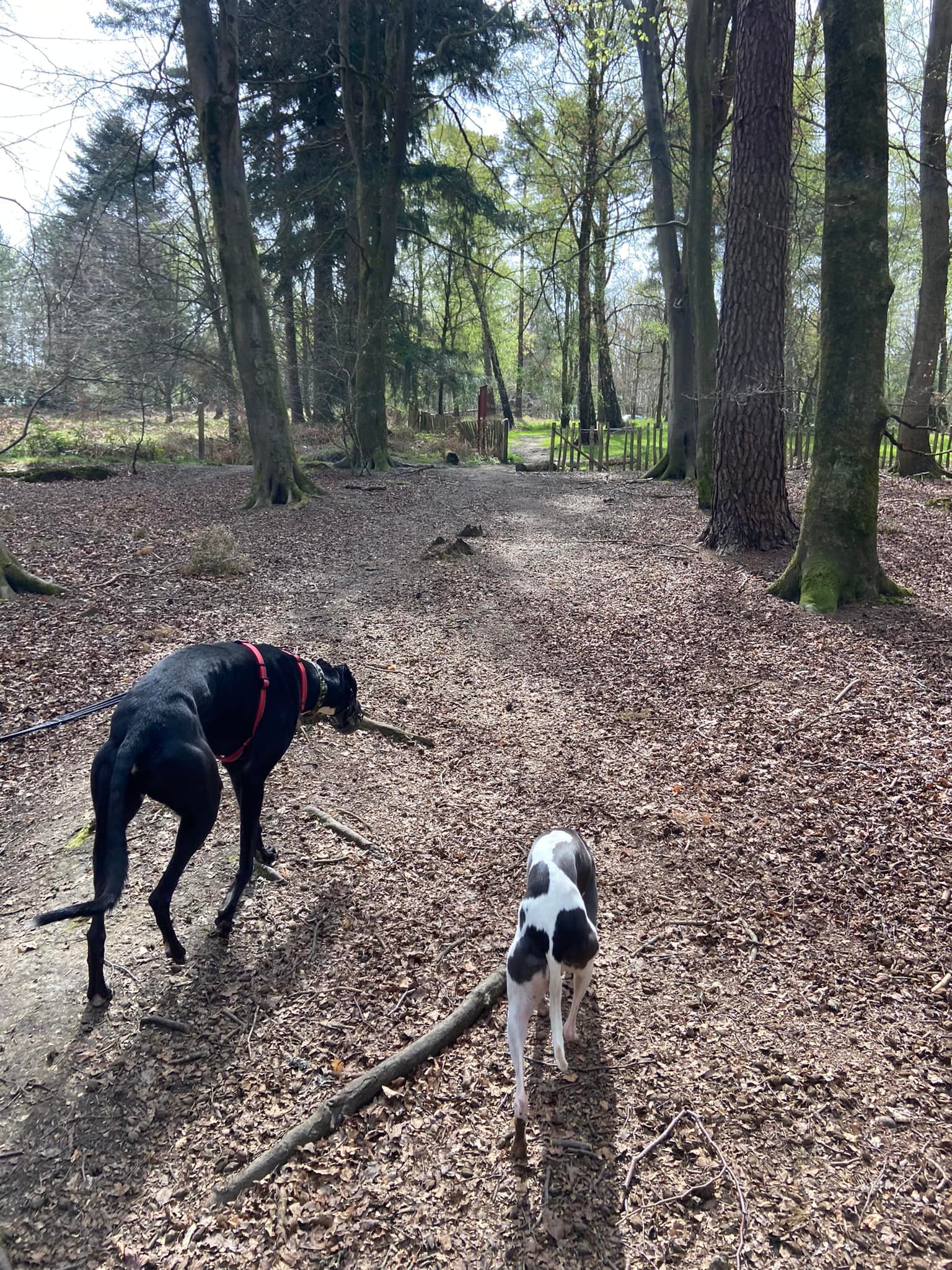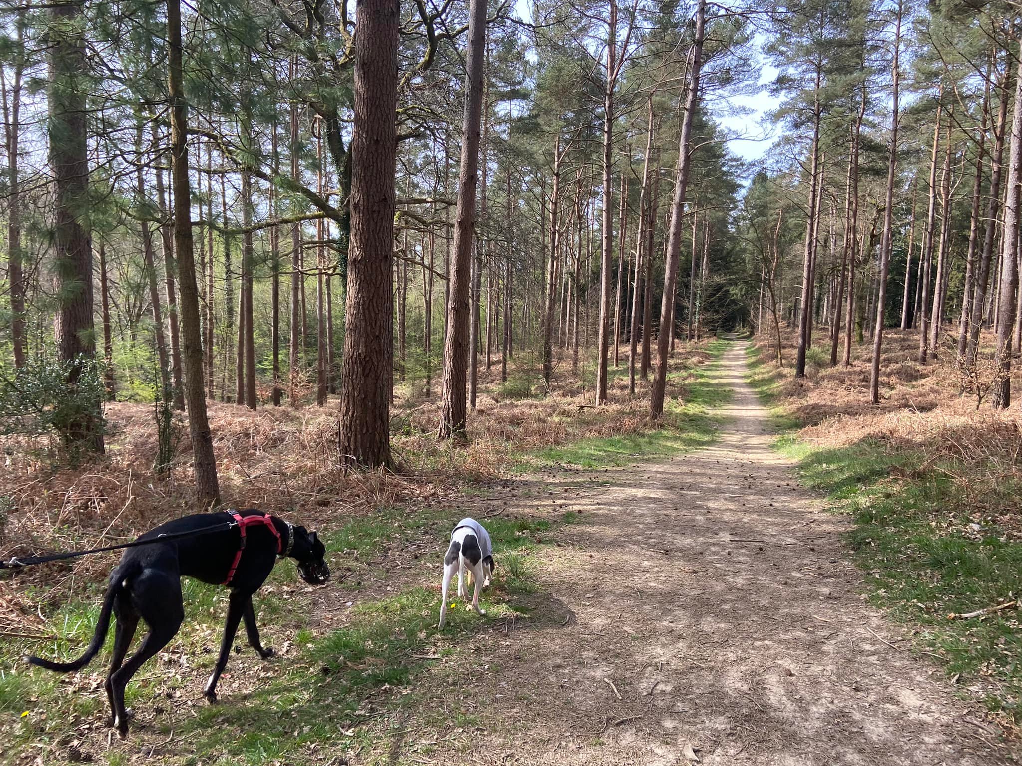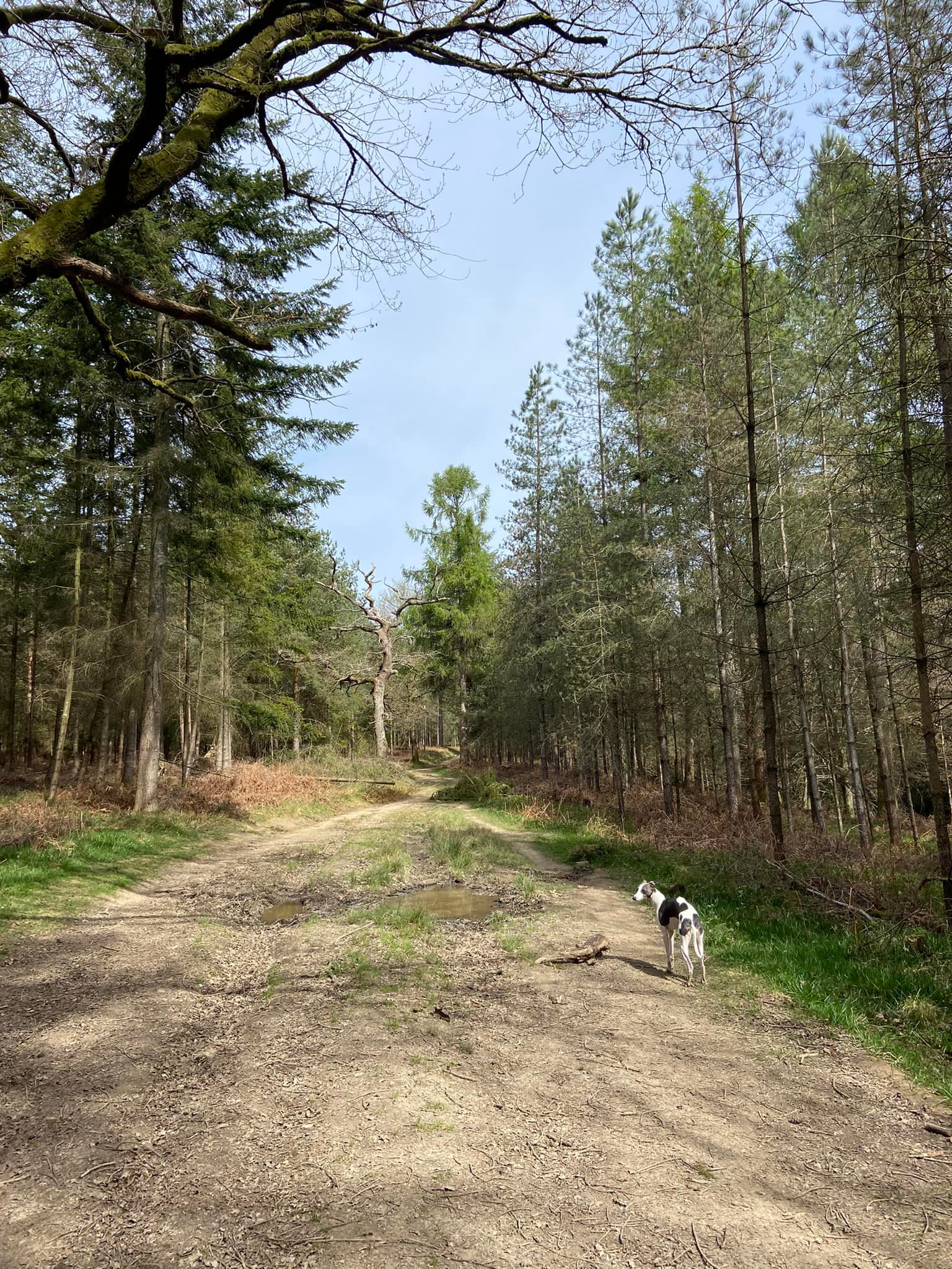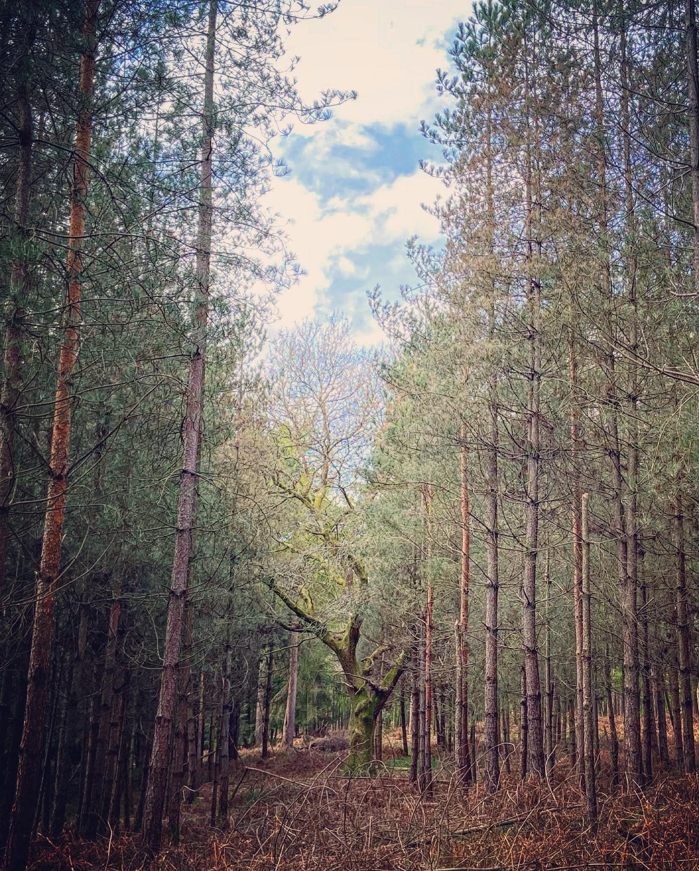 You’ll come to a wide cross paths (if you look down the path to the right, quite far down it you should be able to see a *long fallen tree trunk* along the edge of the tree line), continue straight ahead and then follow the way round to the right and down a dip. There are then a couple of big fallen evergreen trees (Scots Pine, I think) that are right across the path. Walkers have gone around them enough that there’s an obvious path trodden through so follow in their footsteps to pass them.