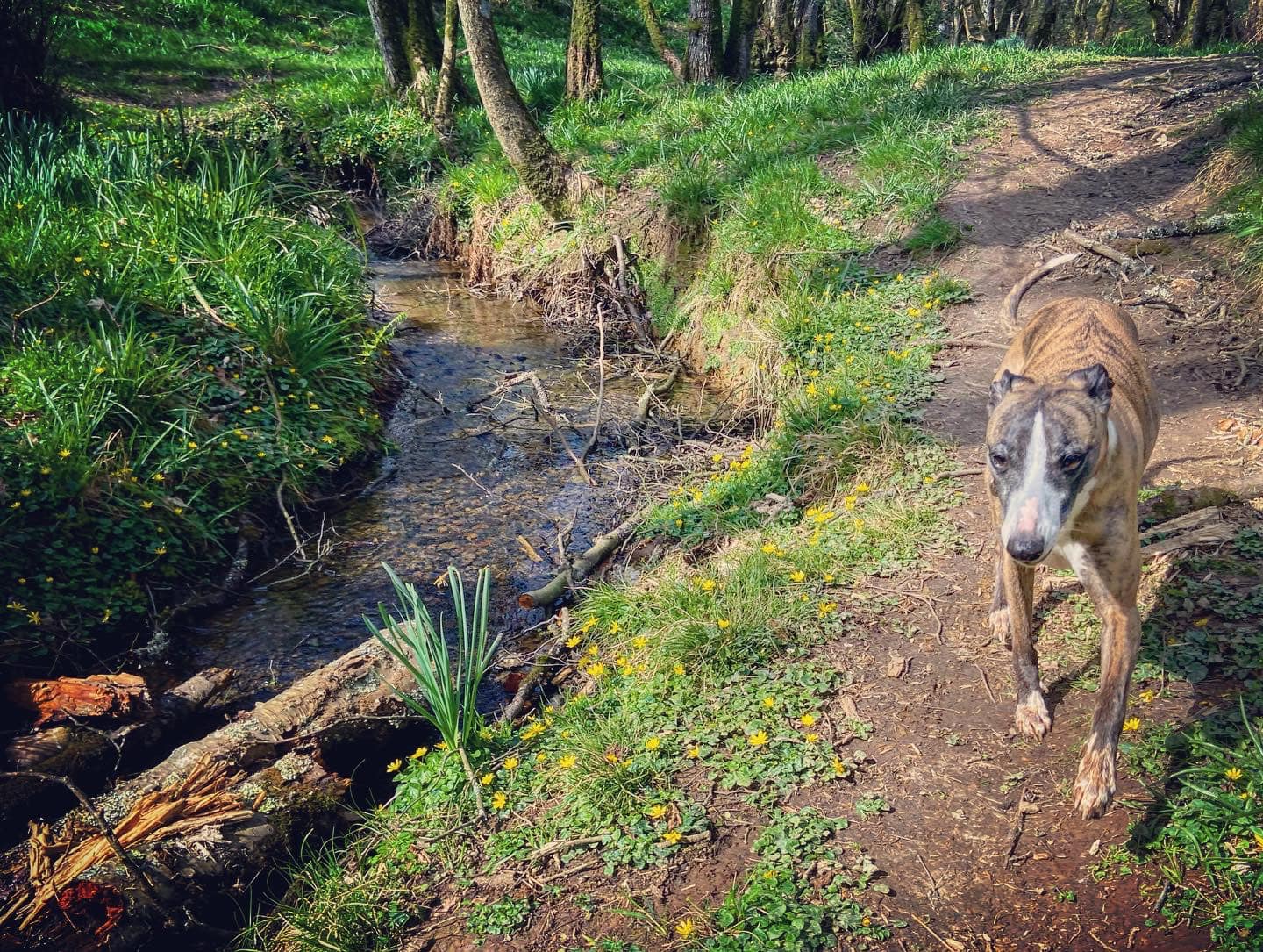 You’ll reach the stream, where you turn right. Walk along the stream, ignoring the plank of wood that goes over it. A word of caution – the whole section of this walk along the side of the stream can be quite uneven underfoot with lots of ups and downs, tree roots and higgledy-piggledy bits so take care and mind your footing.