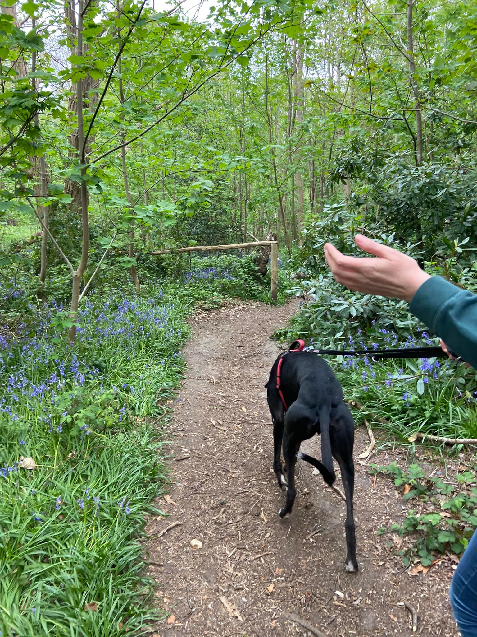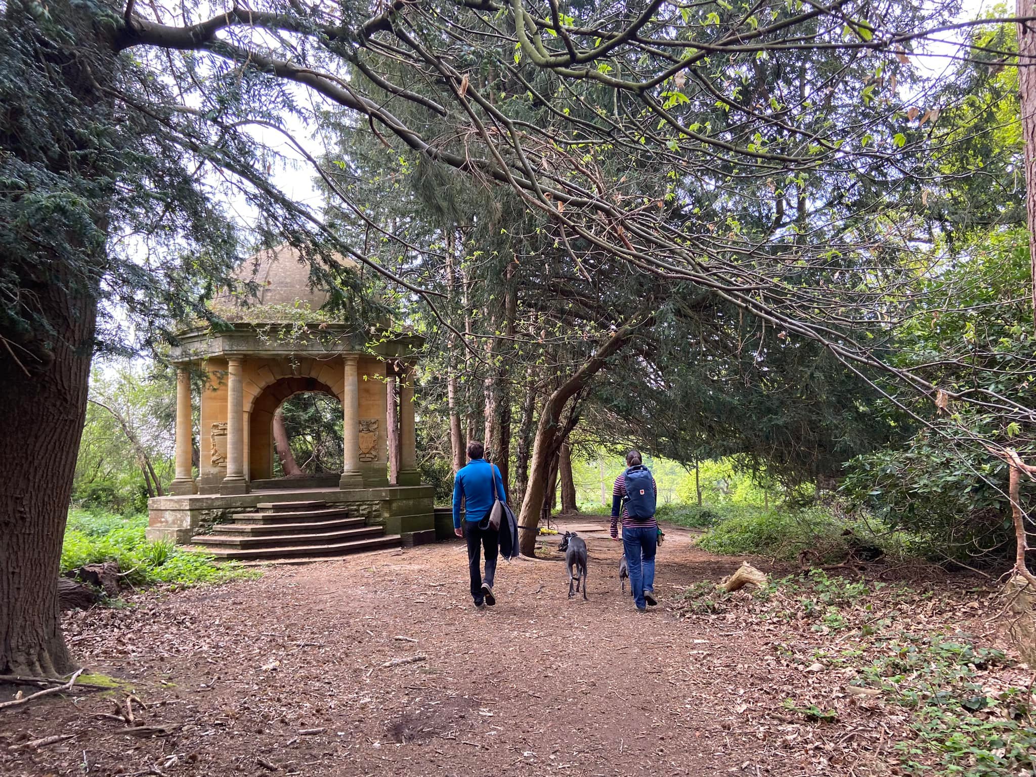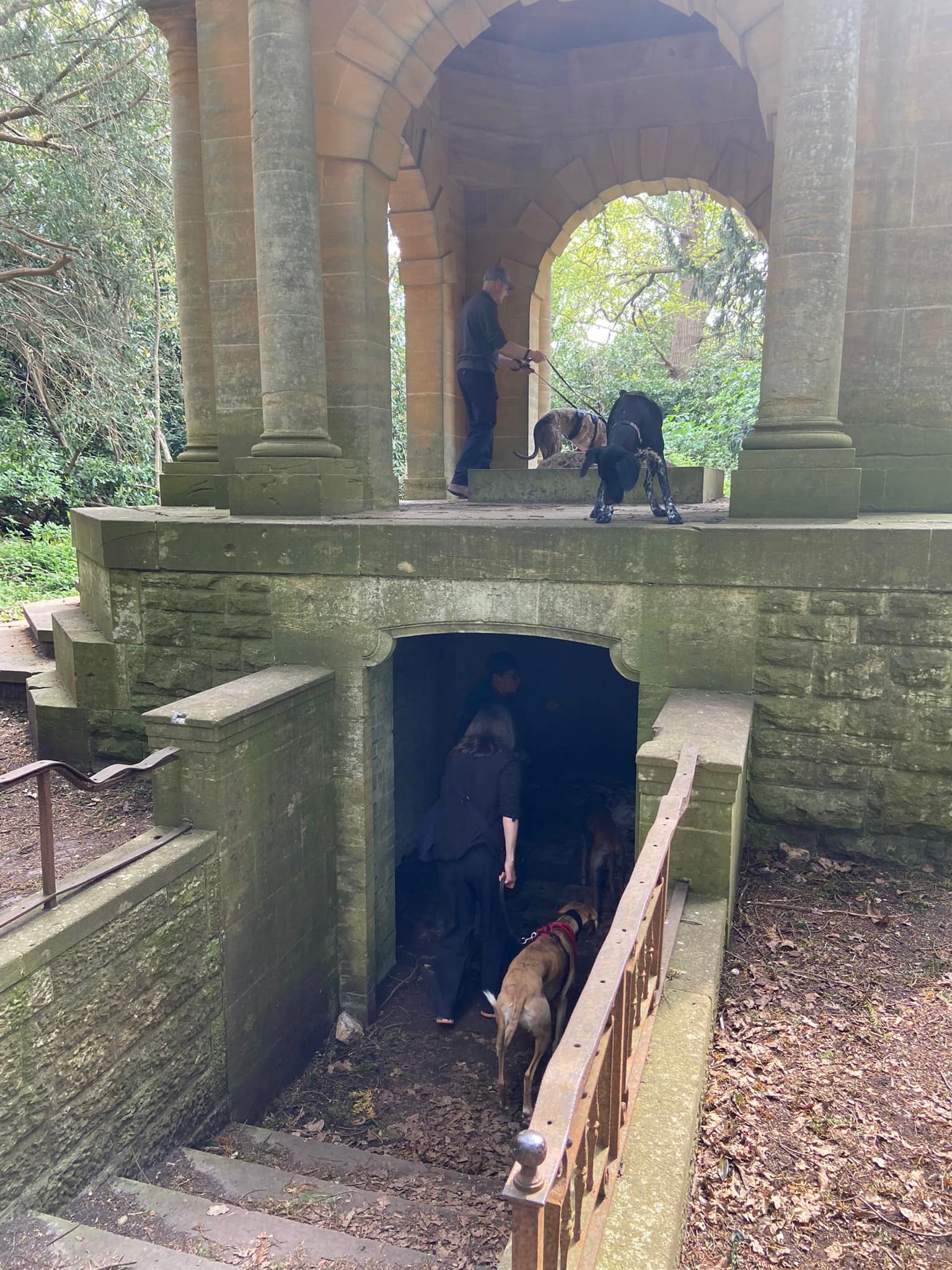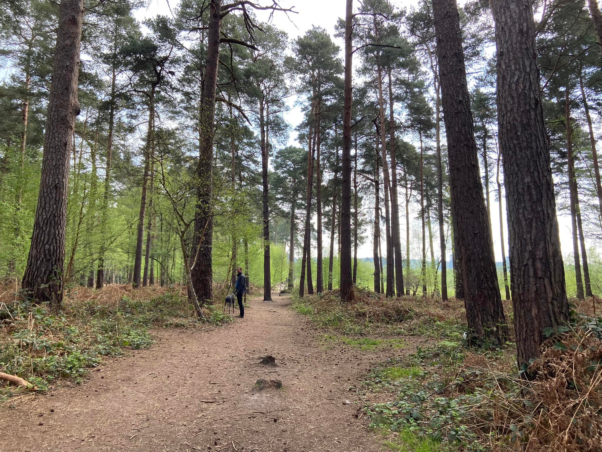 It goes through the trees and down to the Samuelson Mausoleum. At the time of writing this post (April 2022), the February storms had brought a couple of trees down partway along this path, but, these may cleared by Surrey Wildlife Trust at some point. Even if they don’t, none of the dogs with the Surrey Sighthound Walking Group had any trouble getting over them as the photos here show.