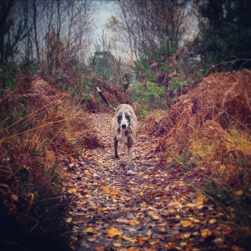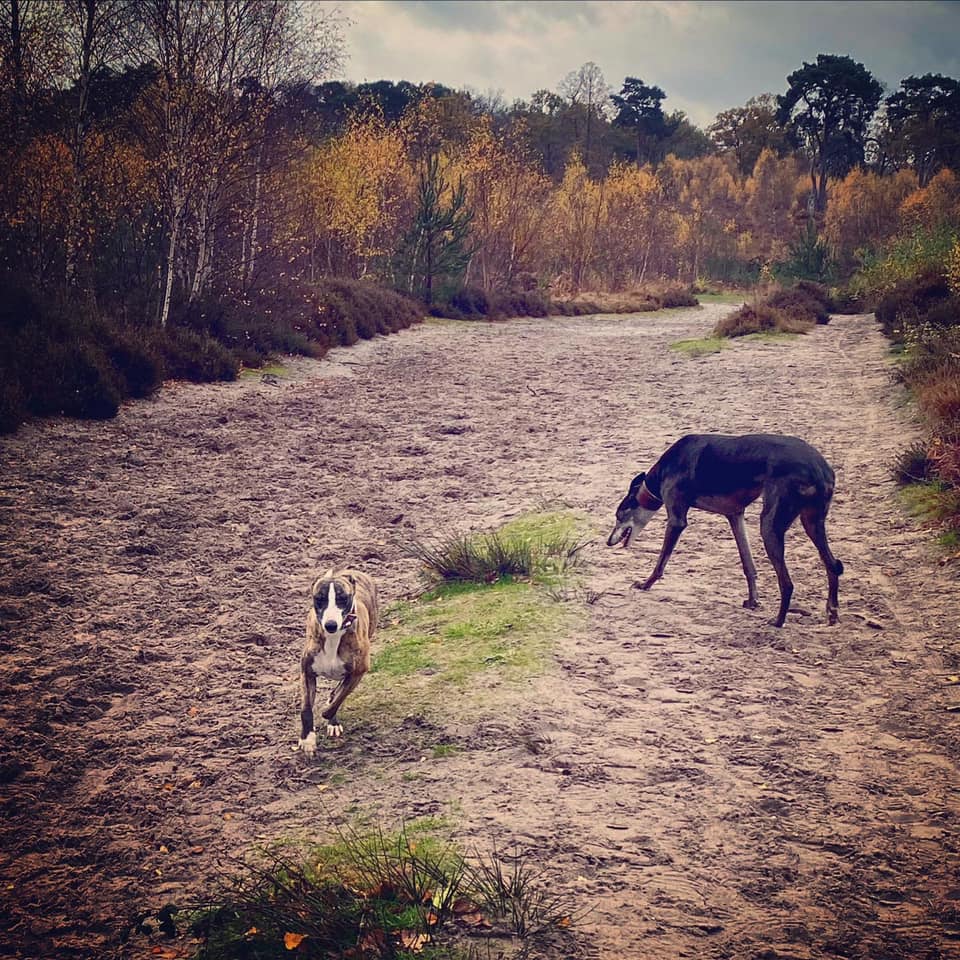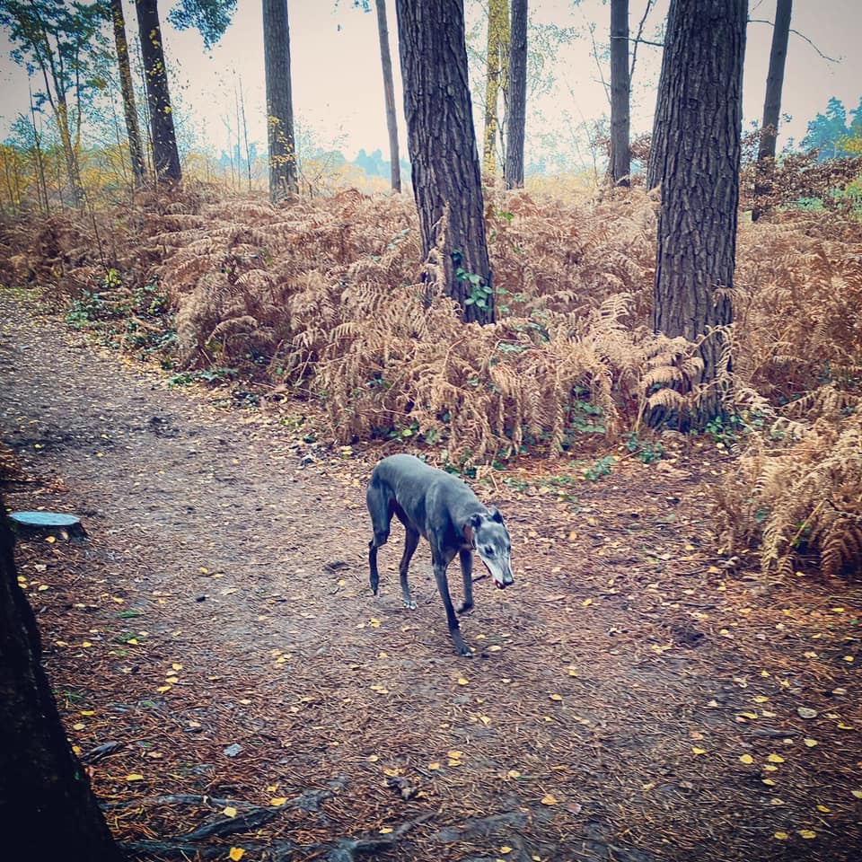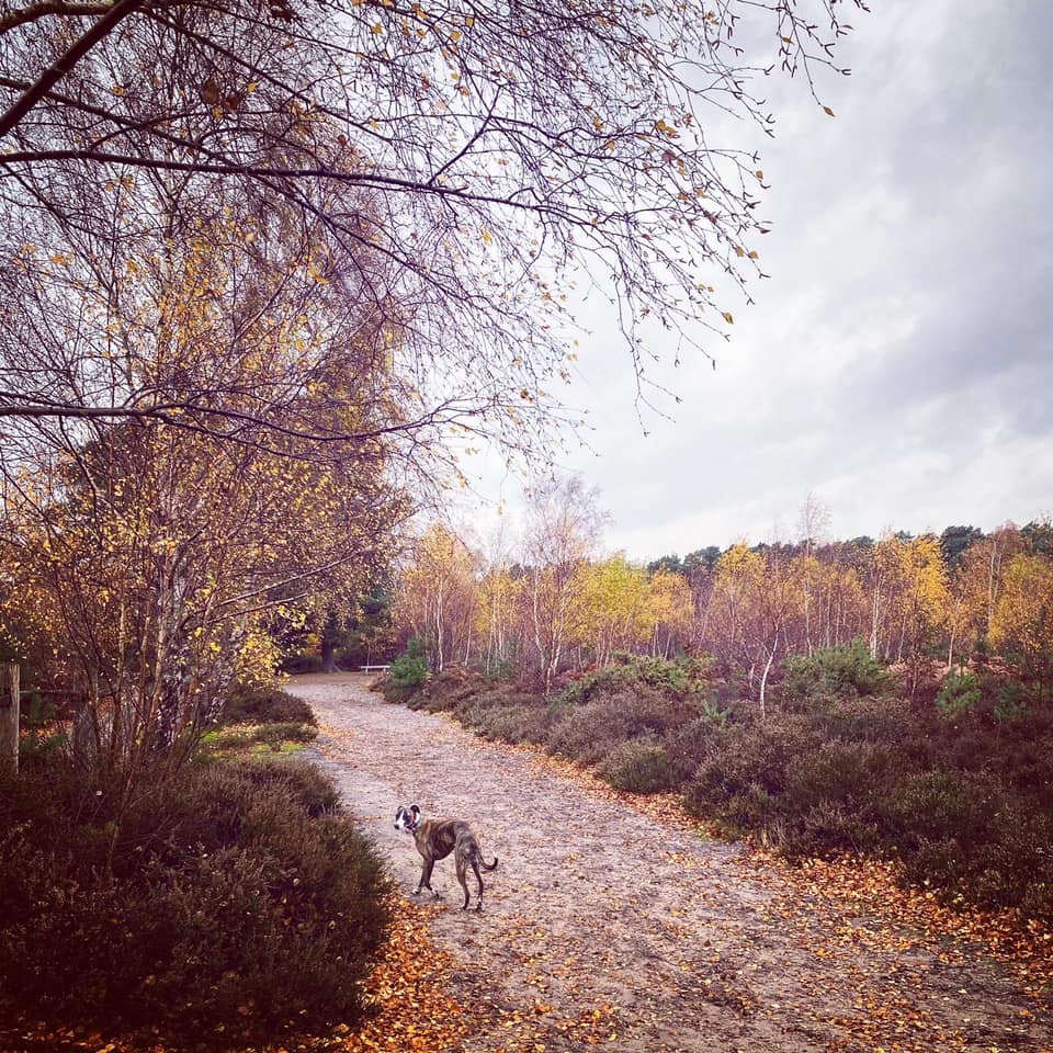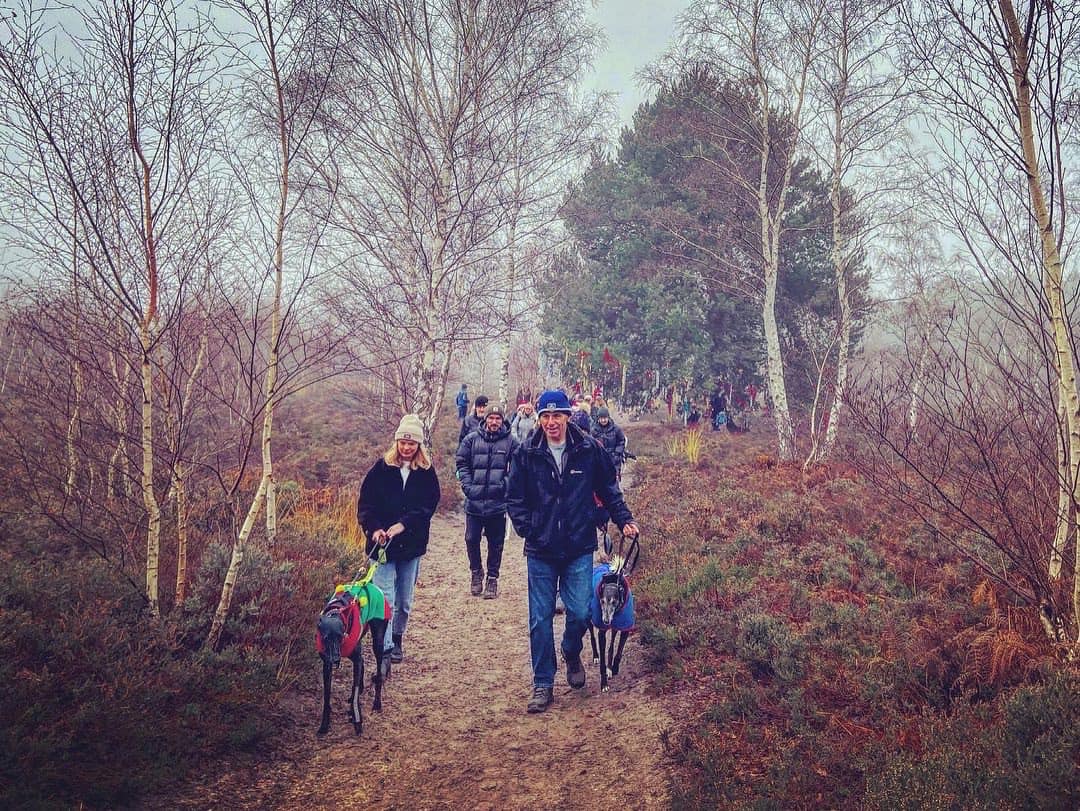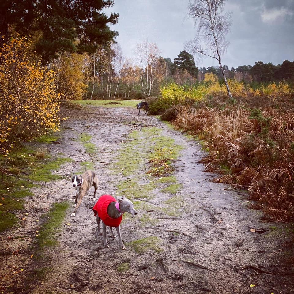 It goes through the trees and down to the Samuelson Mausoleum. At the time of writing this post (April 2022), the February storms had brought a couple of trees down partway along this path, but, these may cleared by Surrey Wildlife Trust at some point. Even if they don’t, none of the dogs with the Surrey Sighthound Walking Group had any trouble getting over them as the photos here show.