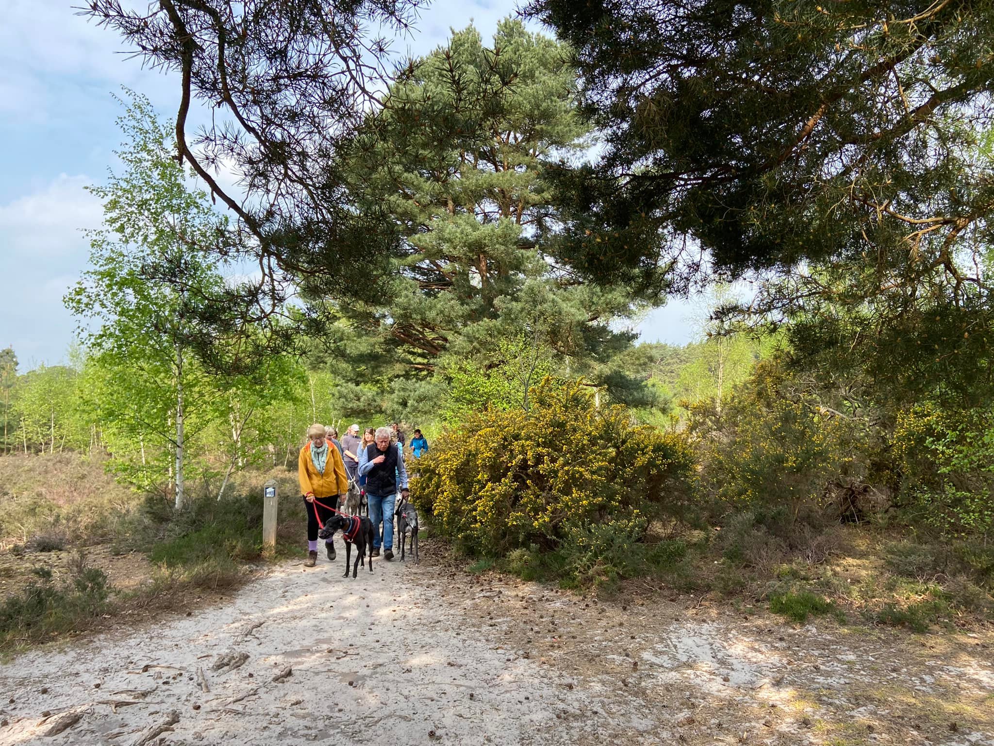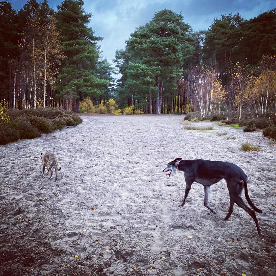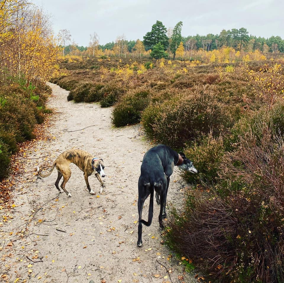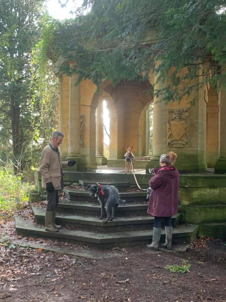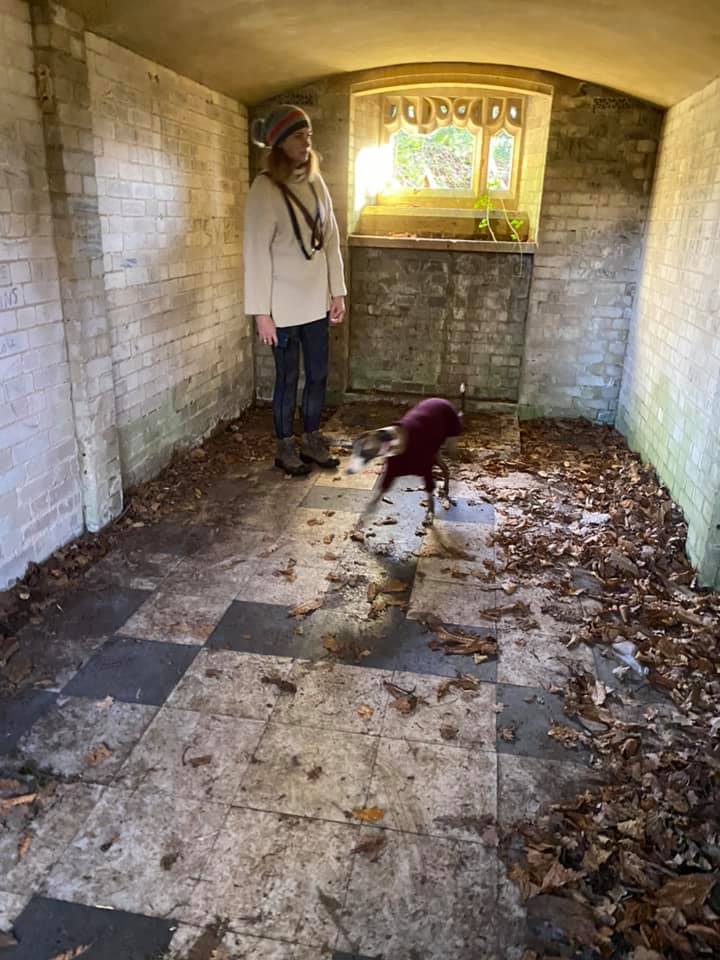 It goes through the trees and down to the Samuelson Mausoleum. At the time of writing this post (April 2022), the February storms had brought a couple of trees down partway along this path, but, these may cleared by Surrey Wildlife Trust at some point. Even if they don’t, none of the dogs with the Surrey Sighthound Walking Group had any trouble getting over them as the photos here show.