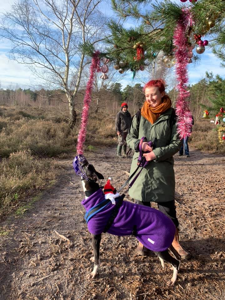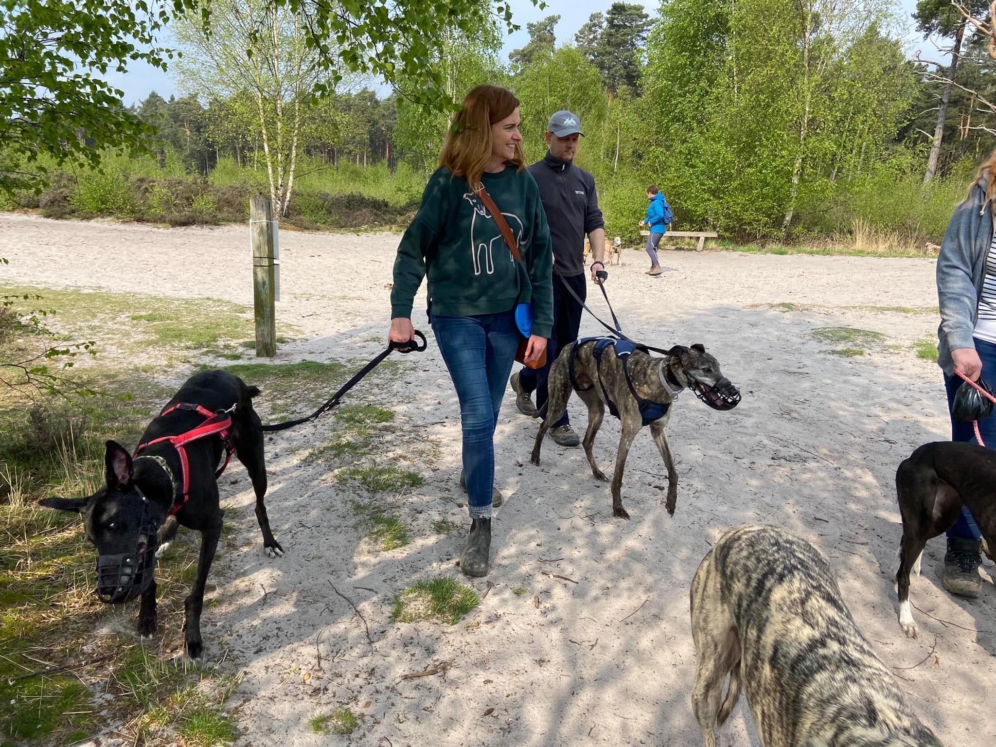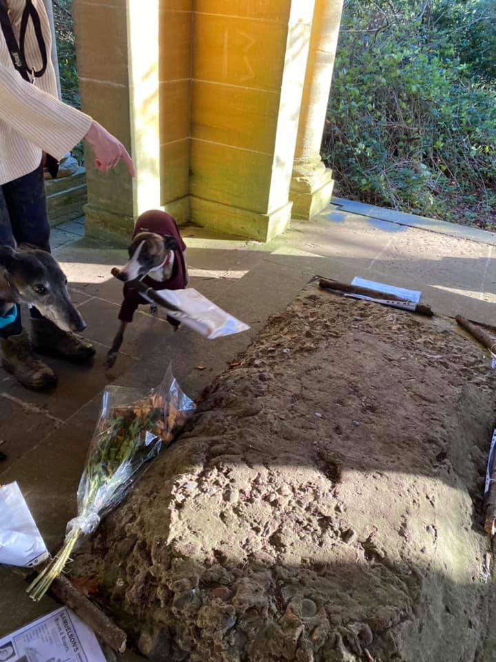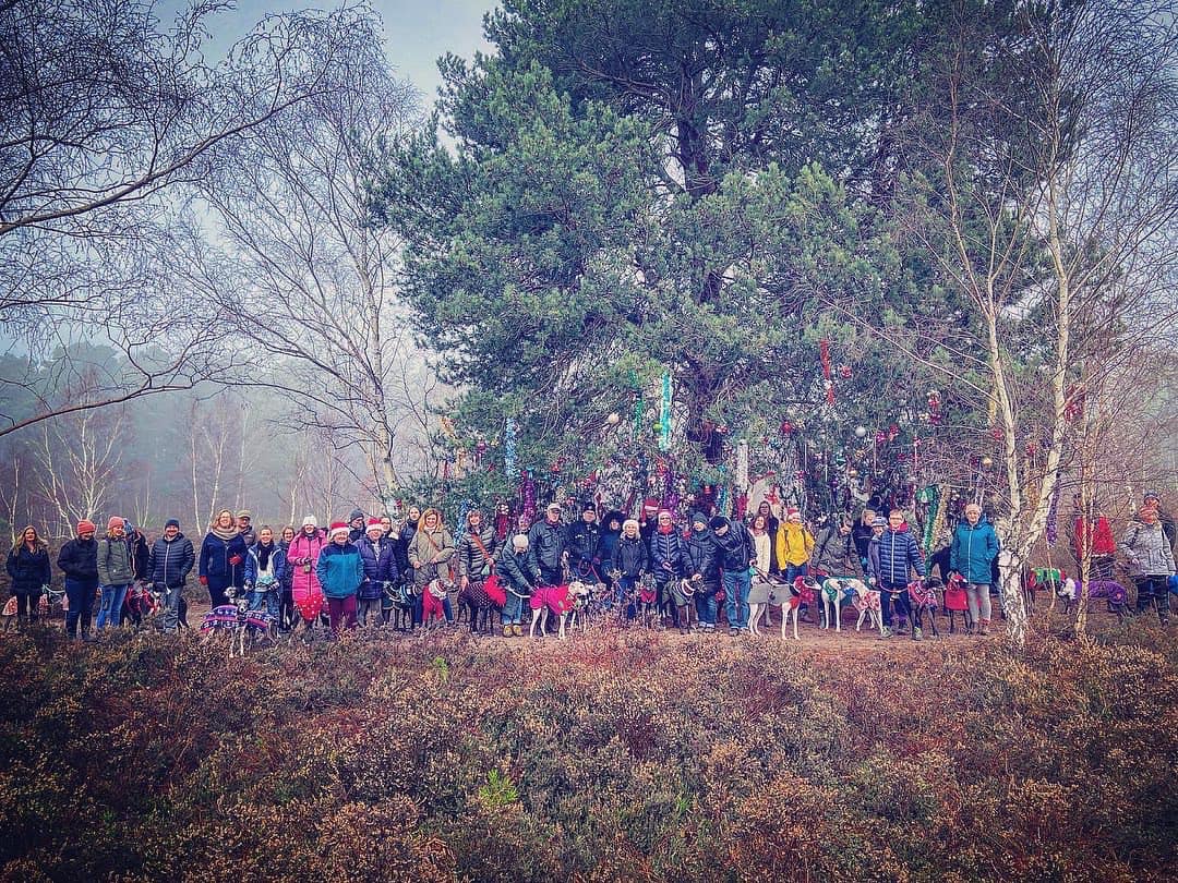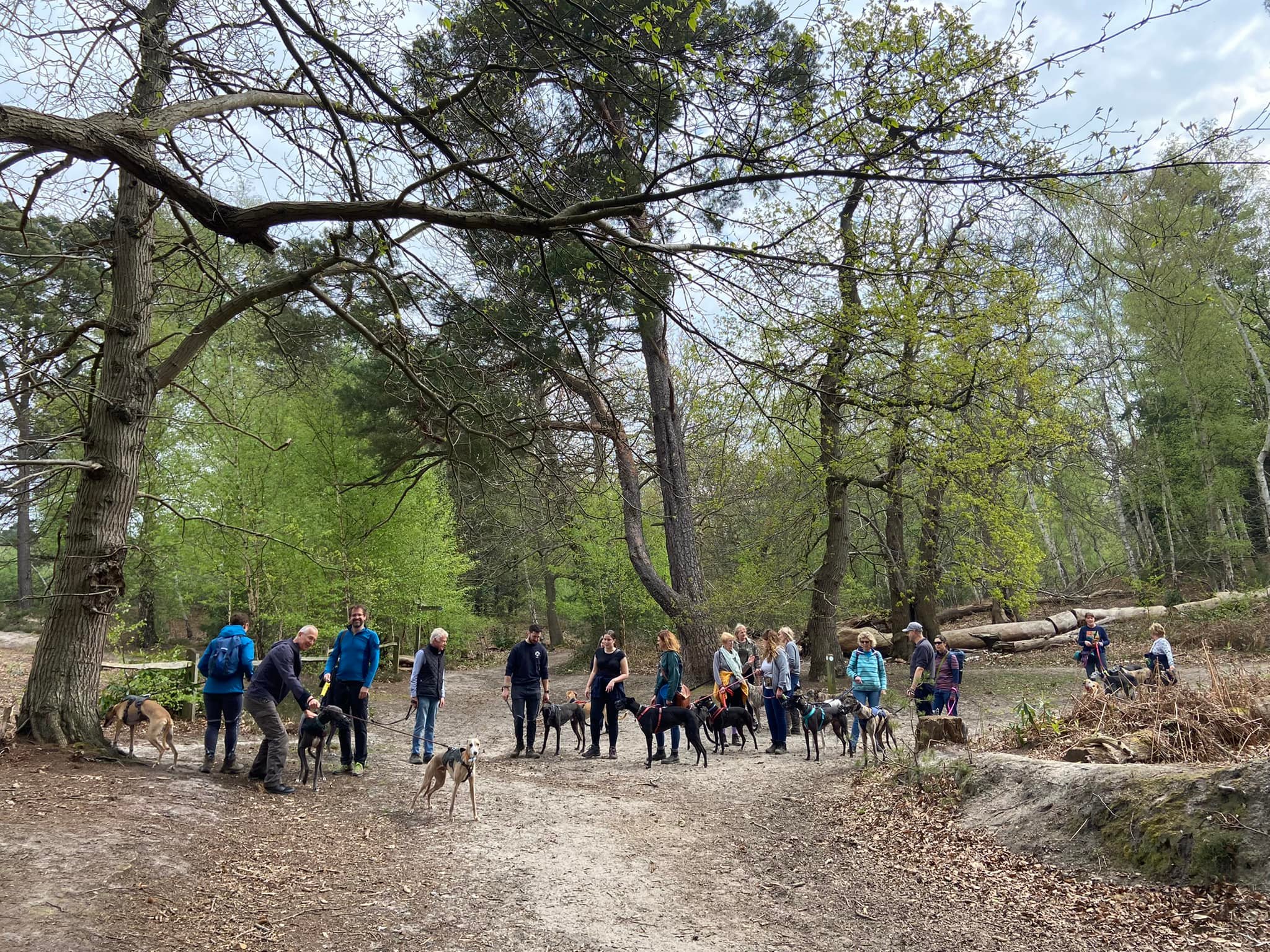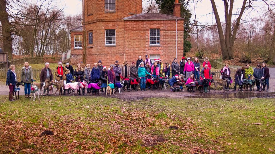 It goes through the trees and down to the Samuelson Mausoleum. At the time of writing this post (April 2022), the February storms had brought a couple of trees down partway along this path, but, these may cleared by Surrey Wildlife Trust at some point. Even if they don’t, none of the dogs with the Surrey Sighthound Walking Group had any trouble getting over them as the photos here show.