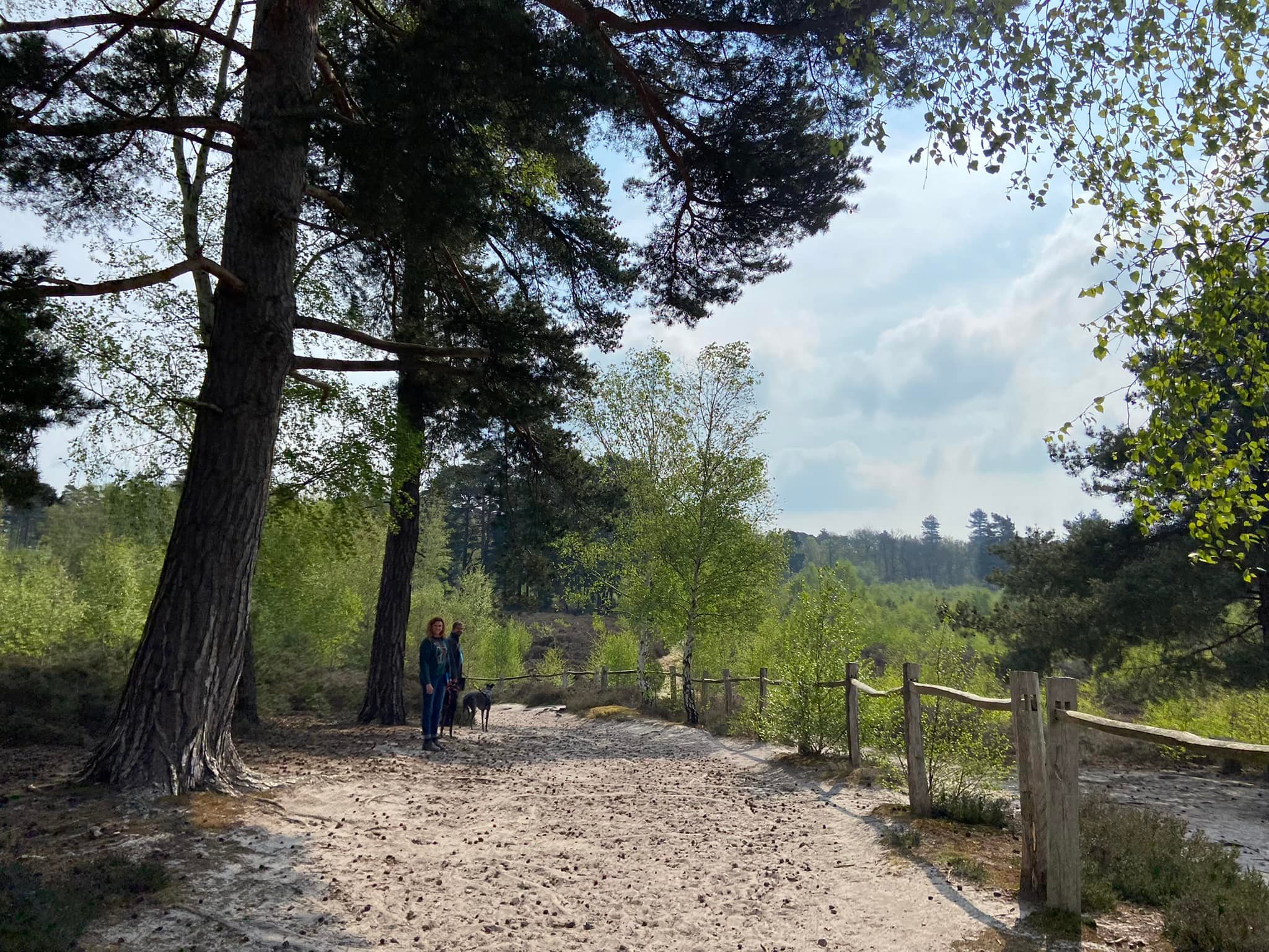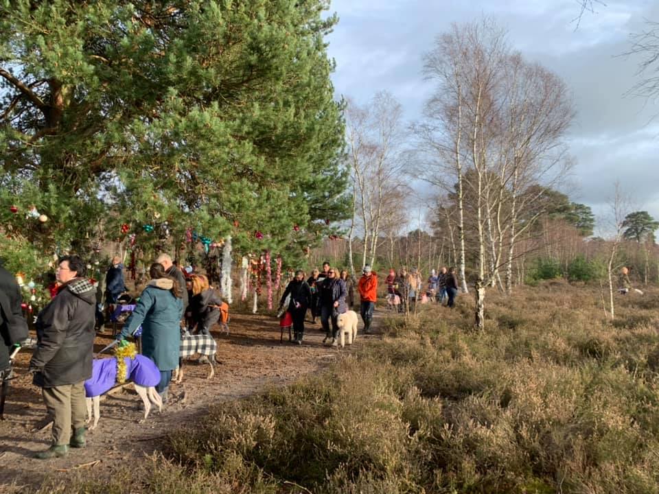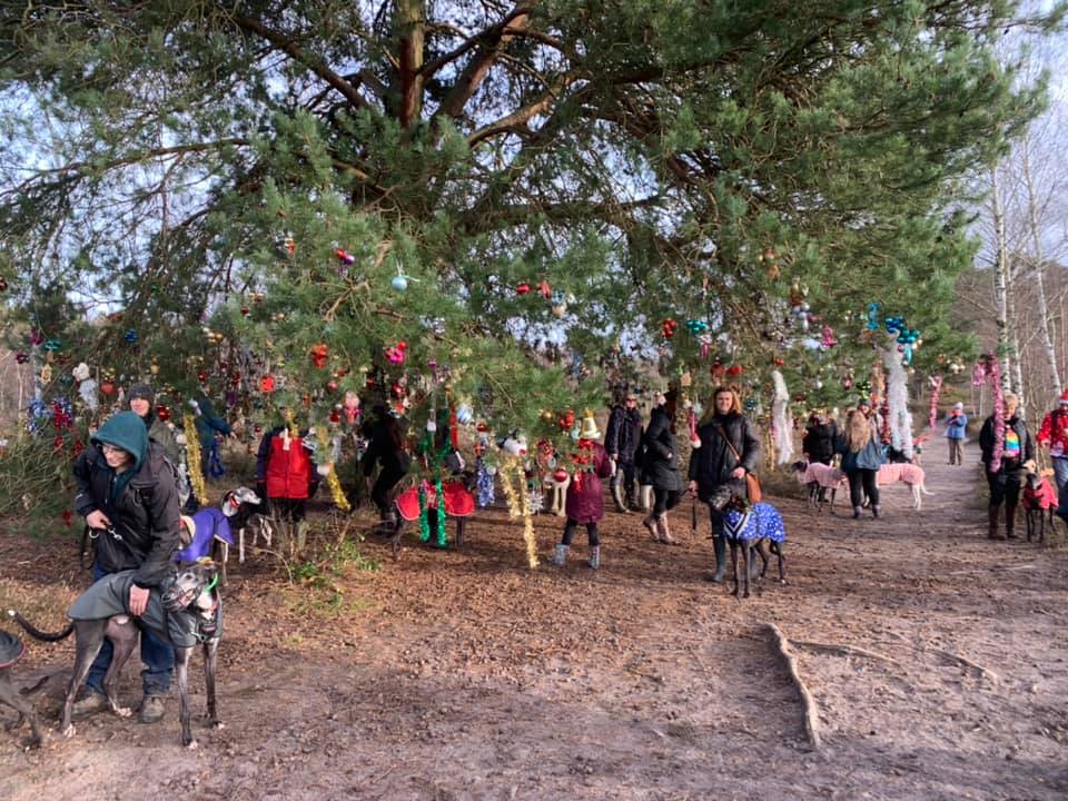 The path gets sandier underfoot and emerges from the trees at a big cross paths. Continue straight to the next big cross paths and turn left here. Shortly after this, you’ll pass a massive tree on the left side of the path – in December, this is dressed with tinsel and other Christmas decorations.
