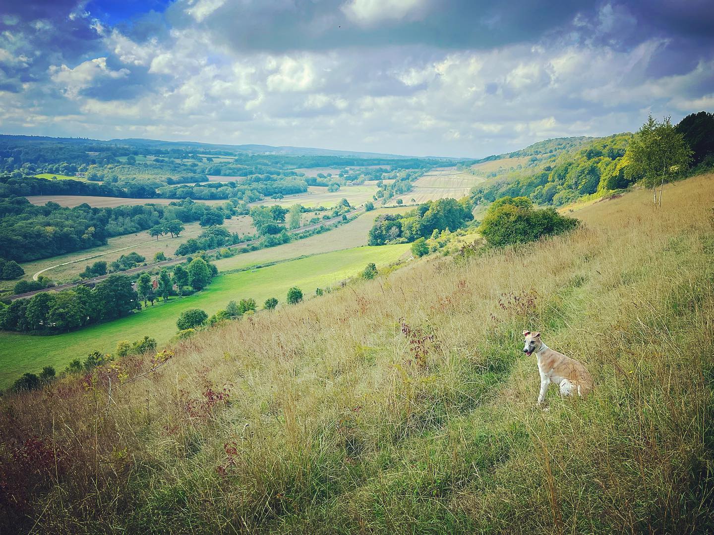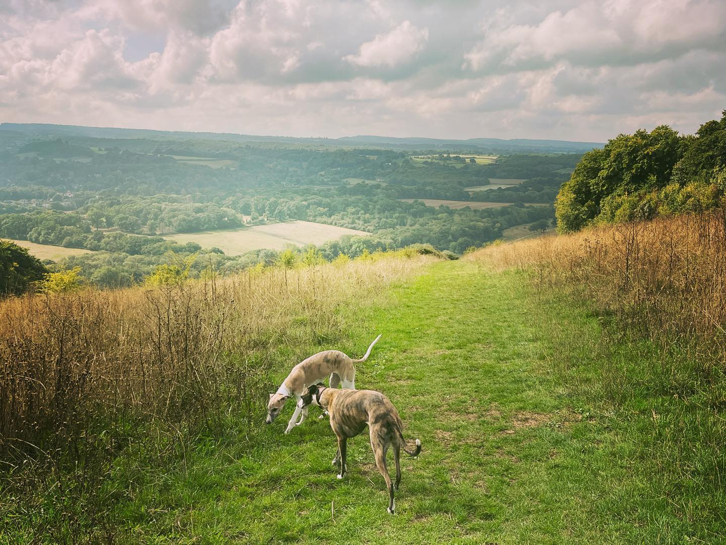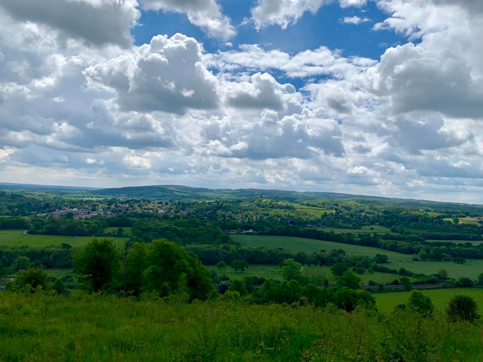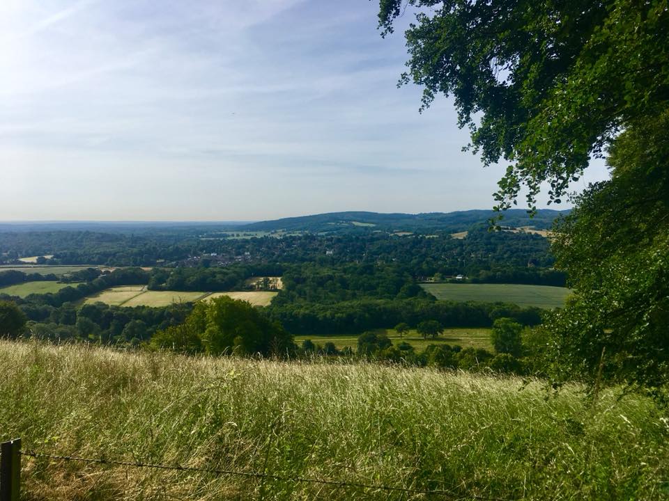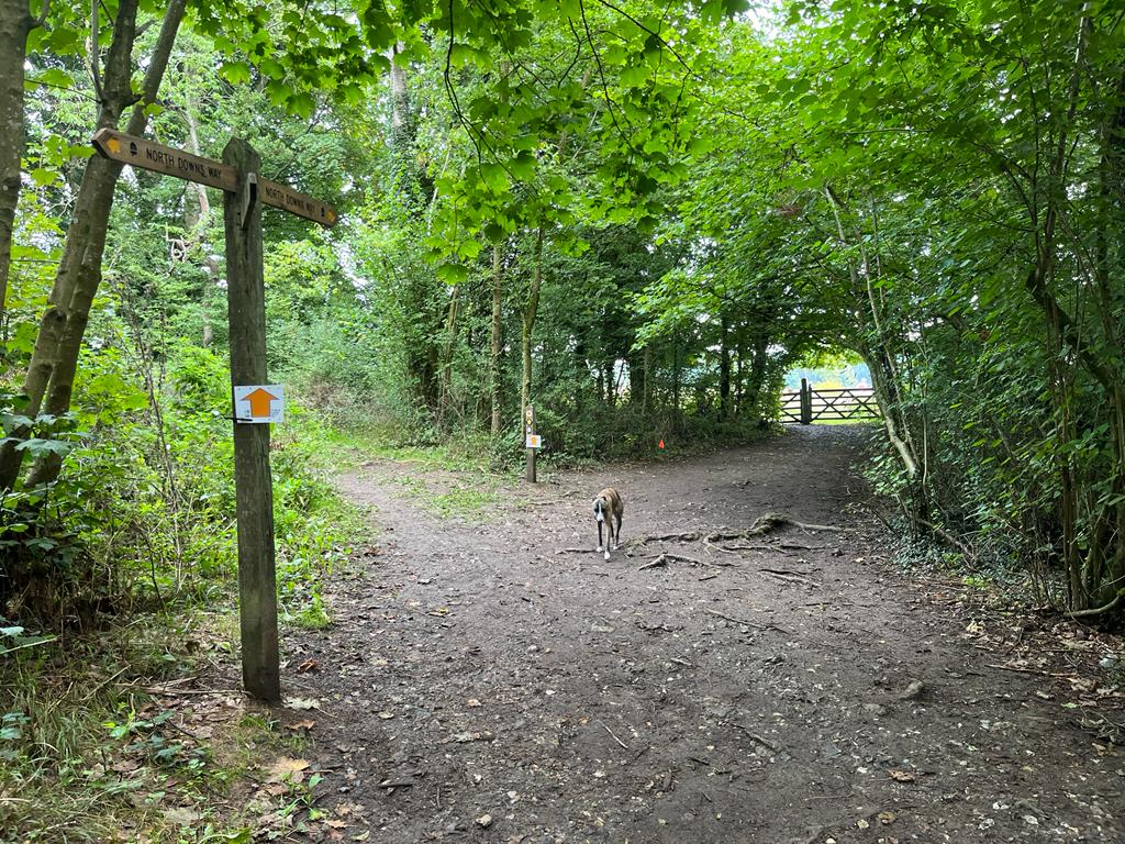 The path goes down a slope and comes to a cross paths where there is a small tree stump to the left of the path and a sign post for the North Downs Way to the right. Turn left here and if you look to your right, the woods give way to a stunning view.