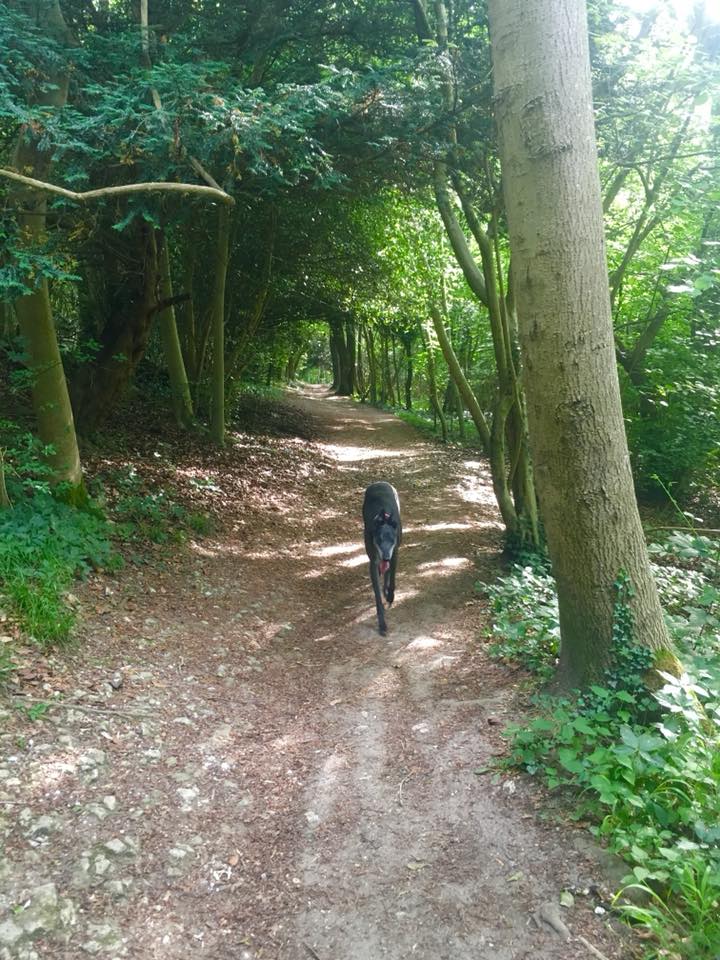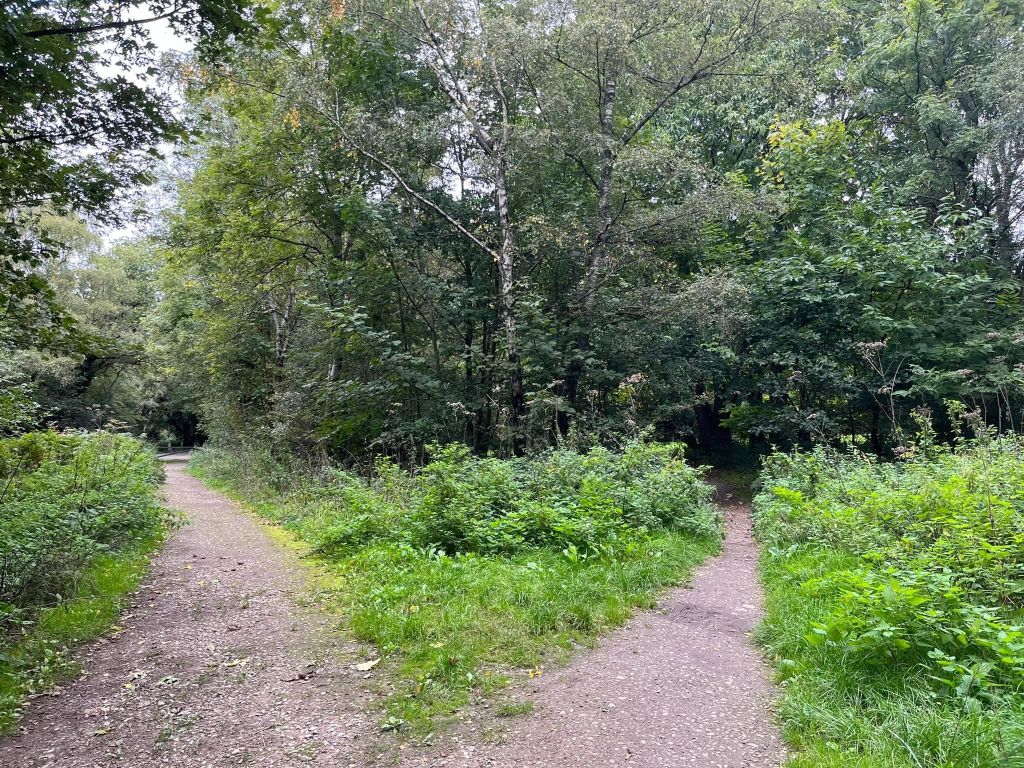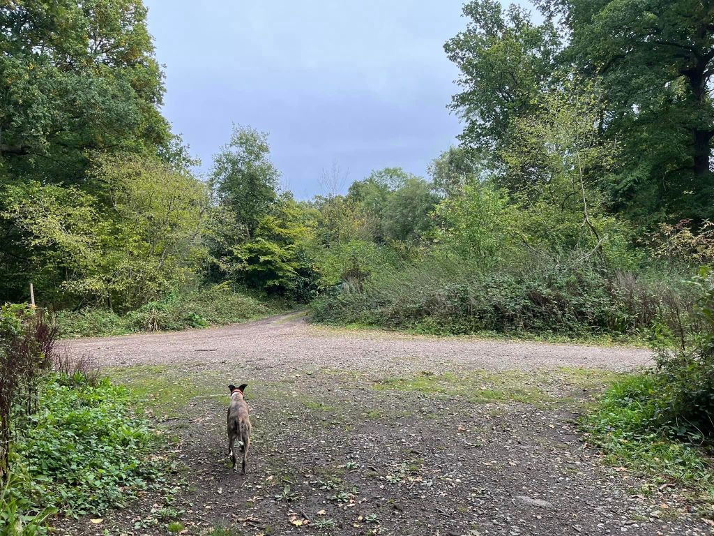 Go through the kissing gate and turn left. Almost immediately, you’ll be back at the cross paths with the tree stump again. Turn right here and go up hill. Sorry, it’s quite steep but this is a very short slope! At the top of it, you’ll get to a wide open cross paths. Turn left.