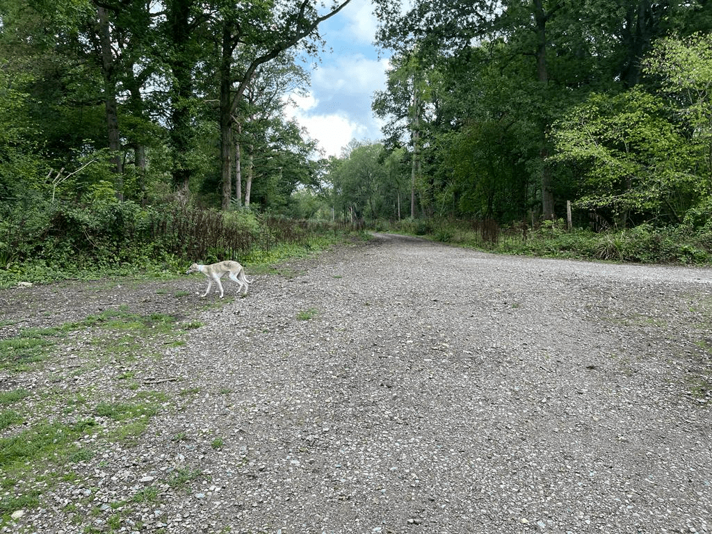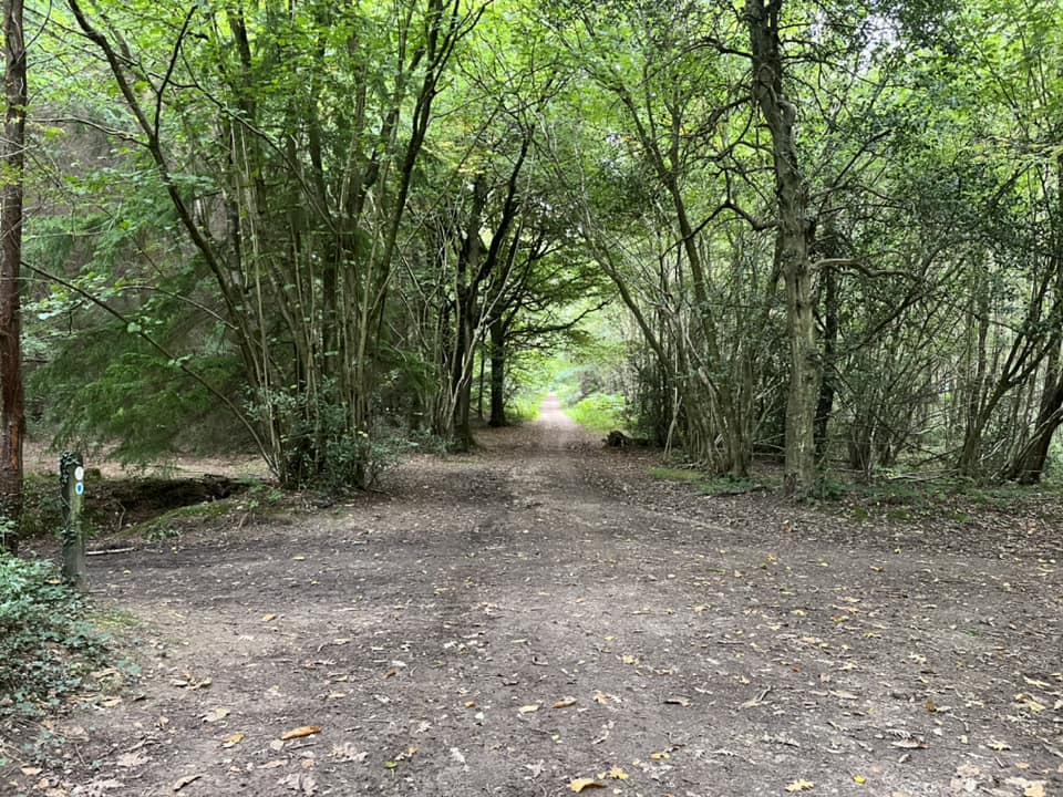 Follow this path all the way to a wide cross paths with a stony track and a green sign for the Scouts’ campsite in front of you. Turn right.