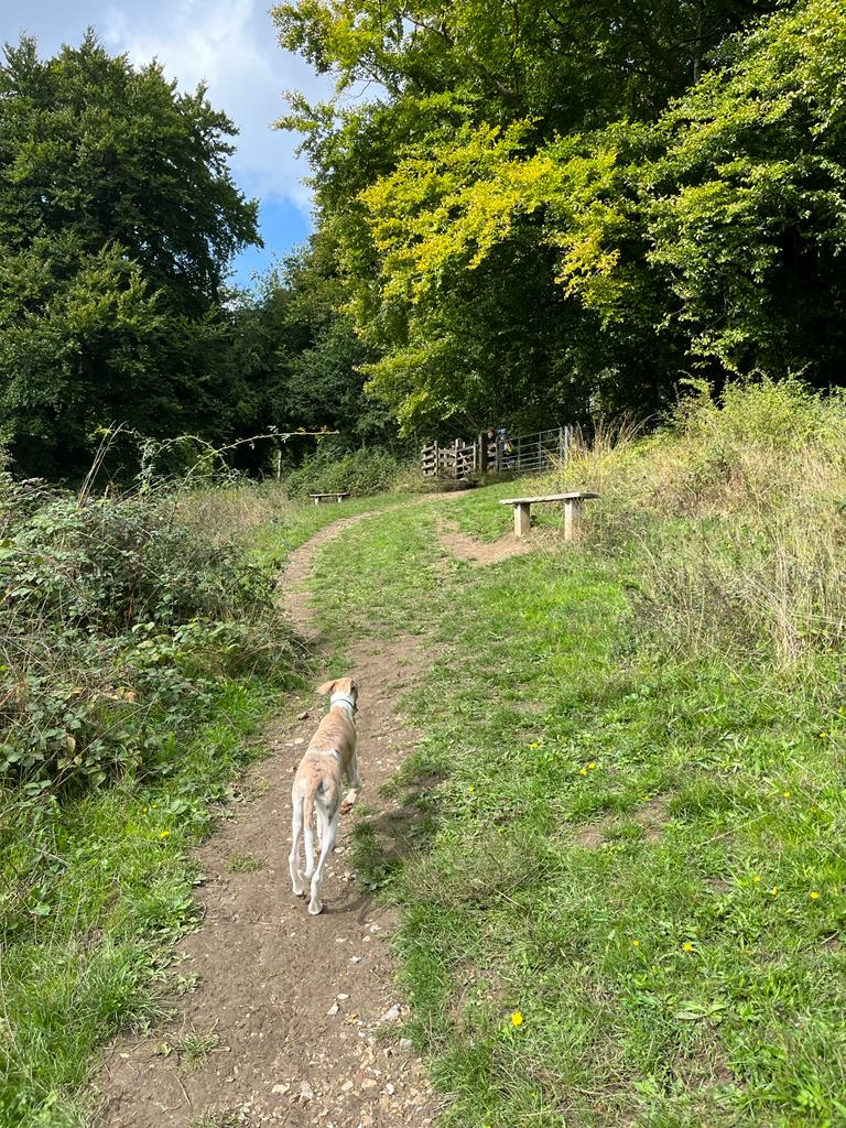 Keep to the right along the fence line and pass a bench at what I can only describe as “a humpy bit”. Shortly after, you’ll pass another bench – just keep going. The slope does get a little bit steeper. Then it’ll bend up to the fence line at a metal gate with a wooden kissing gate next to it and benches either side of that. You may recognize where you are as you passed here earlier (and probably paused to admire the view when you did so).