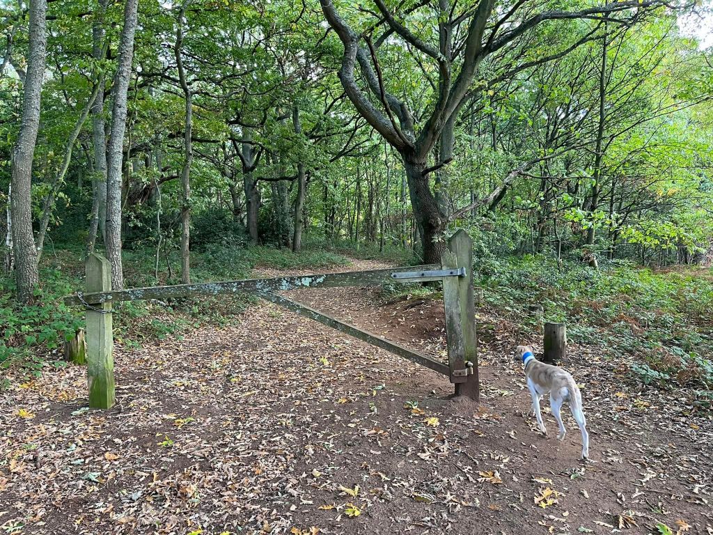 This small path winds up and down through the woods. Ignore any little paths that come off on either side. Pass another marker post (this one to the right of the path). Keep going straight ahead at the big tree where there is another wooden gate to the right. Follow your path down the dip and back up again.
