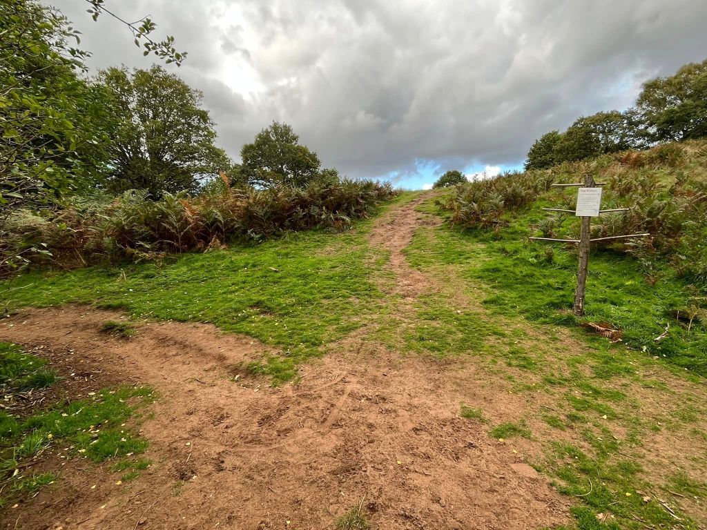 Follow the path up to the marker post with the three arrows on it and continue straight ahead here a few more paces up the hill to the T junction where there is yet another marker post. Turn right here. Little fact for you, you are now apparently on the site of the ancient Hillbury hill fort.