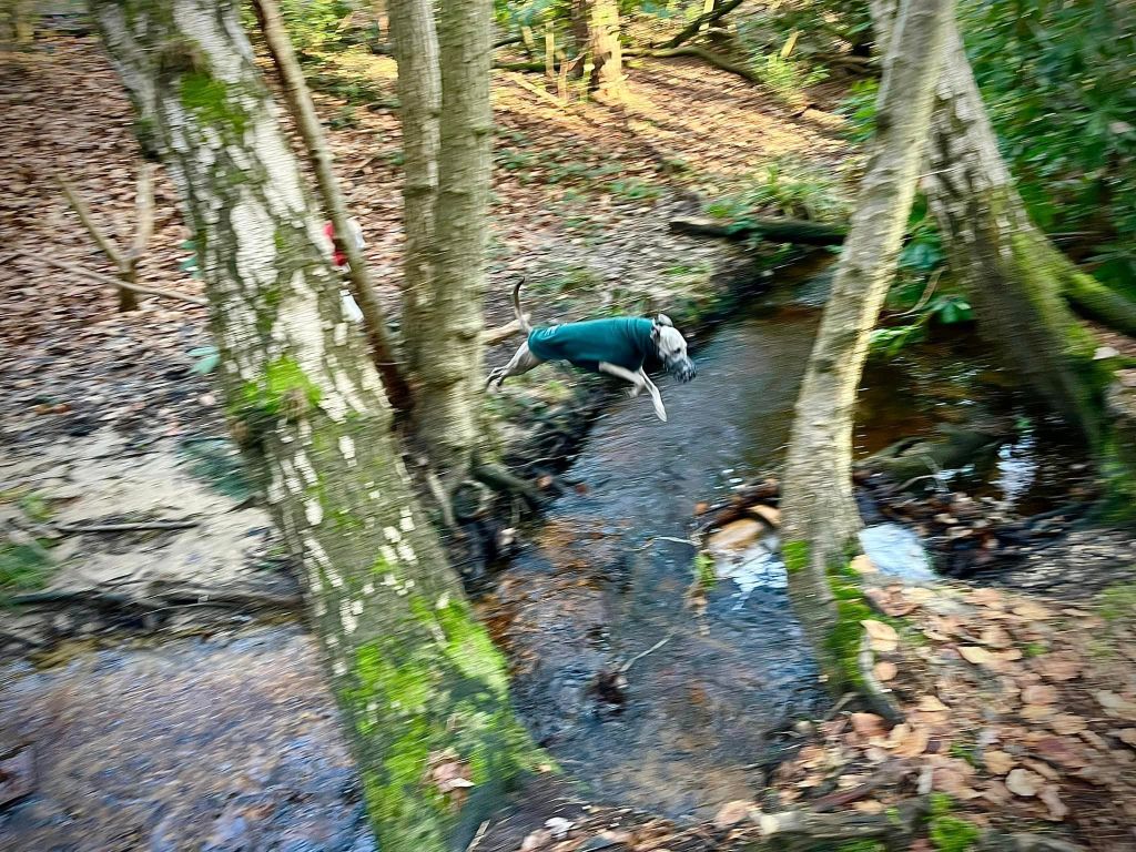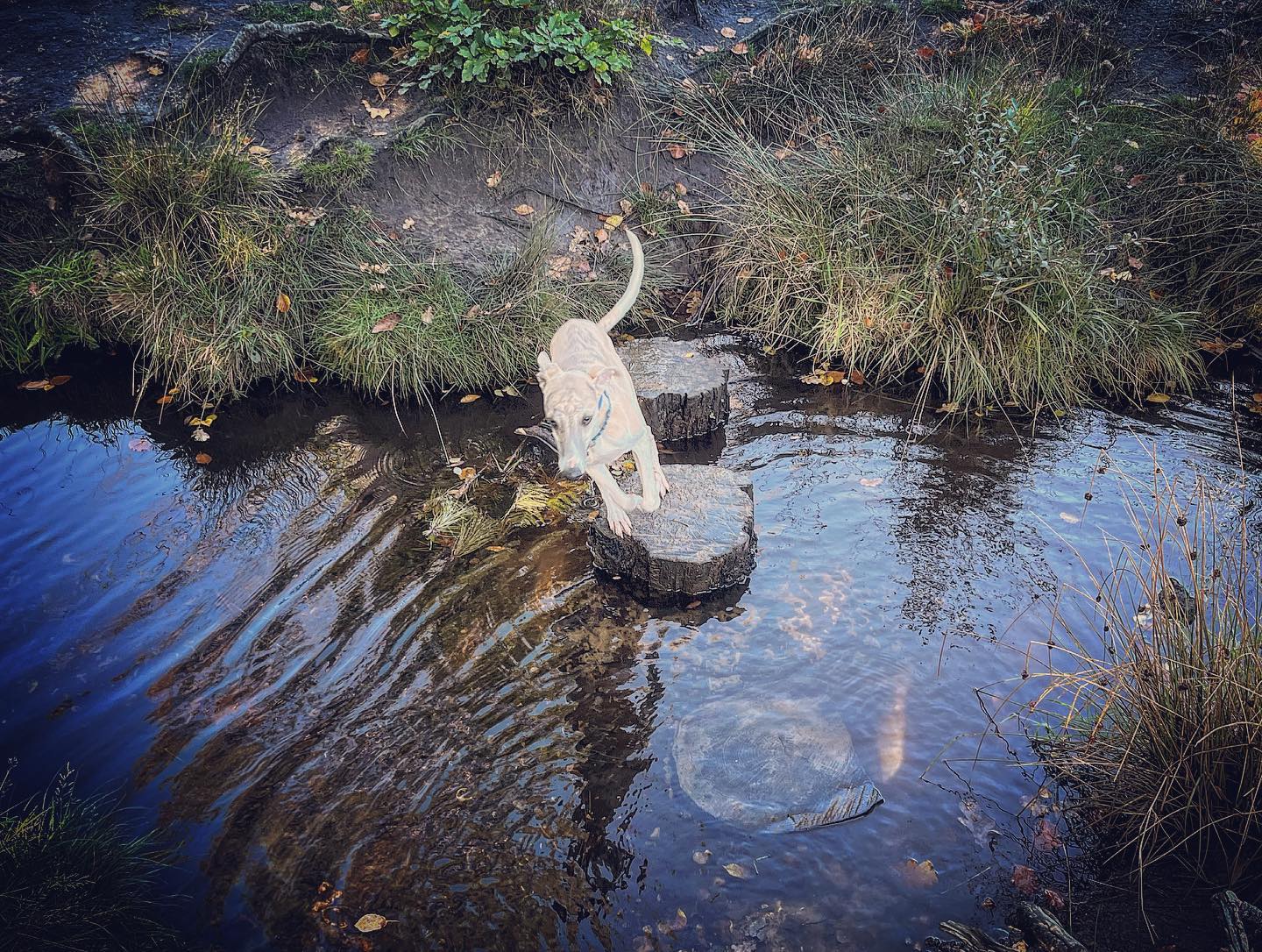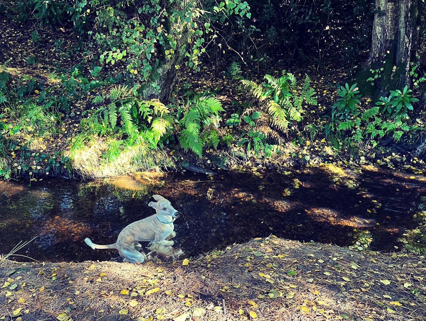 At the first cross paths, continue straight ahead, then ignore the next wide path off to the left. Instead, continue ahead and your path will curve round to the left. It narrows and goes through shrubs, then bends to the left and runs alongside a small stream. It’s quite fast flowing and the water is beautifully clear.