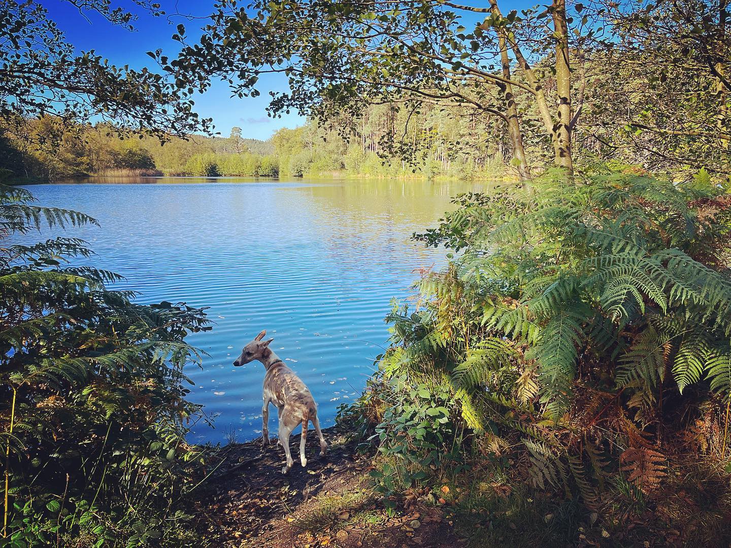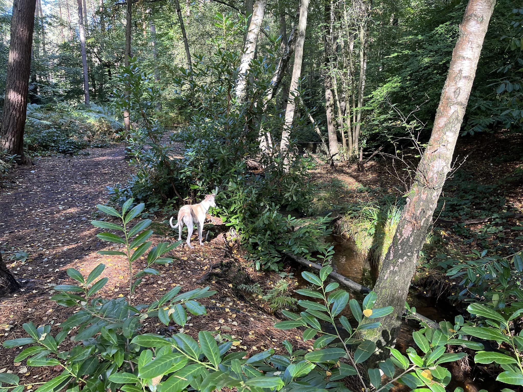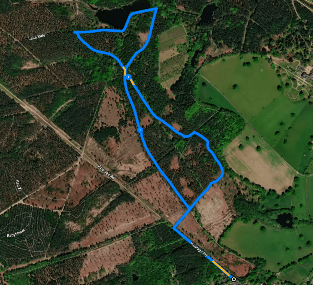 Here is a Footpath app route for Swinley Forest. Also on AllTrails. It starts in Vicarage Road behind the church, then takes you through woods alongside a little stream. The route crosses the boundary between Surrey and Berkshire and then takes you alongside Rapley Lake, before heading back on main paths. The route looks a bit like the outline of a whale – this is unintentional.