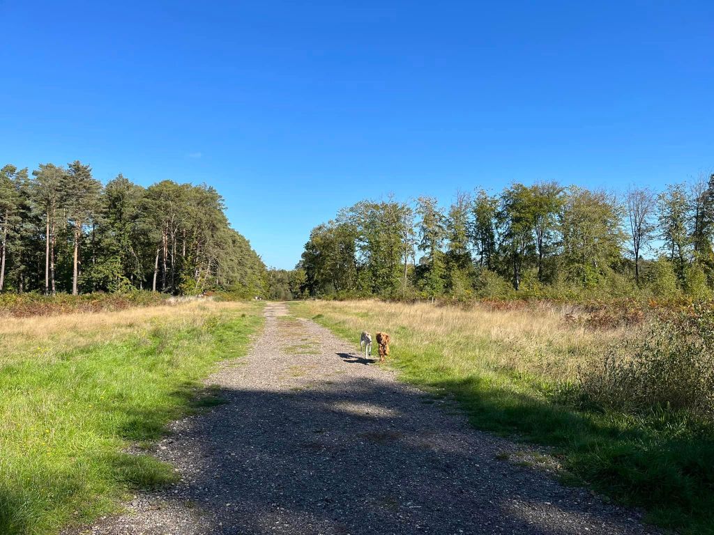 Walk down this long, straight main path, which briefly goes between two wooden fences as it crosses a stream. Take the next path on the right, which is next to an electricity pylon. It’s a wide path and quite an open grassy around it, with woods beyond that.
