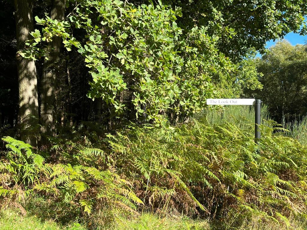 At the wide cross paths, which lie on the county boundary, continue straight ahead in the direction indicated by a signpost that is in the ferns on the right. This is marked “The Look Out.”