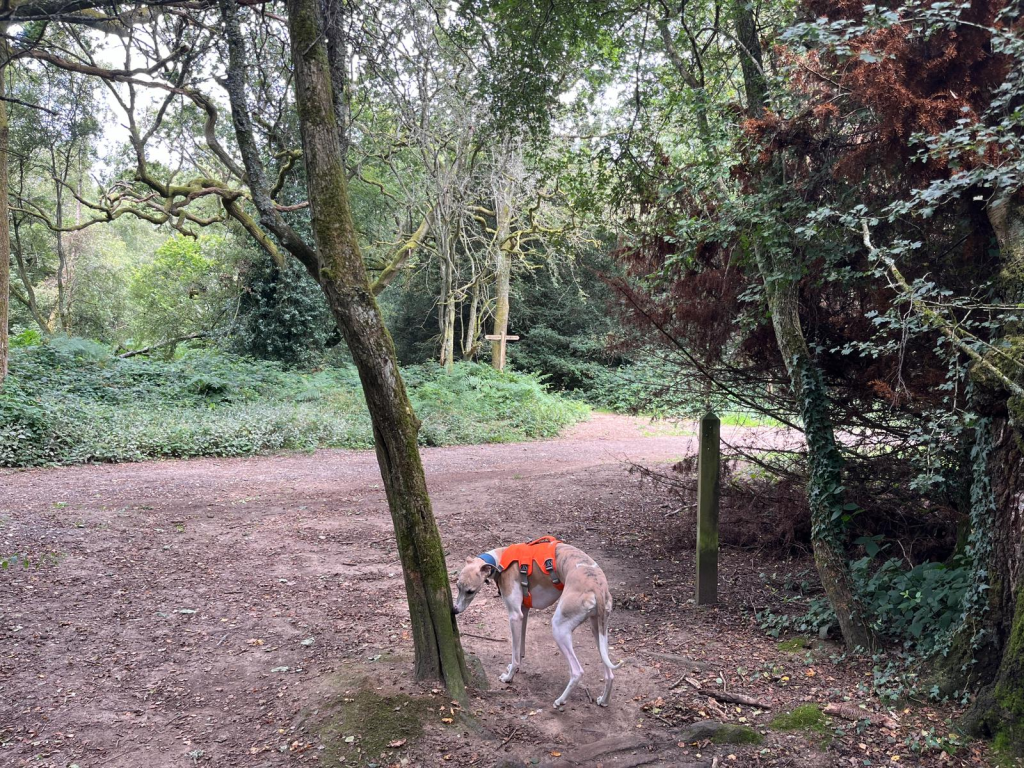 It’s surprisingly open under the trees but bear round to the right of a small stump.