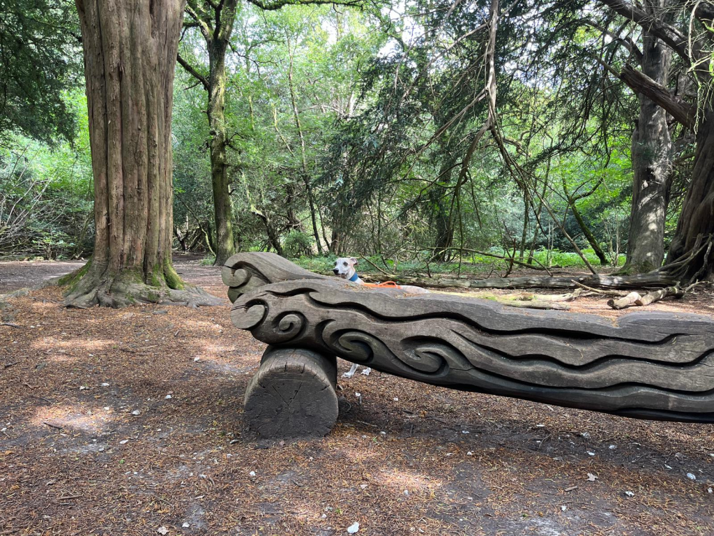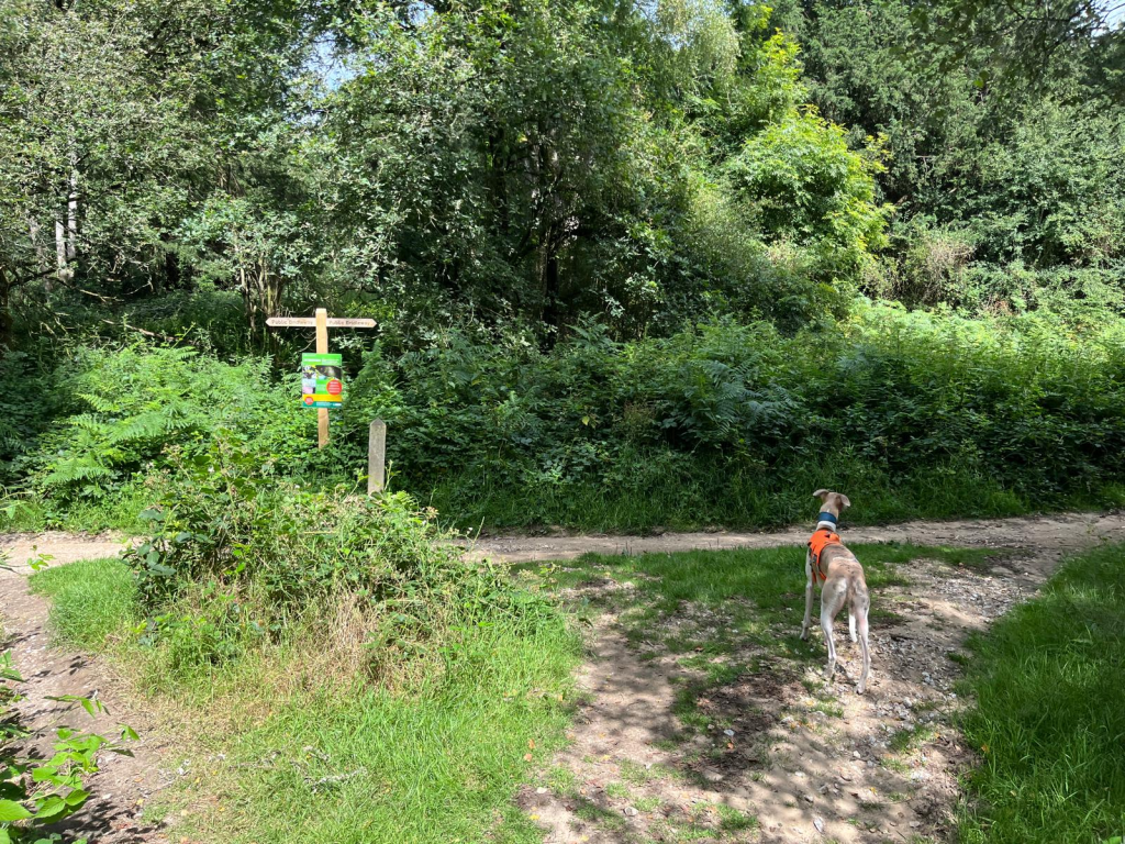 Go straight across the main track towards the signpost and continue ahead in the direction of the permissive horse ride. This is a really lovely sheltered path. Part way along, you’ll pass an ornate bench.