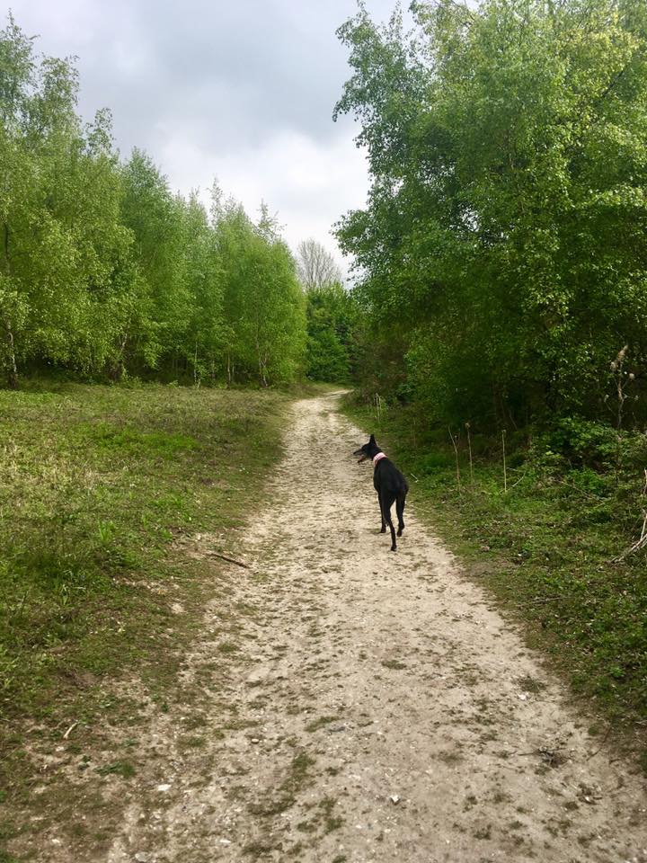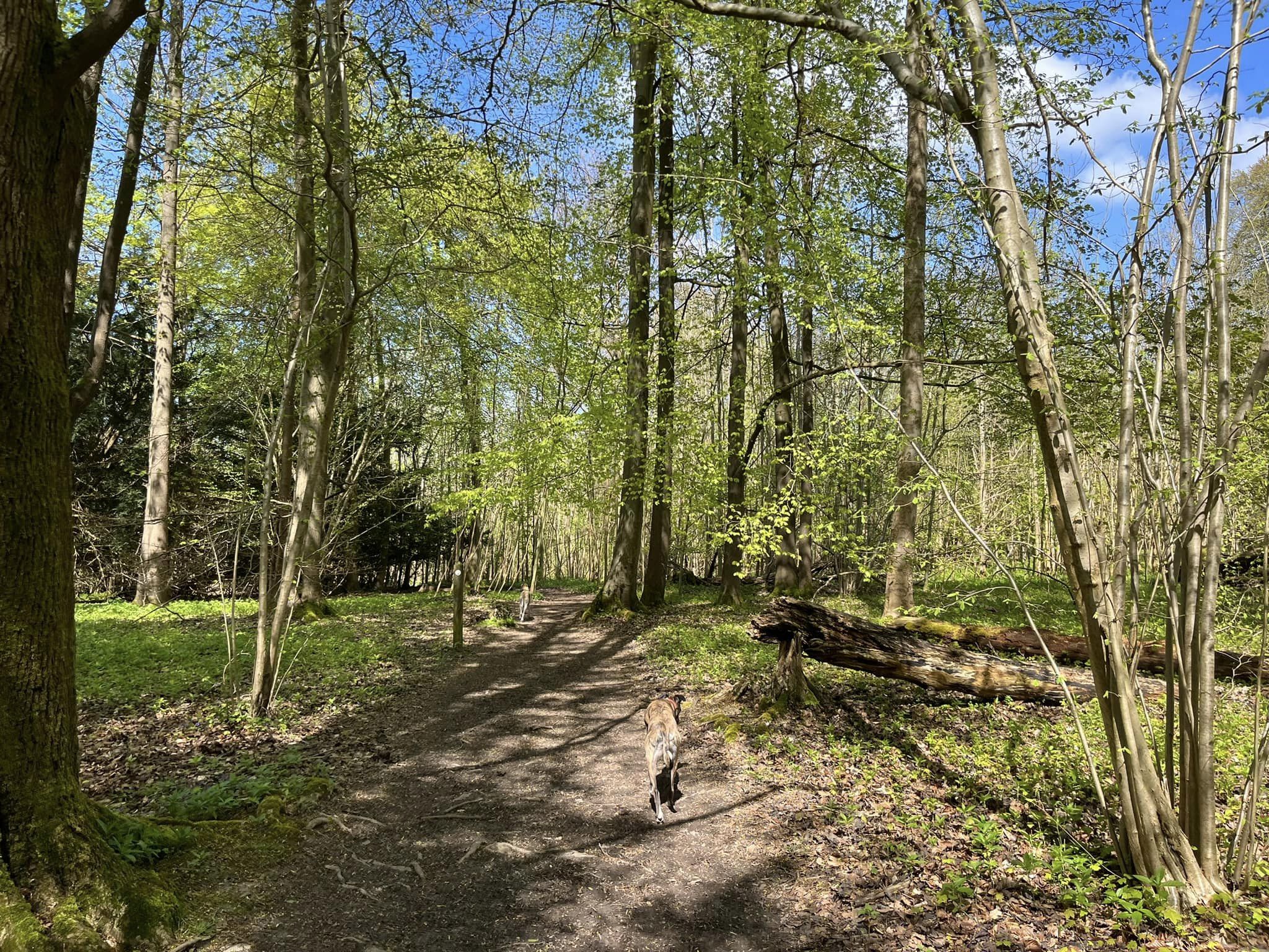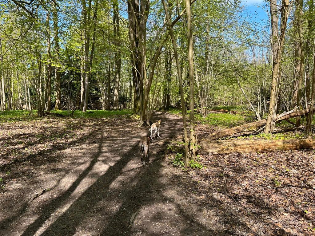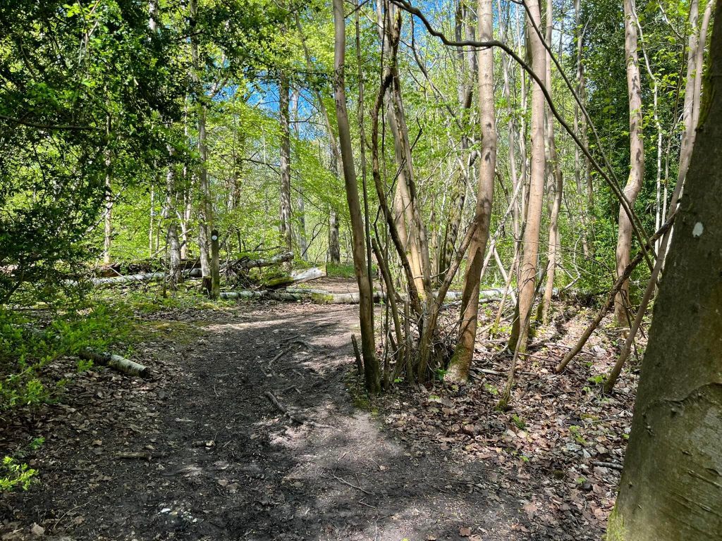 This path weaves through the wood, with an open field to your right. Just stay on the path through the trees. After some way, you’ll notice an open areas through the trees to your left too. Again, keep on going.