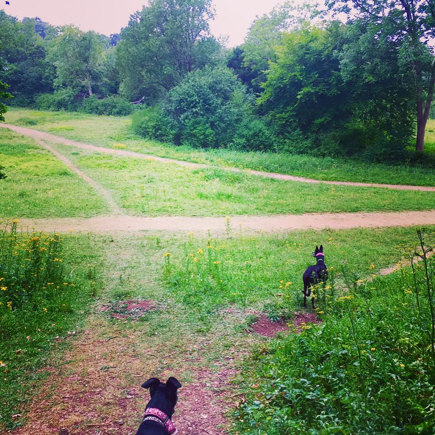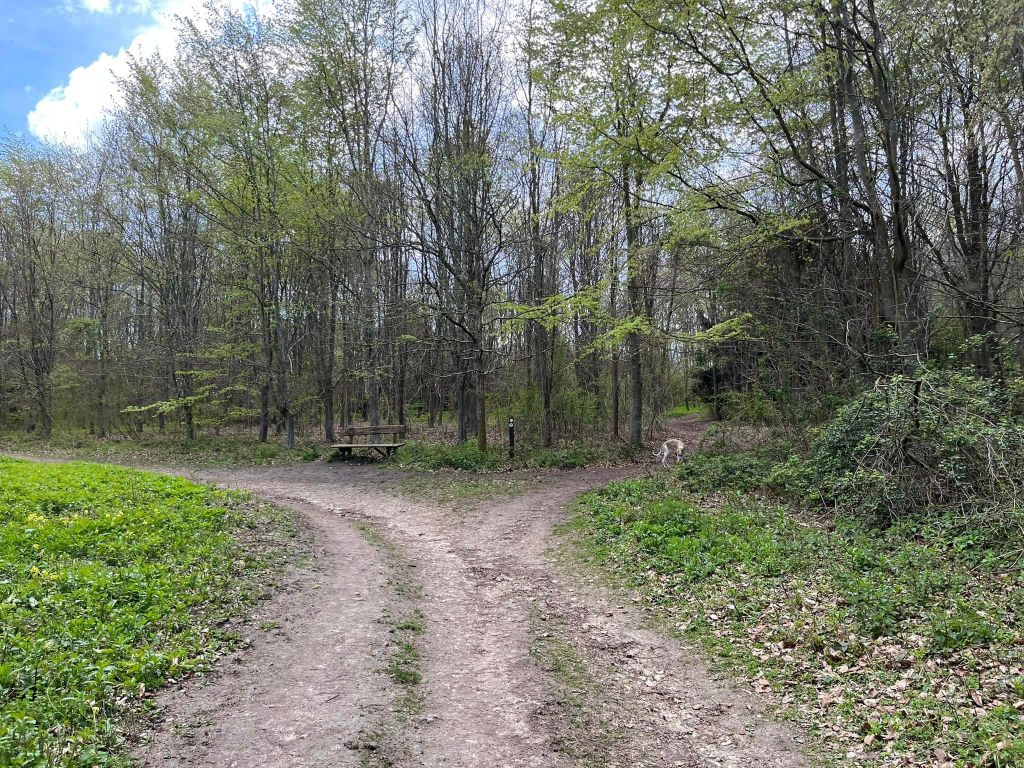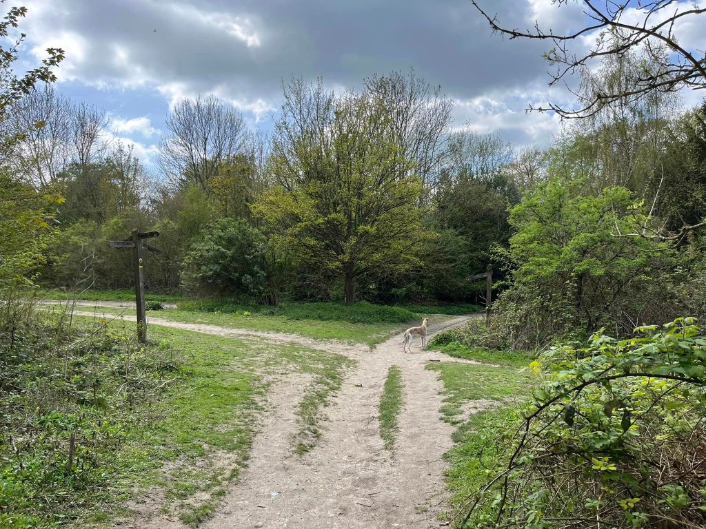 When you get to the T junction, turn left. Ahead of you, there’s probably a mess of fallen tree trunks and branches – unless it’s been cleared, which I doubt as it’s been here years. So, if it’s still blocked, there’s a little path to the right a bit before the blockage. Go down this teeny tiny path until you get to the first cross paths. Turn left and it’ll head slightly uphill. When you get to the T junction at the top of this little path, turn right.