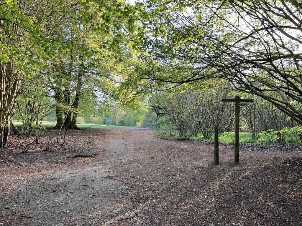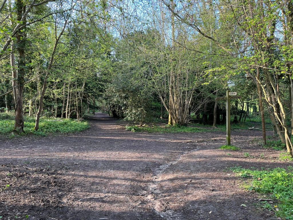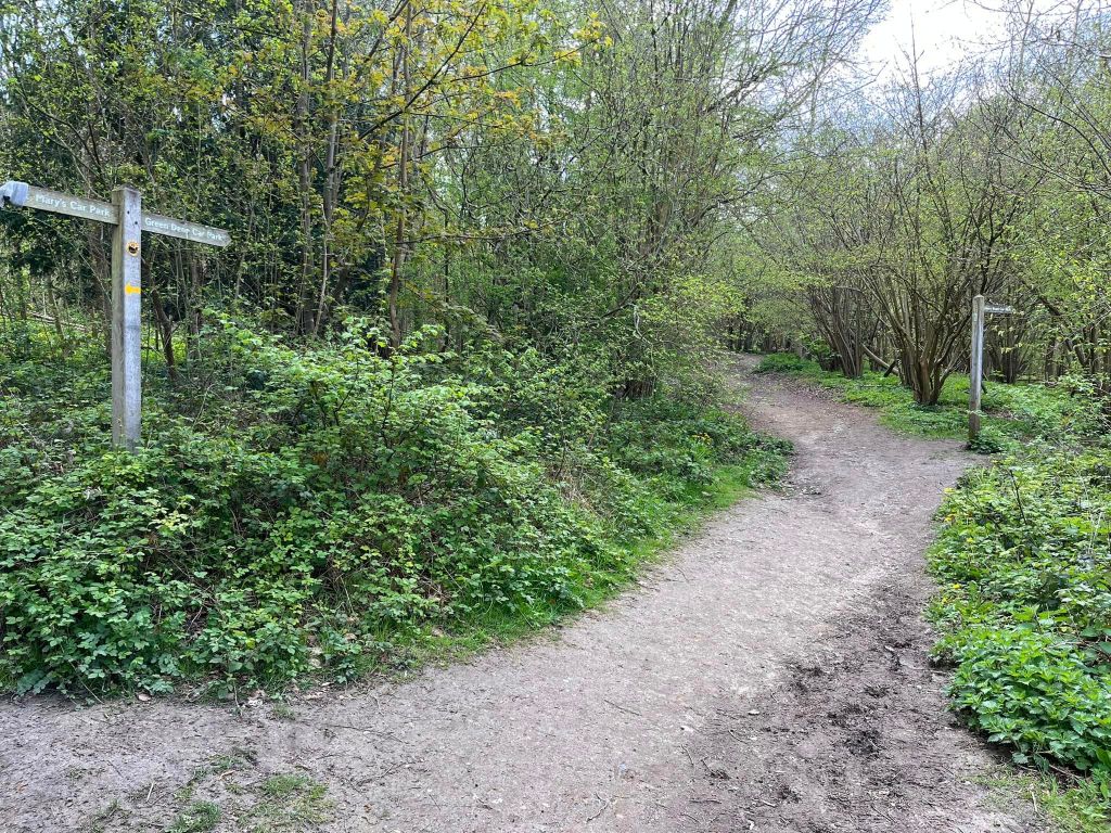 You’ll come to a junction of paths with two finger posts, one to the left and one to the right. Turn left here in the direction indicated by the finger post ahead on the right as the woodland trail.