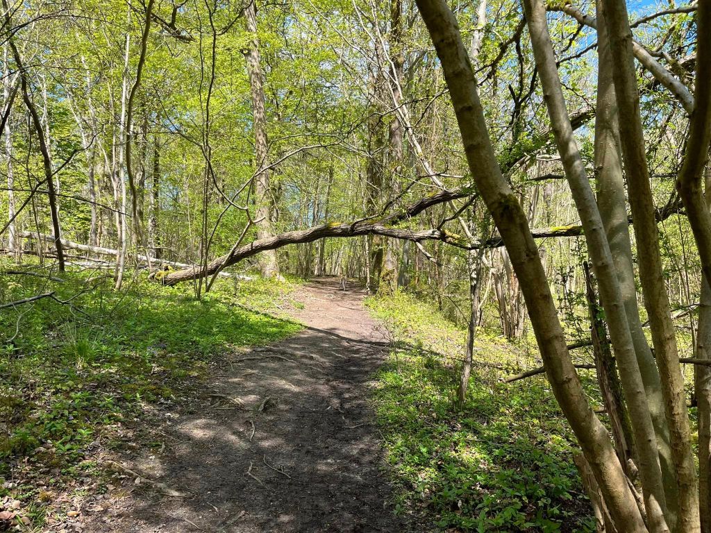 This little path gradually heads up slope and to your right, through the trees, you’ll see a small open grass area. Keep going and just at the end of this open area, you’ll reach a small T junction. Turn left and continue up slope, then ignore a path off to the right and keep up the hill, passing a marker post and going over a fallen silver birch tree, then under another tree that has fallen across the path.