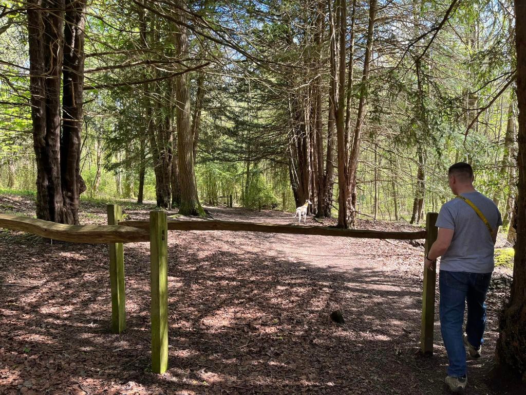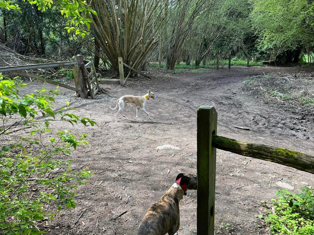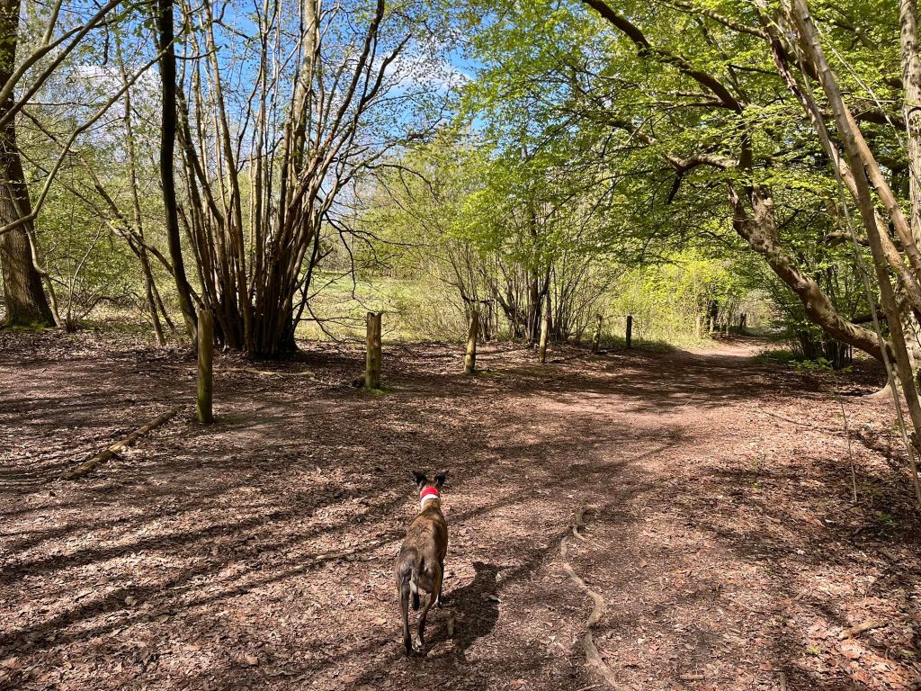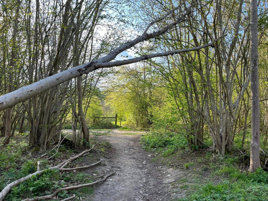 As you walk along this path, to your right there are the paddocks and a few farm buildings. To the left, quite a lot of the trees that were here have been felled due to Ash Die Back disease weakening them and making them unsafe. The path you’re looking for to the left used to be pretty clear, but (certainly at the time of updating this post – July 2024) it’s not as obvious as it was. Around the point where there is a large metal barn building over to the right, you should see a small/narrow path winding off to the left towards the woods. Follow this to the trees and down a tiny dip, under a tree branch that stretches across the path and into the woods. It’ll wind down to a small T-junction.