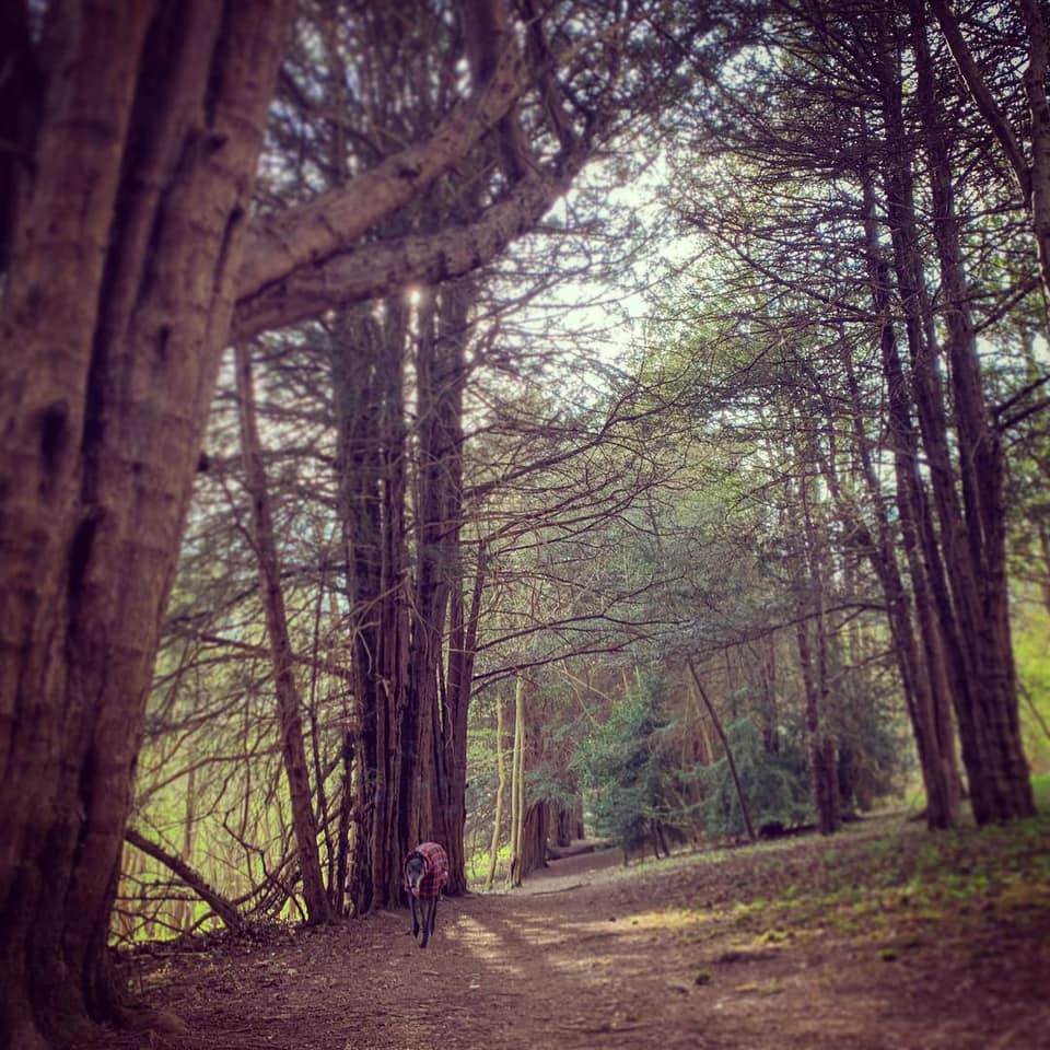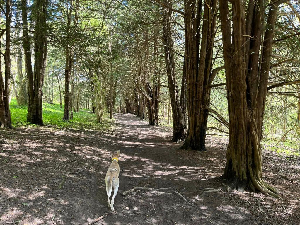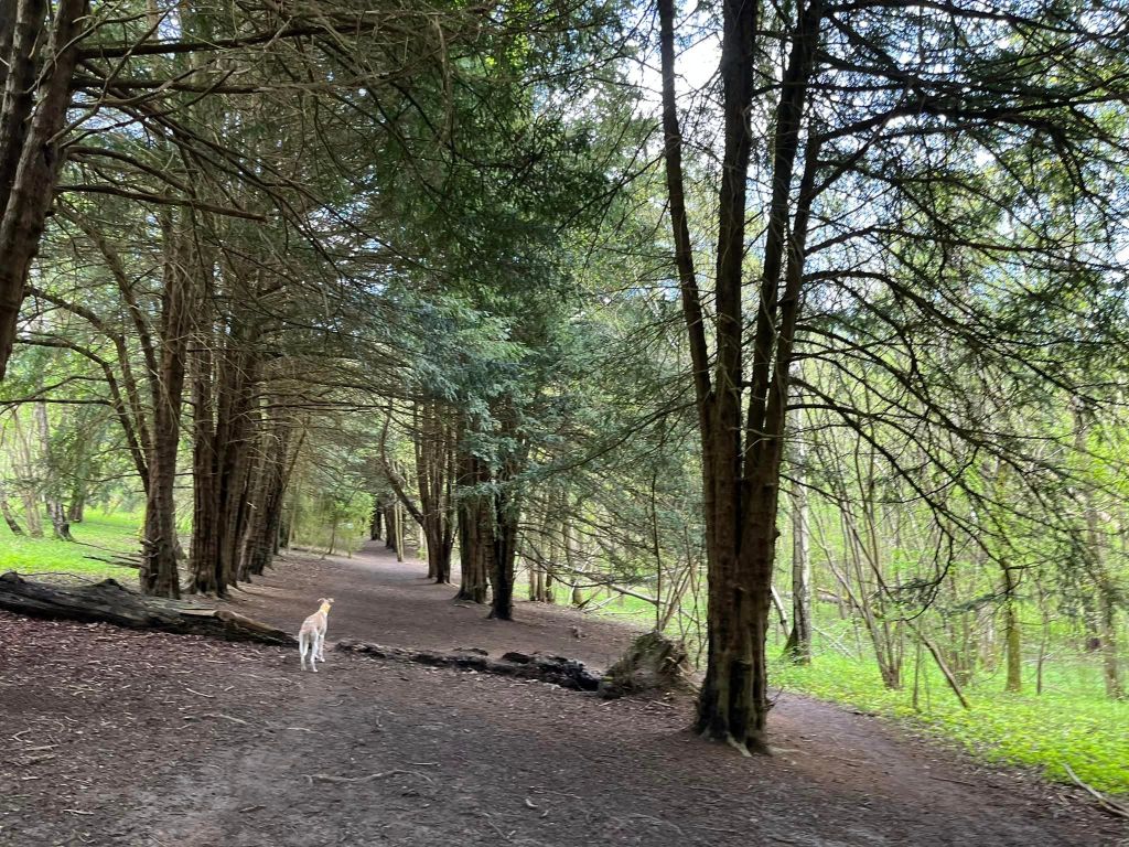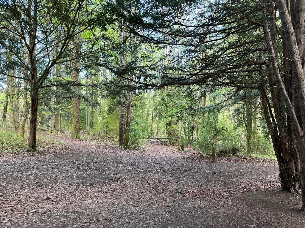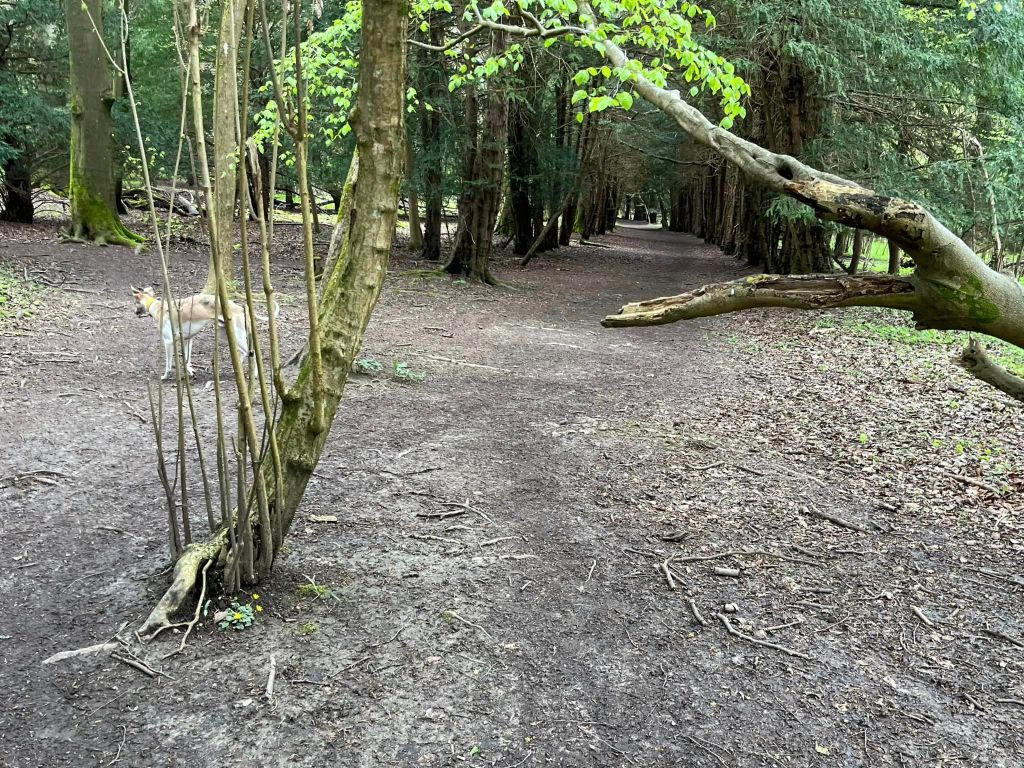 You’re back at Yew Tree Walk, but at the “start” of it (where at the beginning of the walk, you joined this path halfway along.) Walk along between the yew trees and cross over a fallen one (or go around it to the right.)