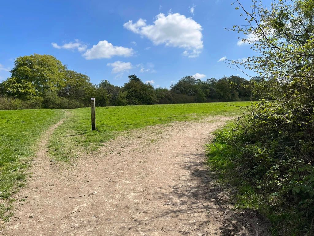 At the end of the meadow, by a bench, the path heads back into a patch of woodland and then emerges out at another meadow (with a bench to the right this time next to a marker post). Continue straight ahead on the main path through the meadow.