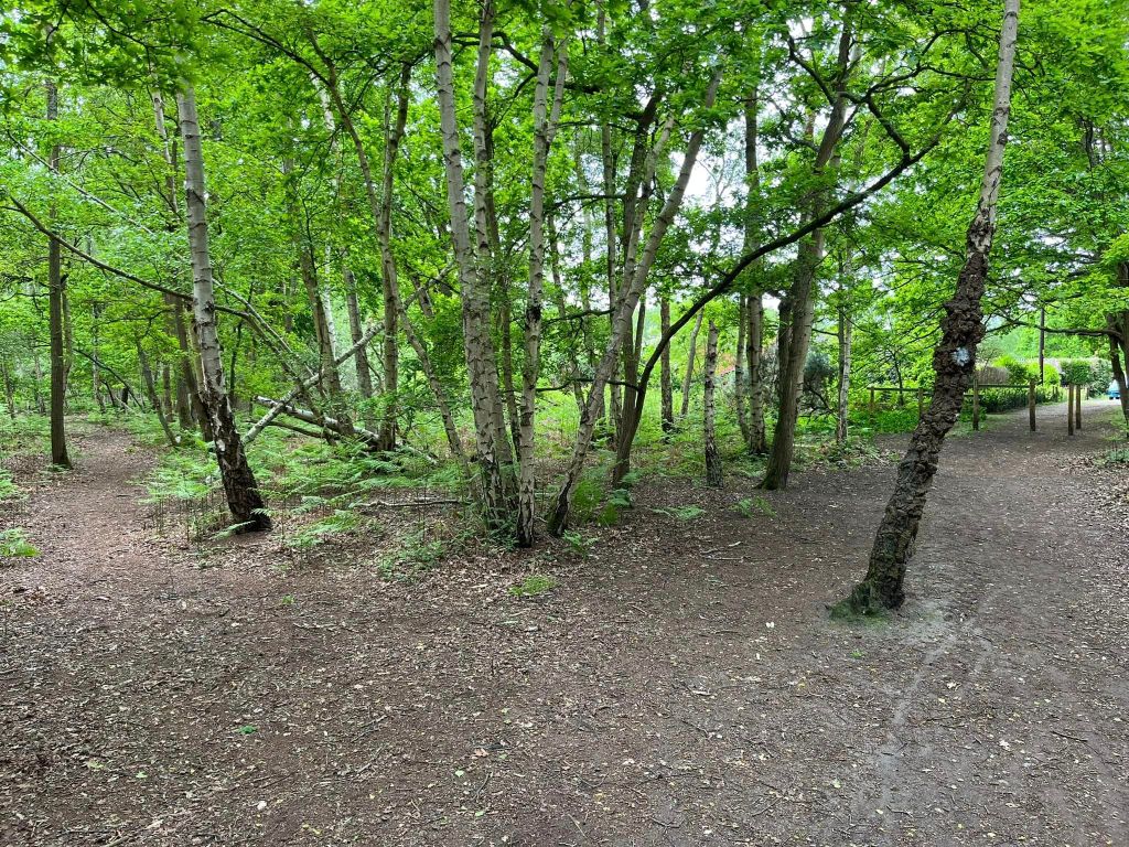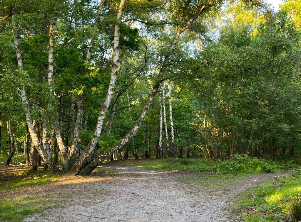 The path, after some way, passes a stick hut on the right and then comes to a junction of paths where there are two options directly ahead. Take the left, more sheltered option and follow this to the next cross paths where there are two silver birch trees growing out from almost the same spot to create a V shape. Turn left here and head out from the shelter of the trees through the open heath.