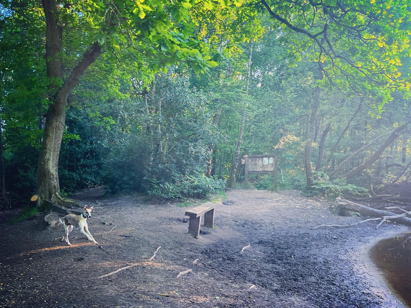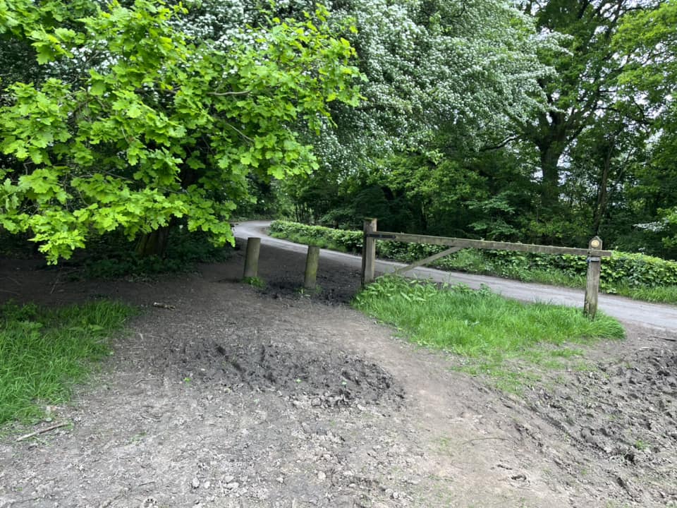 Continue past the water (on the right), going over the wooden plank bridge and taking the path to the left of the wooden information board and a holly bush. Follow this to the vehicle barrier, pass to the right of it and then turn right.