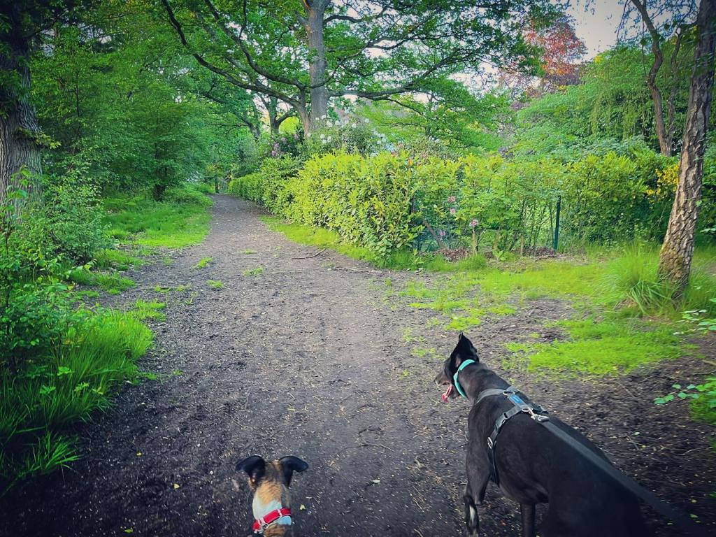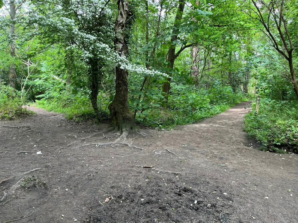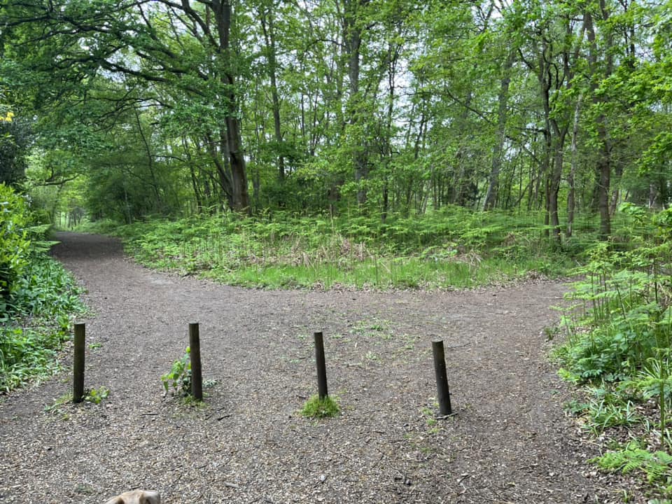 This is one of the main perimeter paths (and you may be able to hear traffic on Salt Box Lane, which runs parallel over to the right). Follow it to a big junction of many paths, where there is a bench on the right. Keep going straight here, taking the path ahead that is closest to the bench. It has a little tree growing right in the middle of it, slanting slightly to the left.