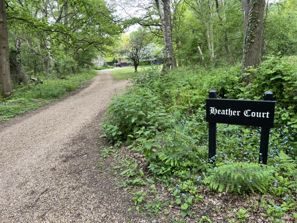 Pass these two posts and turn left onto the lane, which curves around to the right and goes past Woodcorner Farm (on the right.) The path will continue towards the right at a gravel drive off to the left, with a black sign for Heather Court, which used to be owned by former Prime Minister Lloyd George. Follow the gravel driveway. The house that is Heather Court is ahead on the left, but keep to the right-hand side of the driveway and head towards four small posts.