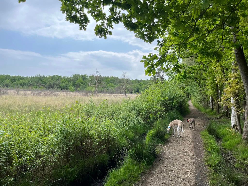 When this comes to a cross paths where ahead you can see two marker posts, turn right and pass between the silver birch trees.
