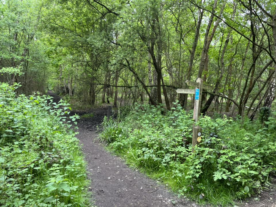 Shortly, you’ll join a main path at another post – turn left in the direction of a clump of silver birch trees (there are several trunks growing up from the same spot and these are just to the left of the path.) These trees are also right next to a post and a fork – ignore the smaller path going off to the right at this post. Just keep left on the main path towards a marker post with a white arrow on it.