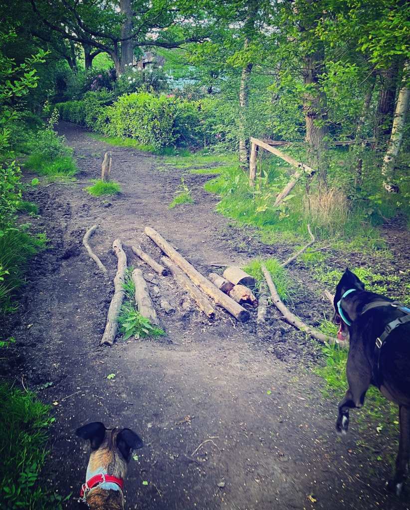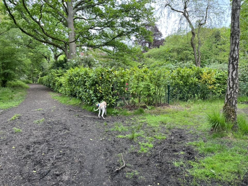 Follow this to where there are a load of tree branches on the floor in the mud (for walking over when it’s really wet here). This is just before you get to the boundary of Heather Court, which is the property with the gravel drive that you passed on the outward leg.