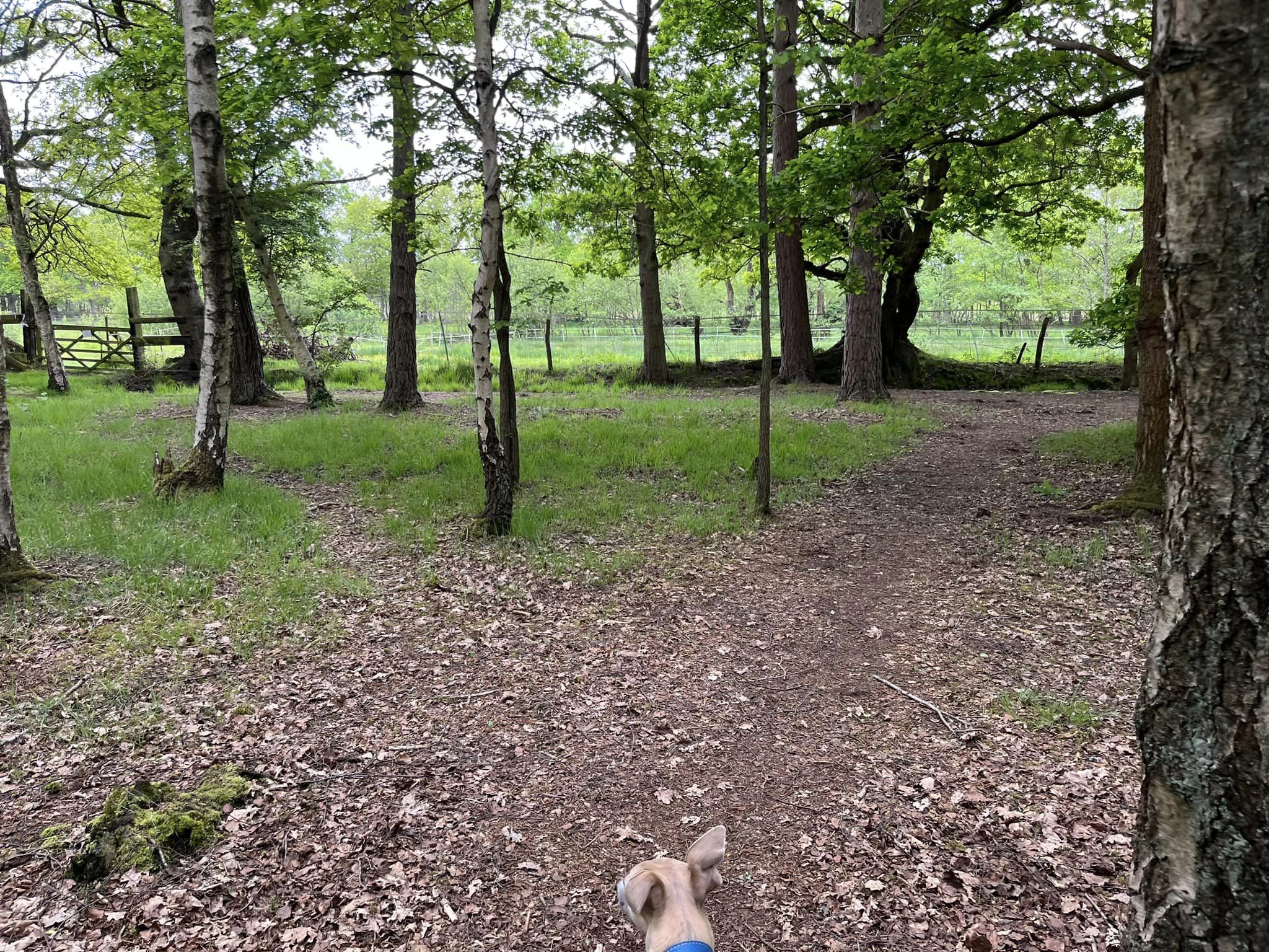 Stay on it and it’ll go back into the trees again and, just after it does, take the next left. Pass a water trough then turn left. Follow the path around to the right and bear right at the post so the large evergreen/fir-type bushes are on your left (ignore the little path that goes off left between the bushes by the post as you go round the corner.)