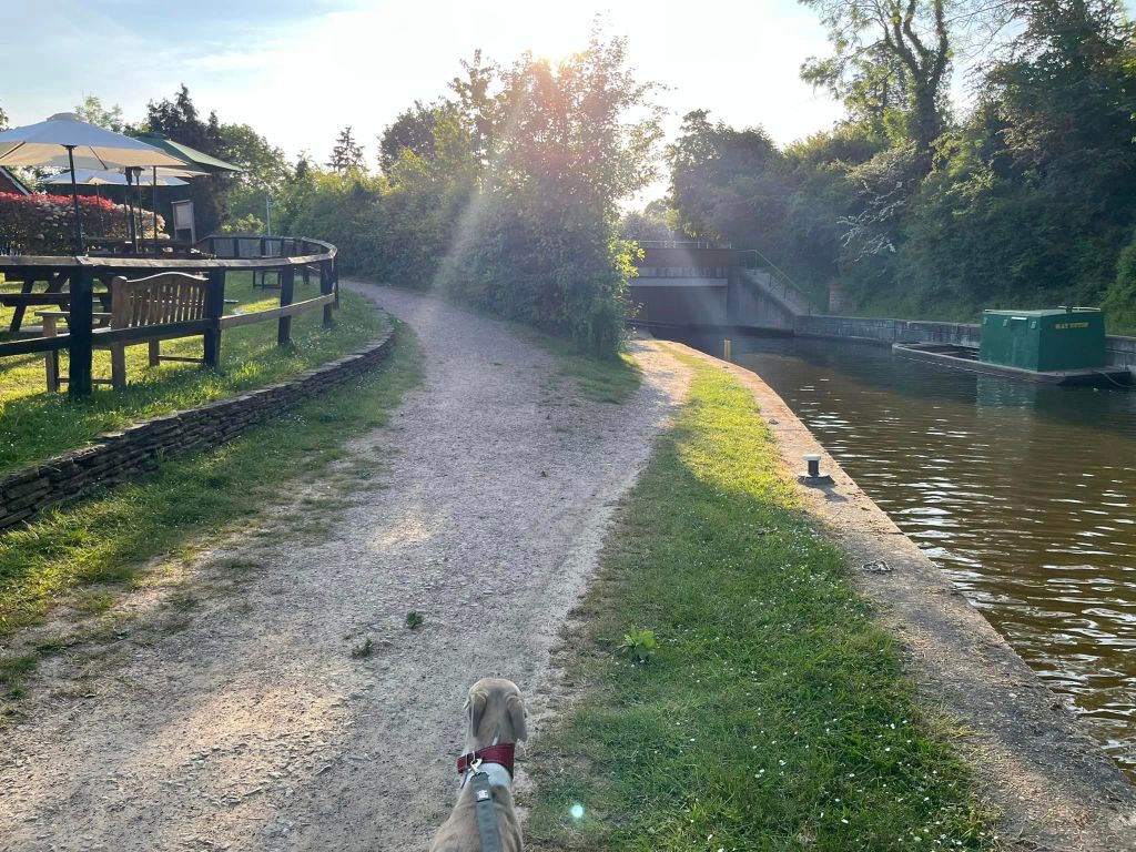Park in the overflow car park of the Onslow Arms pub and Loxwood Canal Centre car park – the access drive is down the side of the pub building, passing the canal centre. The pub has a lovely canal-side garden, which is dog friendly as is the pub’s bar area.