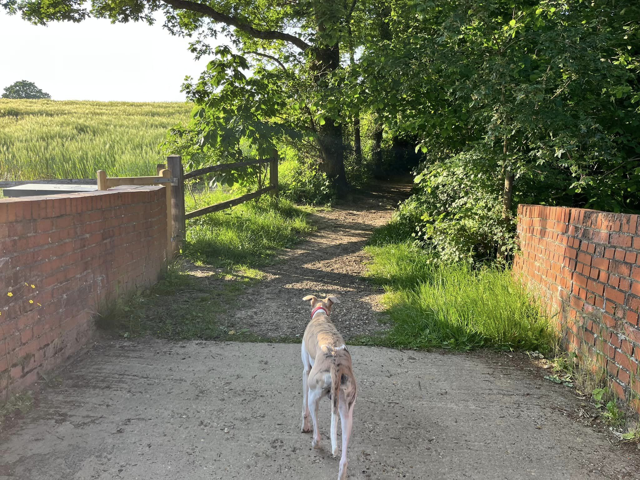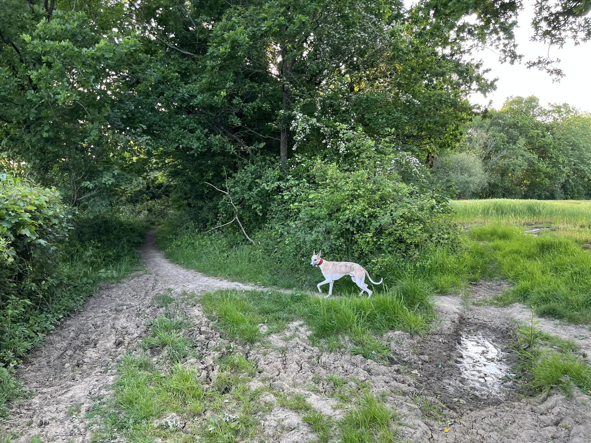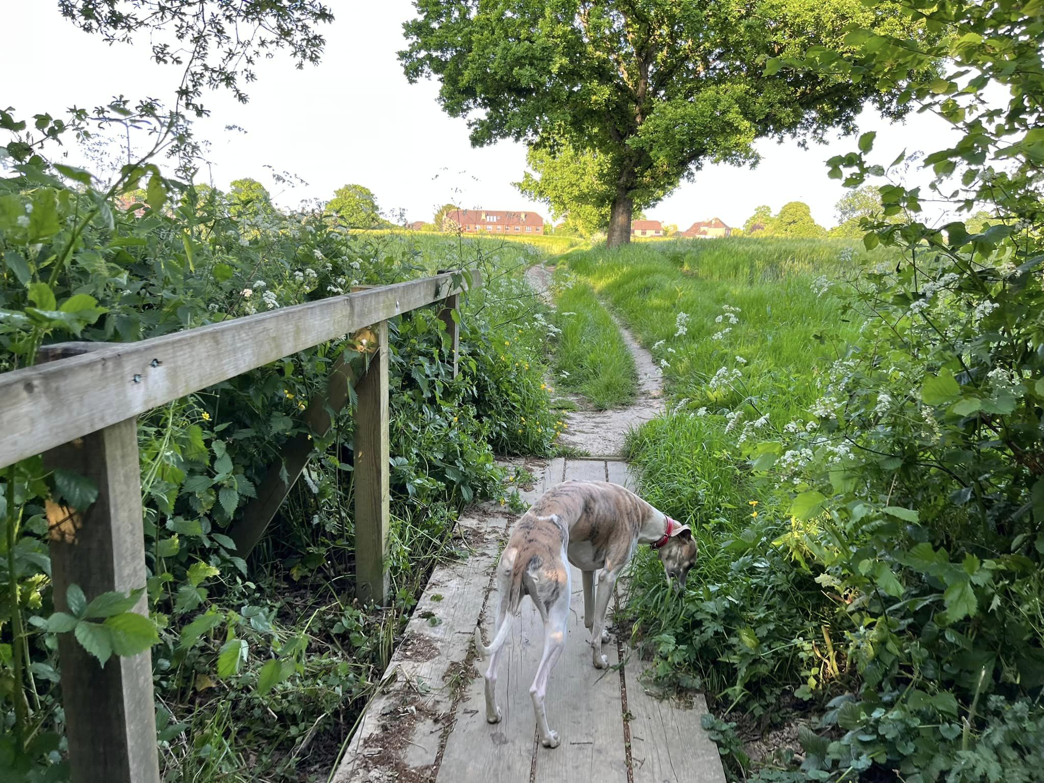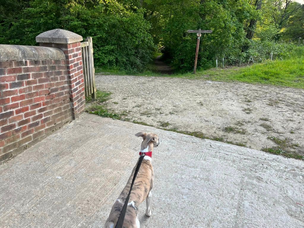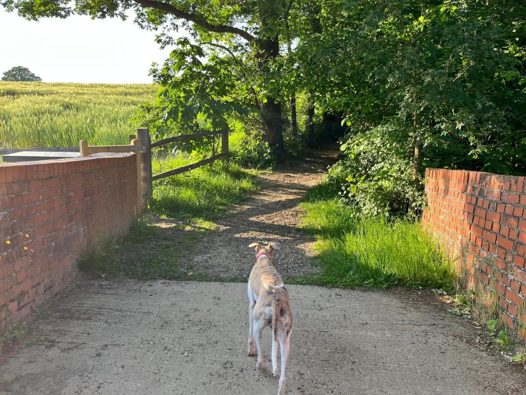 Ignore a small plank bridge to the left (it leads to a stile, unfortunately – the meadow behind said stile is really lovely and whippets can manage it but larger sighthounds cannot.) Follow this narrow path all the way to the cross paths and turn left. This is the Sussex Border Path. Follow this straight and it’ll bring you to a bridge.