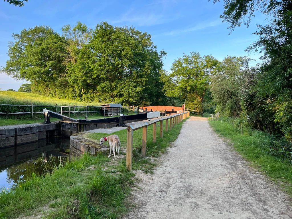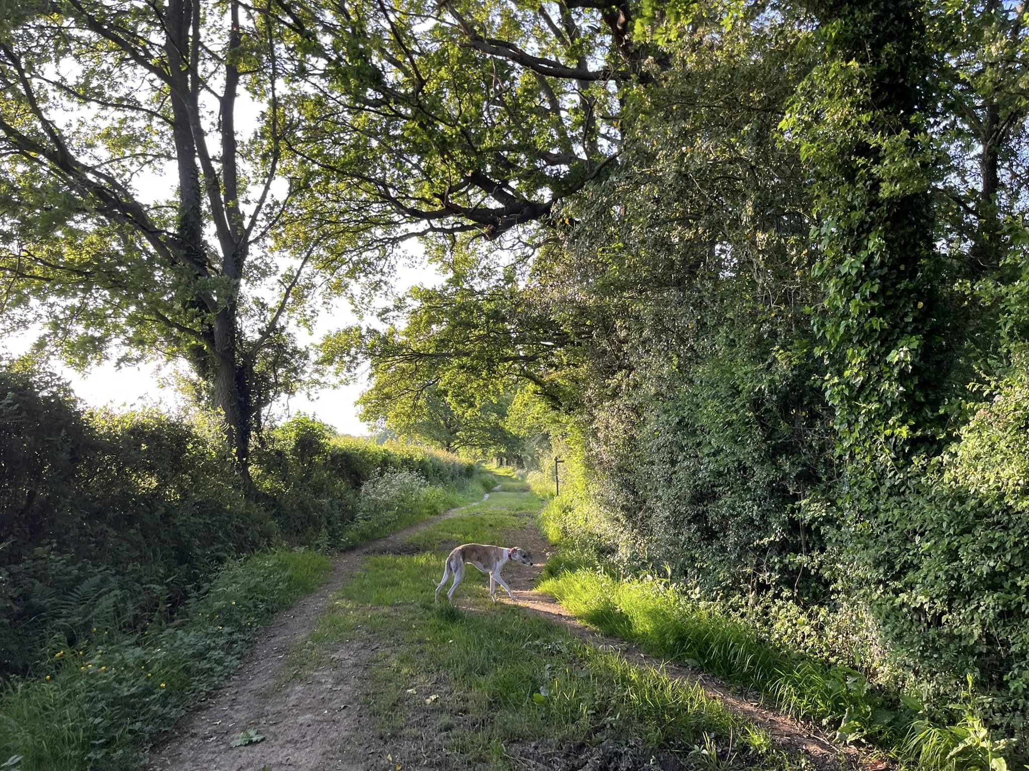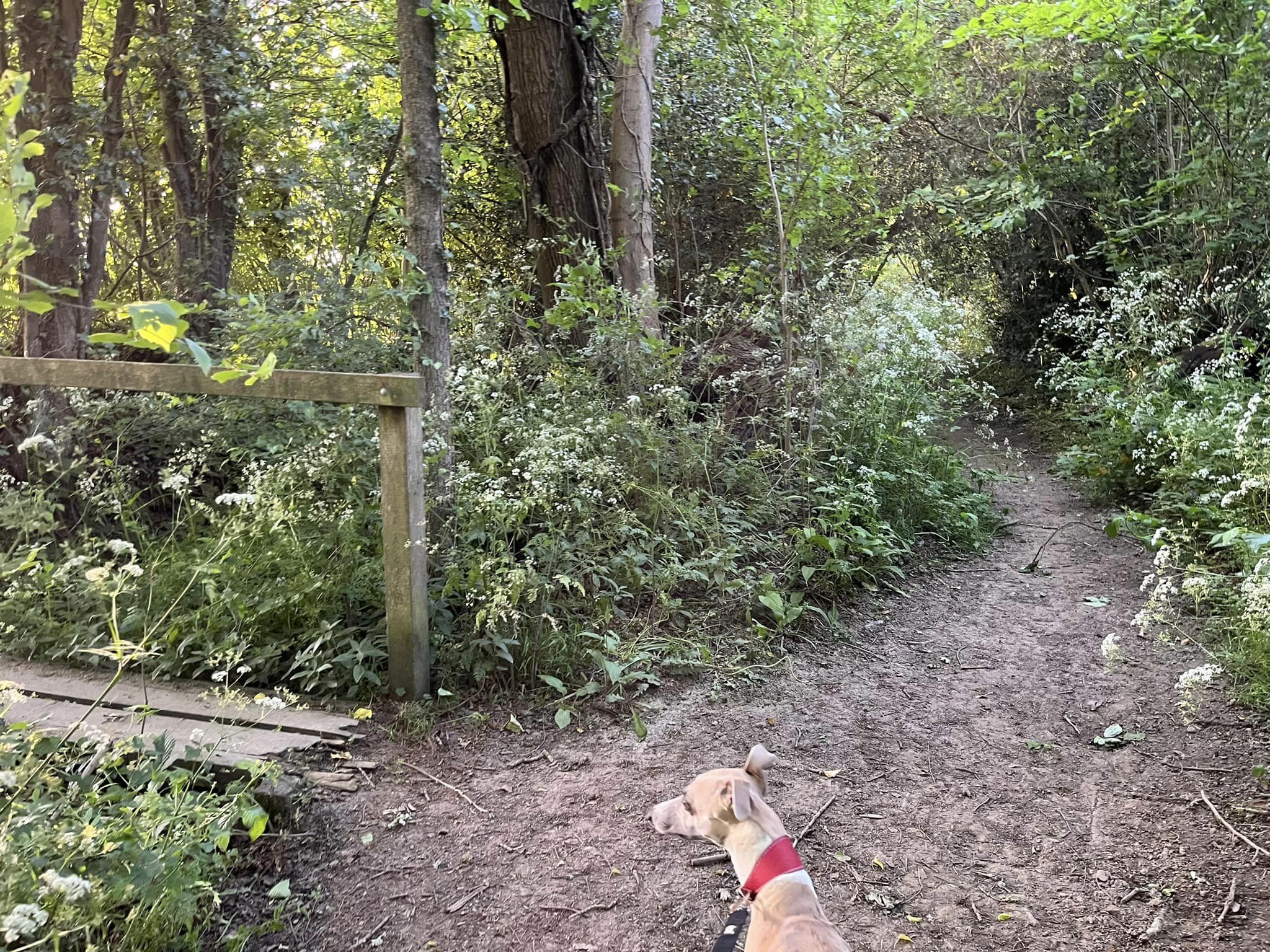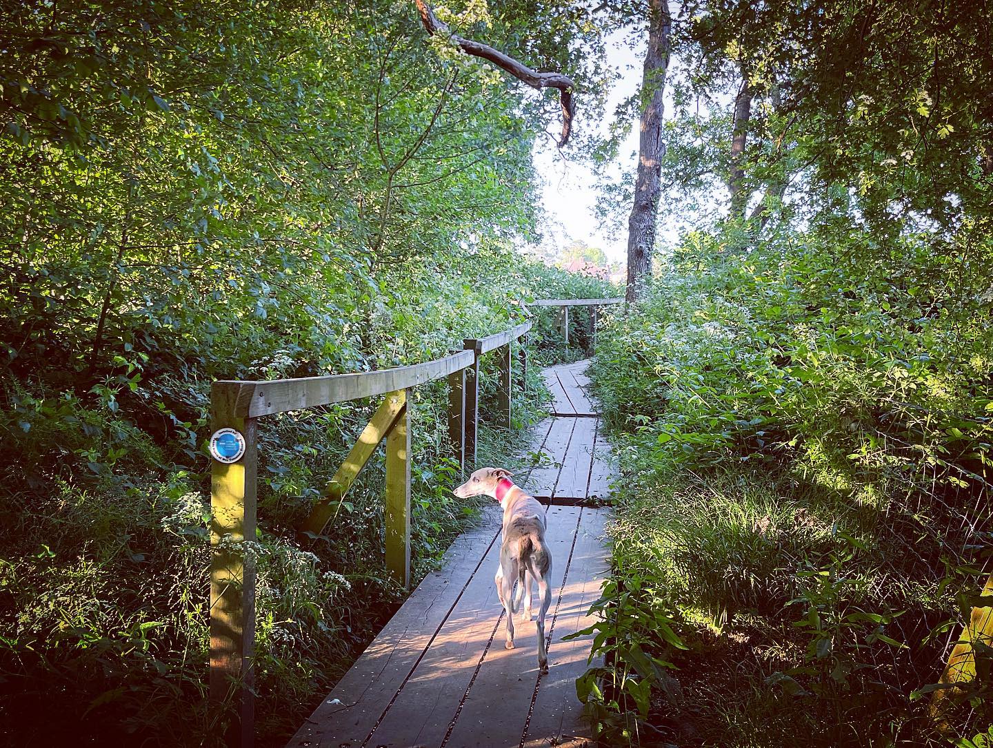 Ignore a small plank bridge to the left (it leads to a stile, unfortunately – the meadow behind said stile is really lovely and whippets can manage it but larger sighthounds cannot.) Follow this narrow path all the way to the cross paths and turn left. This is the Sussex Border Path. Follow this straight and it’ll bring you to a bridge.