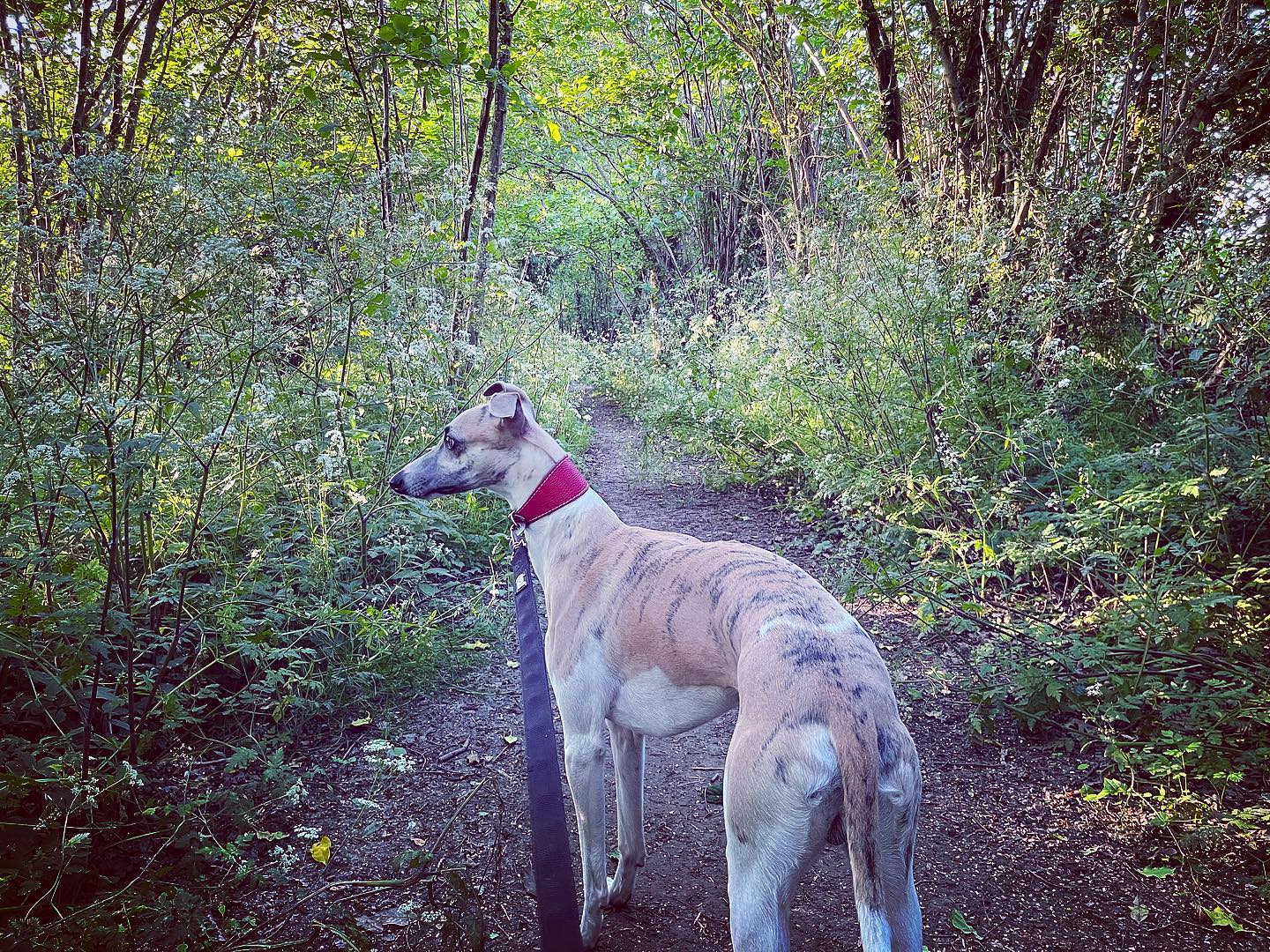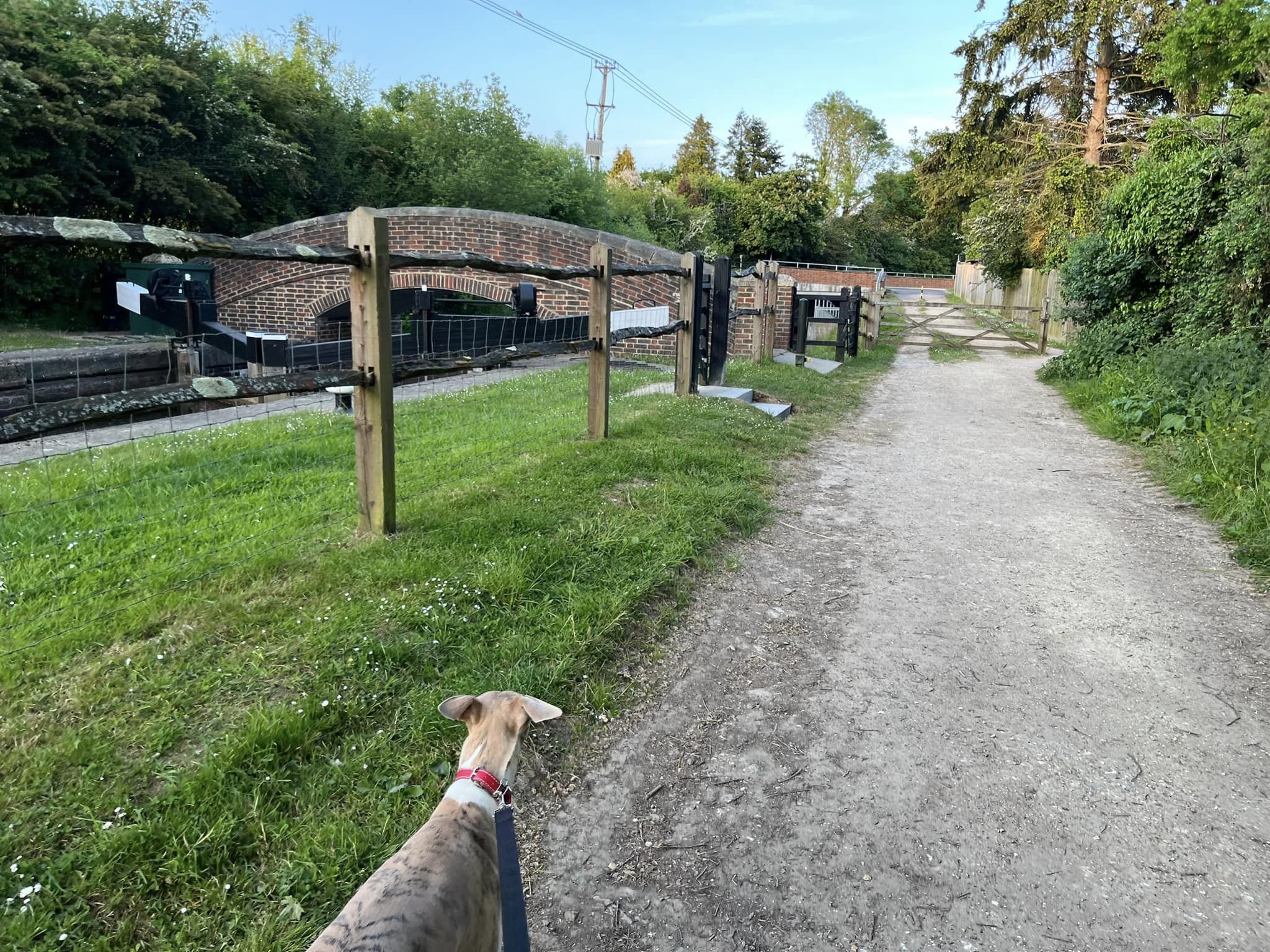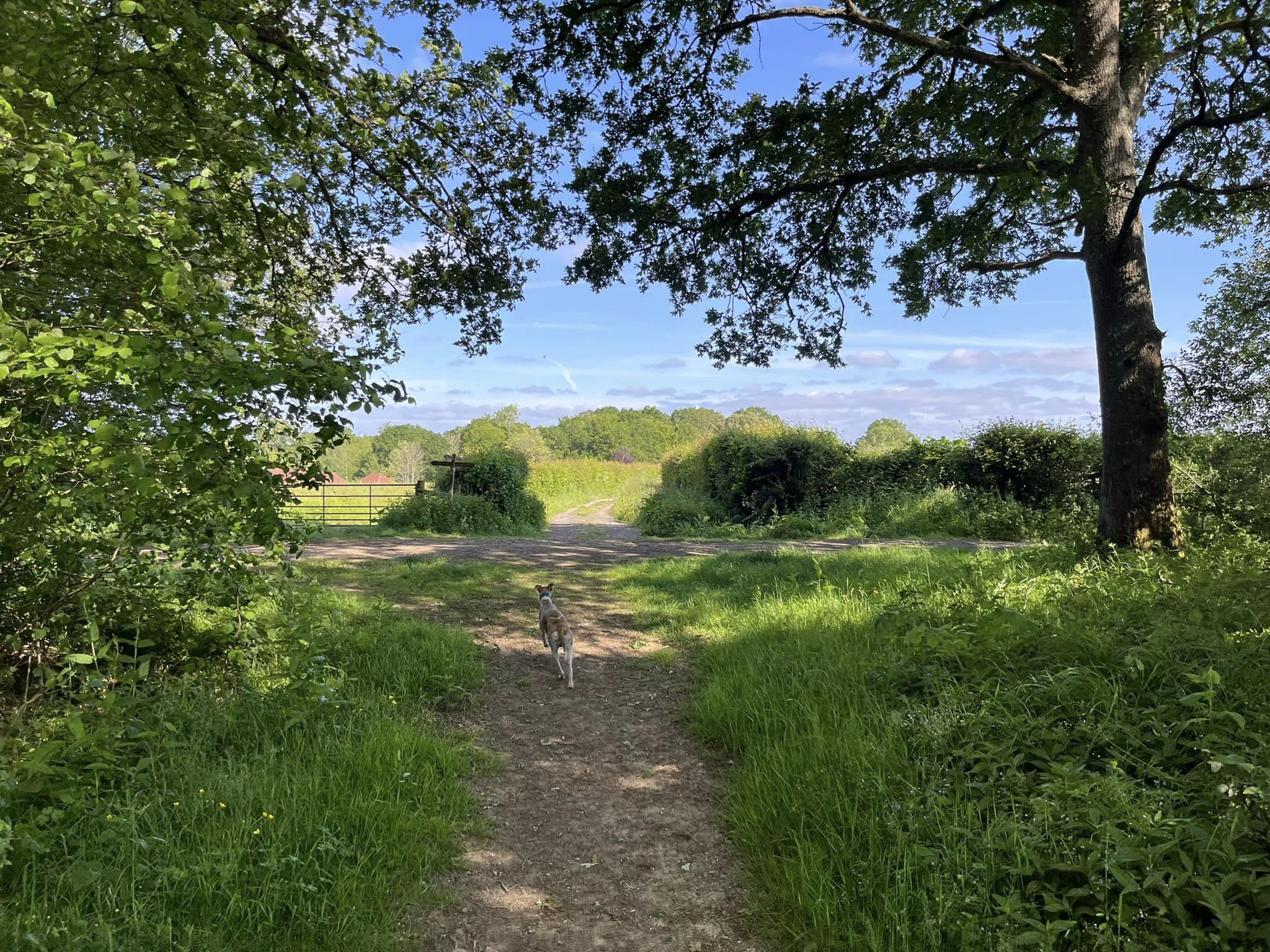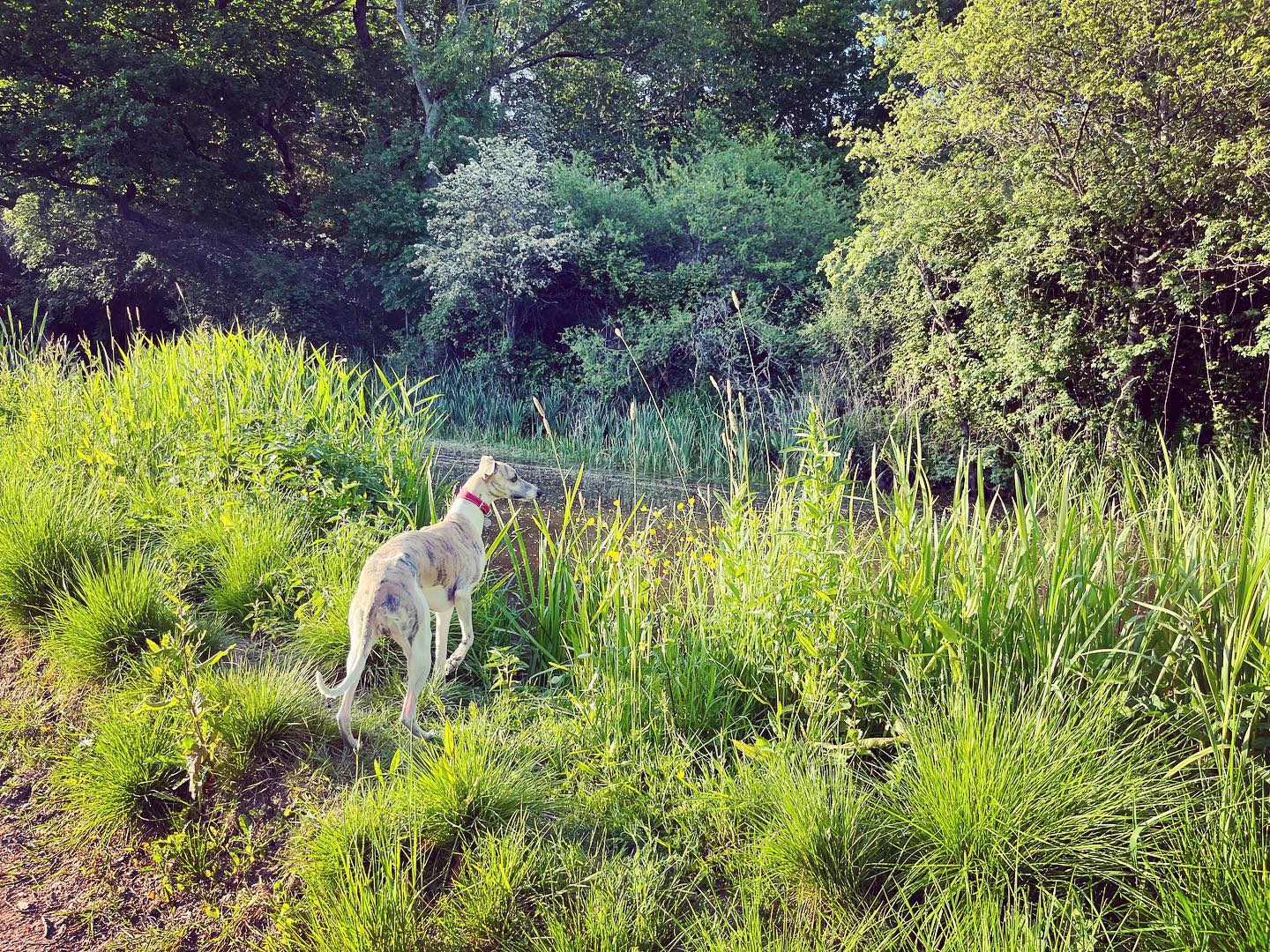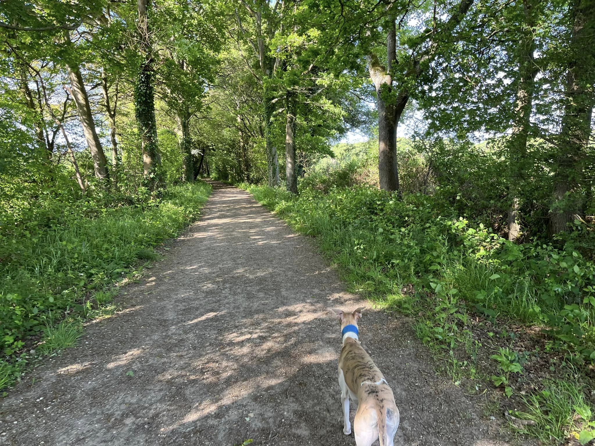 Ignore a small plank bridge to the left (it leads to a stile, unfortunately – the meadow behind said stile is really lovely and whippets can manage it but larger sighthounds cannot.) Follow this narrow path all the way to the cross paths and turn left. This is the Sussex Border Path. Follow this straight and it’ll bring you to a bridge.