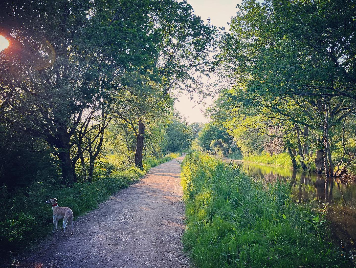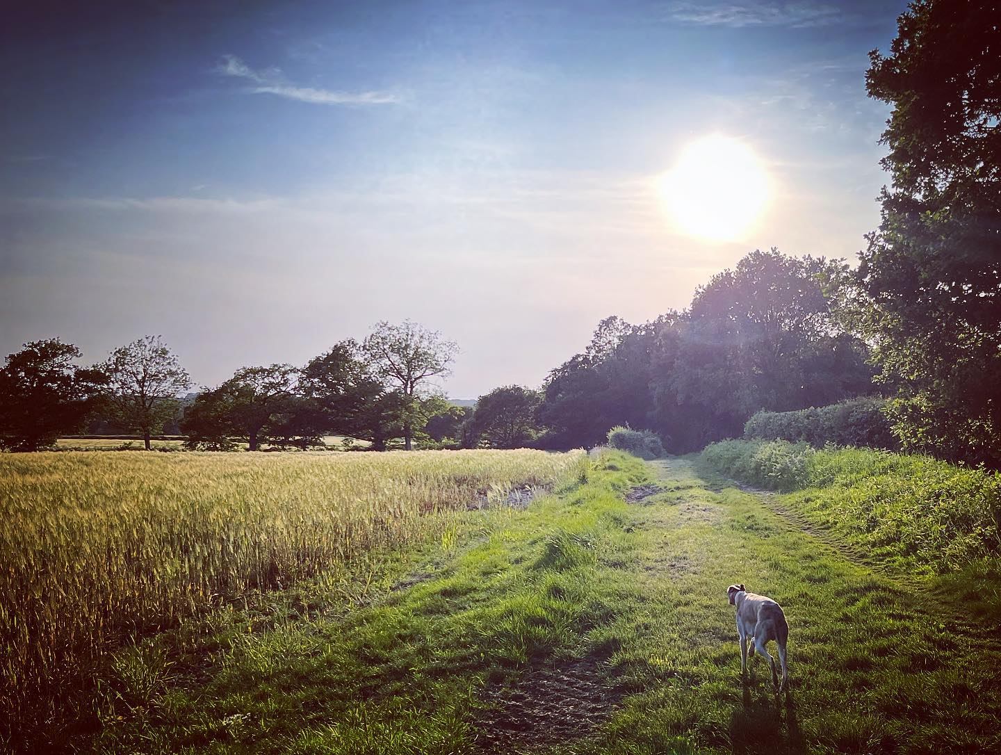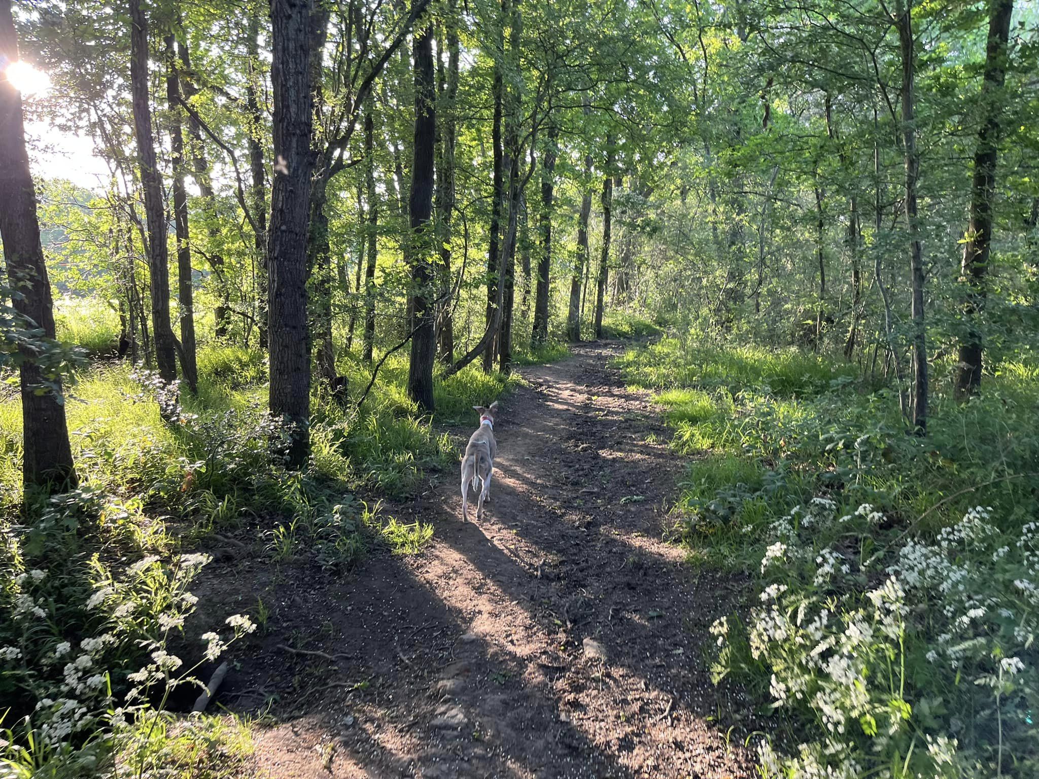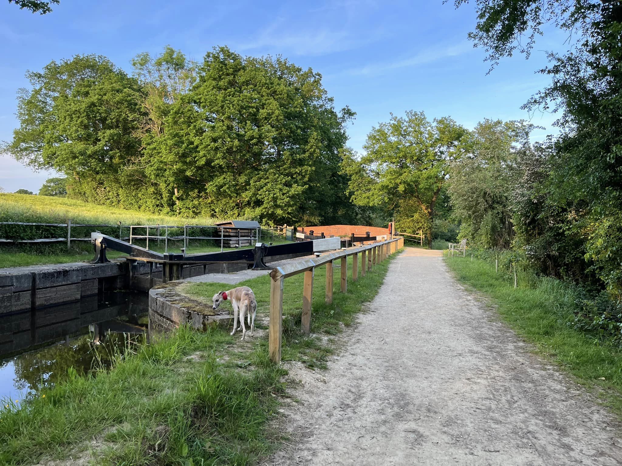 Ignore a small plank bridge to the left (it leads to a stile, unfortunately – the meadow behind said stile is really lovely and whippets can manage it but larger sighthounds cannot.) Follow this narrow path all the way to the cross paths and turn left. This is the Sussex Border Path. Follow this straight and it’ll bring you to a bridge.